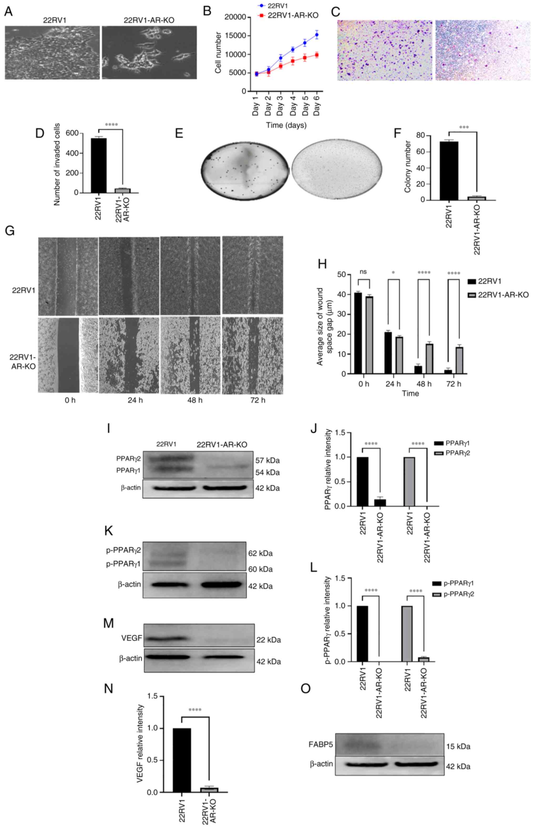 Figure 3Effect of AR-KO on the malignant characteristics of 22RV1 cells and on levels of the down-stream proteins of the FABP5 signalling pathway. (A) Microscopical appearances of 22RV1 and 22RV1-AR-KO. (B) Effect of AR-KO on proliferation of 22RV1 and 22RV1-AR-KO cells. (C) Effect of AR-KO on 22RV1 cell invasion. (D) Average number of invasive cells from 22RV1 and 22RV1-AR-KO cells. (E) Effect of AR knockout on anchorage-independent growth of 22RV1 cells. (F) Relative numbers of colonies formed in soft agar by 22RV1 and 22RV1-AR-KO cells. (G) Effect of AR-KO on gap closure of 22RV1 and 22RV1-AR-KO cells. (H) Quantitative assessment of average sizes of the wound space or gap in 22RV1 and 22RV1-AR-KO cells in μm at different times. (I) Western blot analysis of PPARγ1 and PPARγ2 in 22RV1 and 22RV1-AR-KO cells. (J) Relative levels of PPARγ1 and PPARγ2 in 22RV1 and 22RV1-AR-KO cells. (K) Western blot analysis of pPPARγ1 and pPPARγ2 in 22RV1 and 22RV1-AR-KO cells. (L) Quantitative assessment of levels of pPPARγ1 and pPPARγ2 proteins. Levels of pPPARγ1 and pPPARγ2 in 22RV1 were set at '1', and the levels in 22RV1AR-KO cells were obtained by comparing with those in 22RV1. (M) Western blot analysis of VEGF in 22RV1 and 22RV1-AR-KO cells. (N) Relative levels of VEGF in 22RV1 and 22RV1-AR-KO cells. The level of VEGF in 22RV1 cells was set at '1', and that in 22RV1-AR-KO cells was obtained by comparing with that in 22RV1. (O) Western blot detection of FABP5 protein in 22RV1 and 22RV1-AR-KO cells (no quantification was made, since the level in 22RV1-FABP5-KO cells was negligible). The protein relative levels were reproduced independently three times, and the differences were assessed by Student's t-test. *P<0.05, ***P<0.0001 and ****P<0.00001. KO, knockout; FABP5, fatty acid-binding protein 5; AR, androgen receptor; PPARγ, peroxisome proliferator-activated receptor-γ; pPPARγ, phosphorylated PPARγ; VEGF, vascular endothelium growth factor; ns, not statistically significant. |