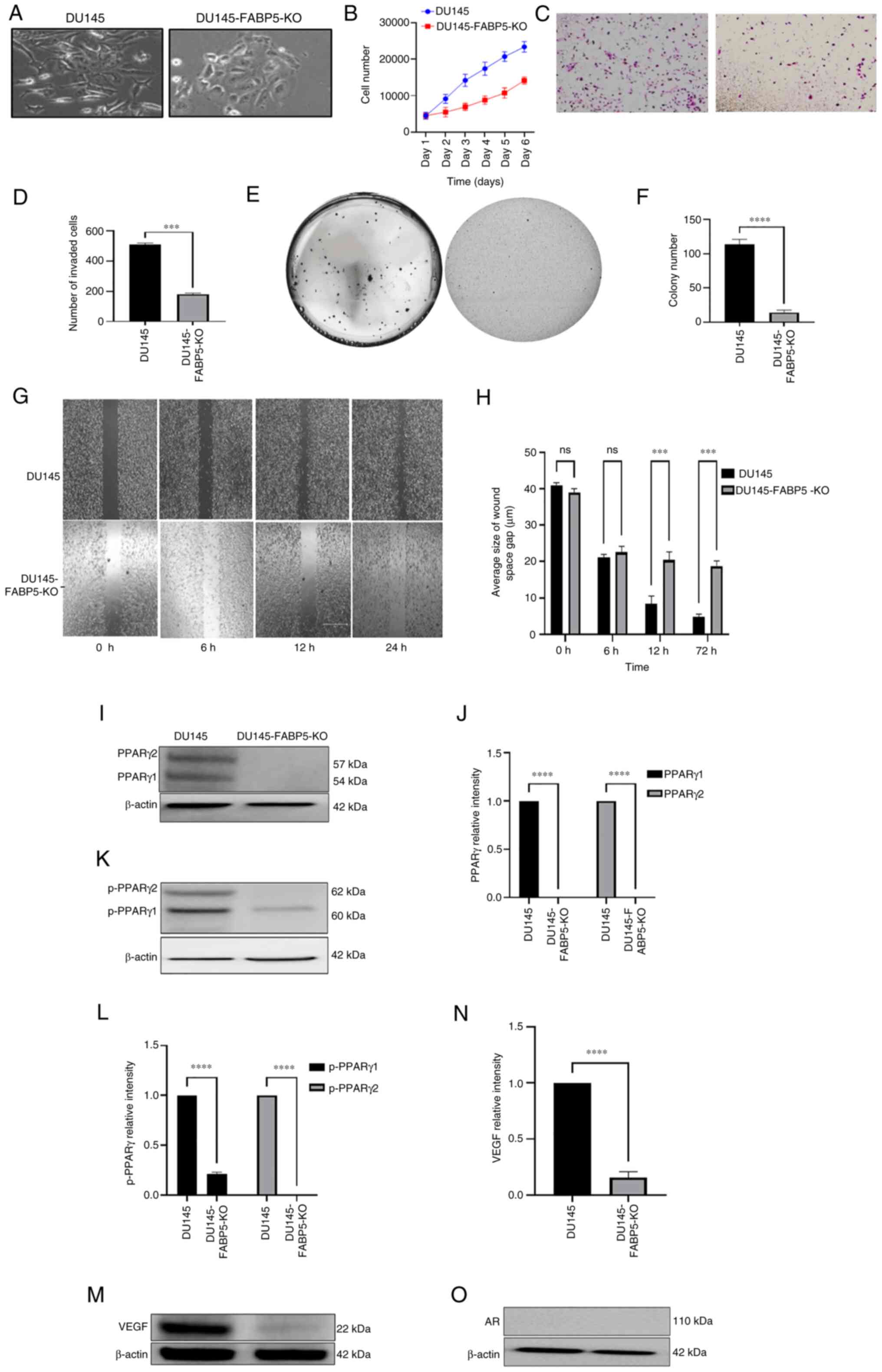 Figure 4Effect of FABP5-KO on the malignant characteristics of DU145 and on protein levels of the downstream proteins of the FABP5 pathway. (A) Microscopical appearances revealed morphological difference between DU145 and DU145-FABP5-KO cells. (B) Effect of FABP5-KO on the proliferation of DU145 cells. (C) Effect of FABP5-KO on DU145 cell invasion was assessed by an invasion assay, and (D) the average number of invasive cells from DU145 and DU145-FABP5-KO cells were recorded. (E) Anchorage-independent growth of DU145 and DU145-FABP5-KO cells, and (F) their average colony numbers formed in soft agar. (G) Effect of FABP5-KO on migration was assessed at different times in a gap closure assay. (H) The quantitative assessment of the average size of wound space gap at different times. (I) Western blot analysis of PPARγ1 and PPARγ2 proteins. (J) Relative levels of PPARγ1 and PPARγ2 in DU145 and DU145-FABP5-KO cells. (K) Western blots were performed for pPPARγ1 and pPPARγ2 in DU145 and DU145-FABP5-KO cells. (L) Relative levels of pPPARγ1 and pPPARγ2. Levels of pPPARγ1 and pPPARγ2 in DU145 cells were each set at '1', and the levels in DU145-FABP5-KO cells were obtained by comparing with those in DU145. (M) Western blot analysis of VEGF protein in DU145 and DU145-FABP5-KO cells. (N) Relative levels of VEGF in DU145 and DU145-FABP5-KO cells; the level of VEGF in DU145 cells was set at '1', and the level in DU145-FABP5-KO cells was obtained by comparing with that in DU145. (O) Western blot analysis of ARFL and ARV7 proteins in DU145 and DU145-FABP5-KO cells. Since neither of the proteins were detectable in either cell line, no quantification was possible. The relative protein levels were reproduced independently three times, and the differences were assessed by Student's t-test. ***P<0.0001 and ****P<0.00001. KO, knockout; FABP5, fatty acid-binding protein 5; AR, androgen receptor; ARFL, full-length AR; ARV7, AR splicing variant 7; PPARγ, peroxisome proliferator-activated receptor-γ; pPPARγ, phosphorylated PPARγ; VEGF, vascular endothelium growth factor; ns, not statistically significant. |