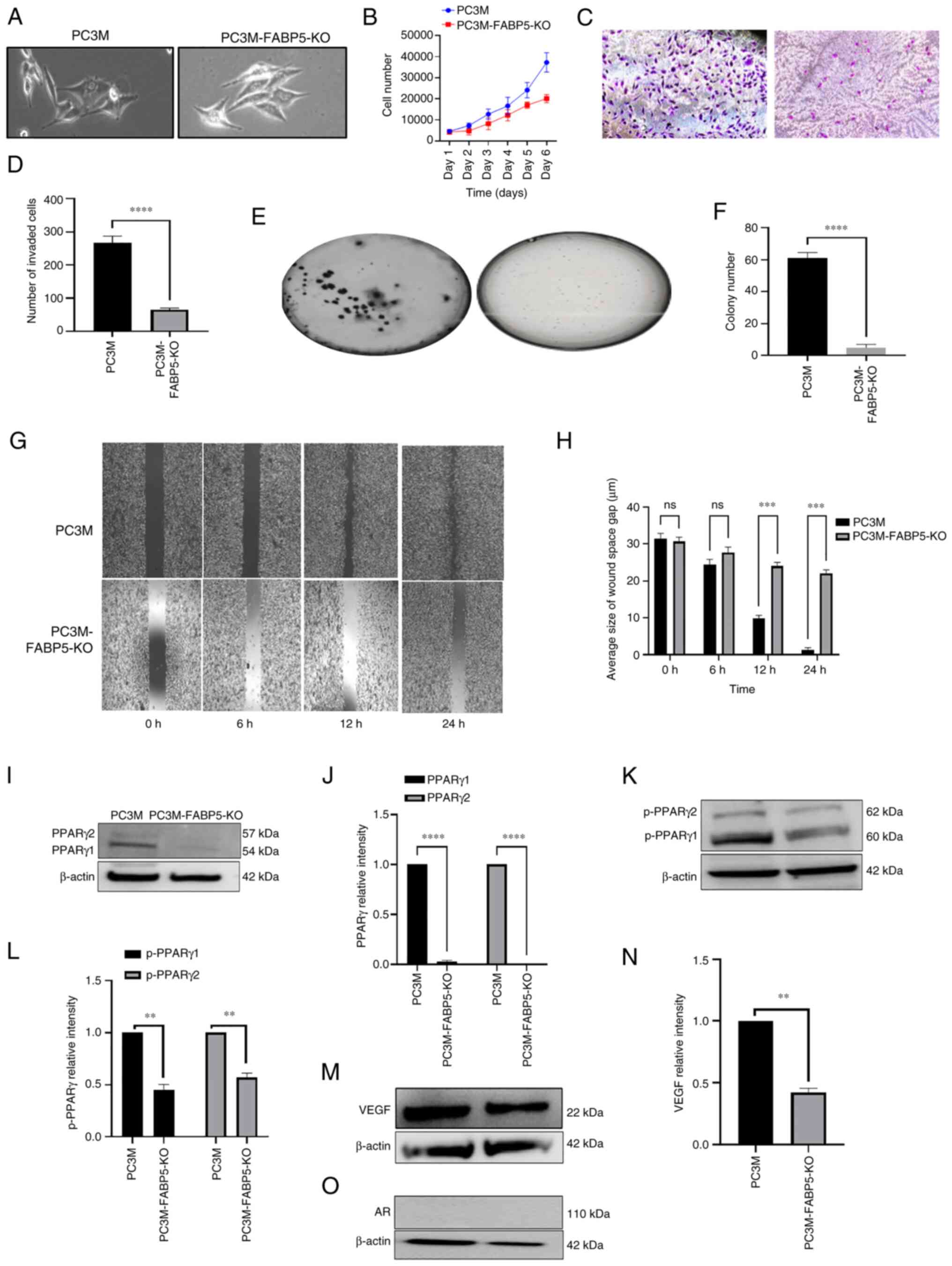 Figure 5Effect of FABP5-KO on malignant characteristics of PC3M and on levels of the downstream proteins of the FABP5 signalling pathway. (A) Microscopical images of PC3M and PC3M-FABP5-KO cells. (B) Proliferation rates of PC3M and PC3M-FABP5-KO cells over the course of the 6-day experimental period. (C) Images of invasive cells from PC3M and PC3M-FABP5-KO at the end of the 6-day experimental period. (D) The average numbers of invasive cells from PC3M and PC3M-FABP5-KO cells. (E) Images of colonies in soft agar formed by PC3M and PC3M-FABP5-KO cells. (F) Average numbers of colonies in soft agar formed by PC3M and PC3M-FABP5-KO cells. (G) Images of wounds in PC3M and PC3M-FABP5-KO cells at the different times. (H) Quantitative assessment of the average size of wound space gap (μm) in PC3M and PC3M-FABP5-KO cells. (I) Western blot analysis of PPARγ1 and PPARγ2 in PC3M and PC3M-FABP5-KO cells. (J) Relative levels of PPARγ1 and PPARγ2. Levels of PPARγ1 and PPARγ2 in PC3M were each set at '1', and the levels in PC3M-FABP5-KO cells were obtained by comparing with those in PC3M. (K) Western blots of pPPARγ1 and pPPARγ2 in PC3M and PC3M-FABP5-KO cells. (L) Relative levels of pPPARγ1 and pPPARγ2. Levels of pPPARγ1 and pPPARγ2 in PC3M cells were each set at '1', and the levels in PC3M-FABP5-KO cells were obtained by comparing with those in PC3M. (M) Western blot analysis of VEGF in PC3M and PC3M-FABP5-KO cells was performed. (N) The relative level of VEGF. The level of VEGF in PC3M cells was set at '1', and the level of VEGF in the PC3M-FABP5-KO cells was obtained by comparing with that in the PC3M cells. (O) Western blot analysis of ARFL and ARV7 in the PC3M and PC3M-FABP5-KO cells. Since only ARFL was present, and no ARV7 was detected, no quantification of the data was possible. The relative protein levels were reproduced independently three times, and the differences were assessed by Student's t-test. **P<0.001, ***P<0.0001 and ****P<0.00001. KO, knockout; FABP5, fatty acid-binding protein 5; AR, androgen receptor; ARFL, full-length AR; ARV7, AR splicing variant 7; PPARγ, peroxisome proliferator-activated receptor-γ; pPPARγ, phosphorylated PPARγ; VEGF, vascular endothelium growth factor; ns, not statistically significant. |