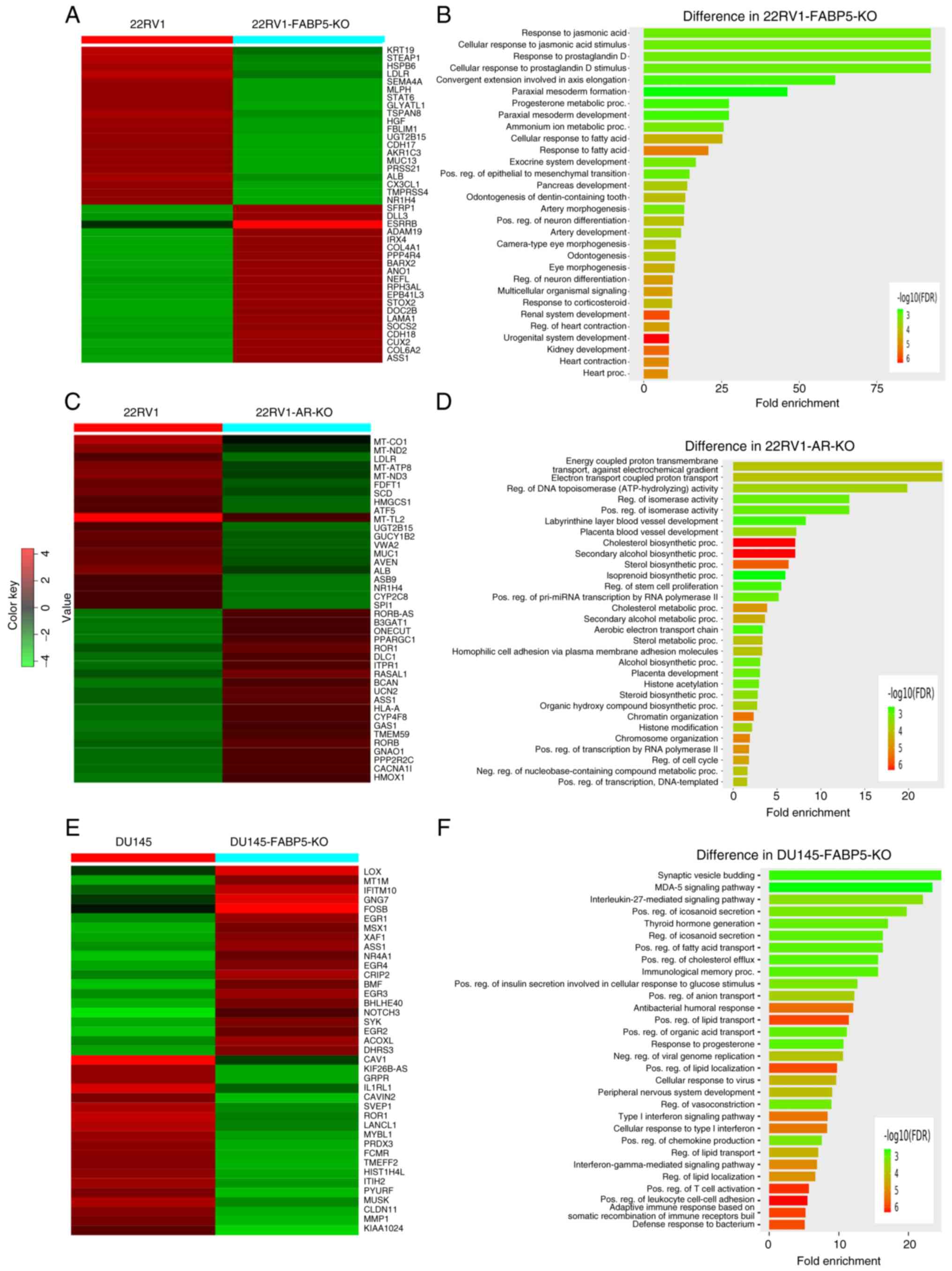 DEGs between the control cells and their FABP5- or AR-KO derivatives and relevant pathways are shown in Fig. 6. Based on an analysis of microarray heatmaps, the top 40 (top 20 up- and 20 downregulated) most significant DEGs comparing between the 22RV1 and 22RV1-FABP5-KO cells, between the 22RV1 and 22RV-AR-KO cells, and between the DU145 and DU145-FABP5-KO cells, are demonstrated in Fig. 6A, C and E, respectively. Their IDs, names, levels of differences (log2 fold changes), and the significance levels (P-values) of the changes are shown in Tables SIII-SV. Enrichment bar-chart analysis revealed numerous pathways associated with these DEGs caused by the FABP5- and AR-KOs, as shown in Fig. 6B, D and F and in Tables SVI-SVIII These pathways are involved in cellular response to fatty acids, cholesterol biosynthesis, steroid hormone synthesis, and hormone responses. The DEGs that were identified comparing between the 22RV1 and 22RV1-FABP5-KO cells, caused by FABP5-KO, were associated with processes such as cellular responses to fatty acids, prostaglandin D stimulus, and progesterone and corticosteroid metabolism. The majority of them were involved in the fatty acid response pathway. Therefore, as revealed in Fig. 6B, both the steroid metabolic processes and hormone-responsive pathways could be blocked by FABP5-KO in the 22RV1 cells. The DEGs comparing between 22RV1 and 22RV1-AR-KO cells, as demonstrated in Fig. 6D, were associated with cholesterol biosynthesis, and sterol hormone synthesis and metabolism. Finally, the DEGs comparing between DU145 and DU145-FABP5-KO cells (Fig. 6F) were associated with such processes as positive regulation of lipid transport and localization, positive regulation of fatty acid transport and cholesterol efflux, as well as the response to progesterone. The majority of these DEGs are involved in lipid and fatty acid transport and metabolic pathways, and also in the regulation of cholesterol hormone responses.
