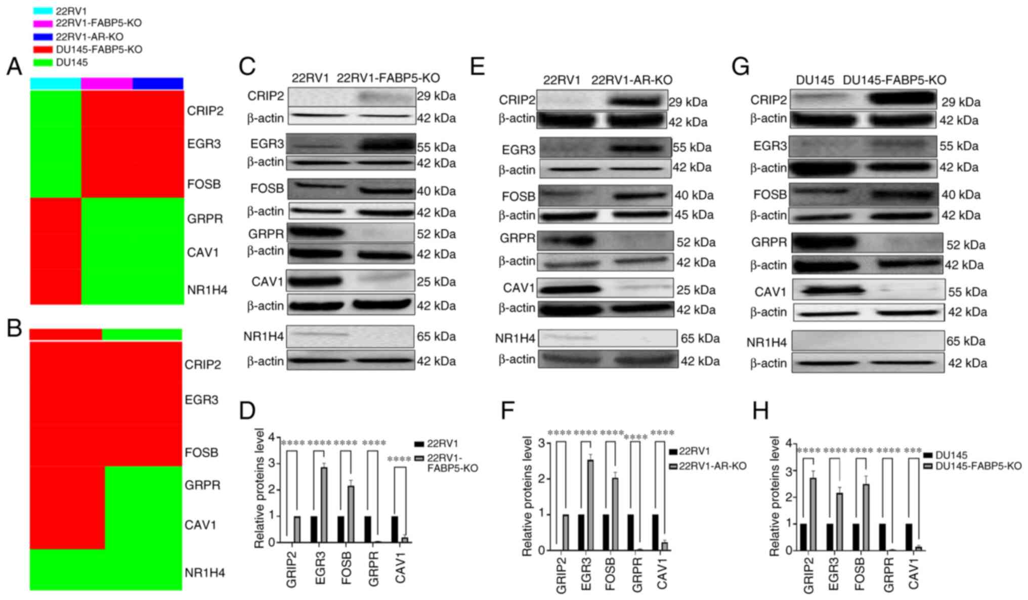 Figure 7Identification and verification of the six most prominent DEGs between 22RV1 cells and their FABP5- or AR-KO derivatives, and between DU145 and DU145-FABP5-KO cells. (A) The top 6 DEGs between 22RV1 and 22RV1-FABP5-KO cells, or between 22RV1 and 22RV1-AR-KO cells (cells are represented by different colors), as identified by heatmap analysis. (B) The top 6 DEGs between DU145 and DU145-FABP5-KO cells identified by heatmap analysis. (C) Western blot verification of the top 3 up- and down-regulated DEGs between 22RV1 and 22RV1-FABP5-KO cells. (D) Relative levels of the top 3 up- and down-regulated DEGs between 22RV1 and 22RV1-FABP5-KO cells. (E) Western blot verification of the top 3 up- and down-regulated DEGs between 22RV1 and 22RV1-AR-KO cells. (F) Relative levels of the top 3 up- and down-regulated DEGs between 22RV1 and 22RV1-AR-KO cells. (G) Western blot verification of the top 3 up- and down-regulated DEGs between DU145 and DU145-FABP5-KO cells. (H) Relative levels of the top 3 up- and down-regulated DEGs between DU145 and DU145-FABP5-KO cells. The relative protein levels were reproduced independently three times, and the differences were assessed by Student's t-test. ***P<0.0001 and ****P<0.00001. DEGs, differentially expressed genes; KO, knockout; FABP5, fatty acid-binding protein 5; AR, androgen receptor; ns, not statistically significant. |