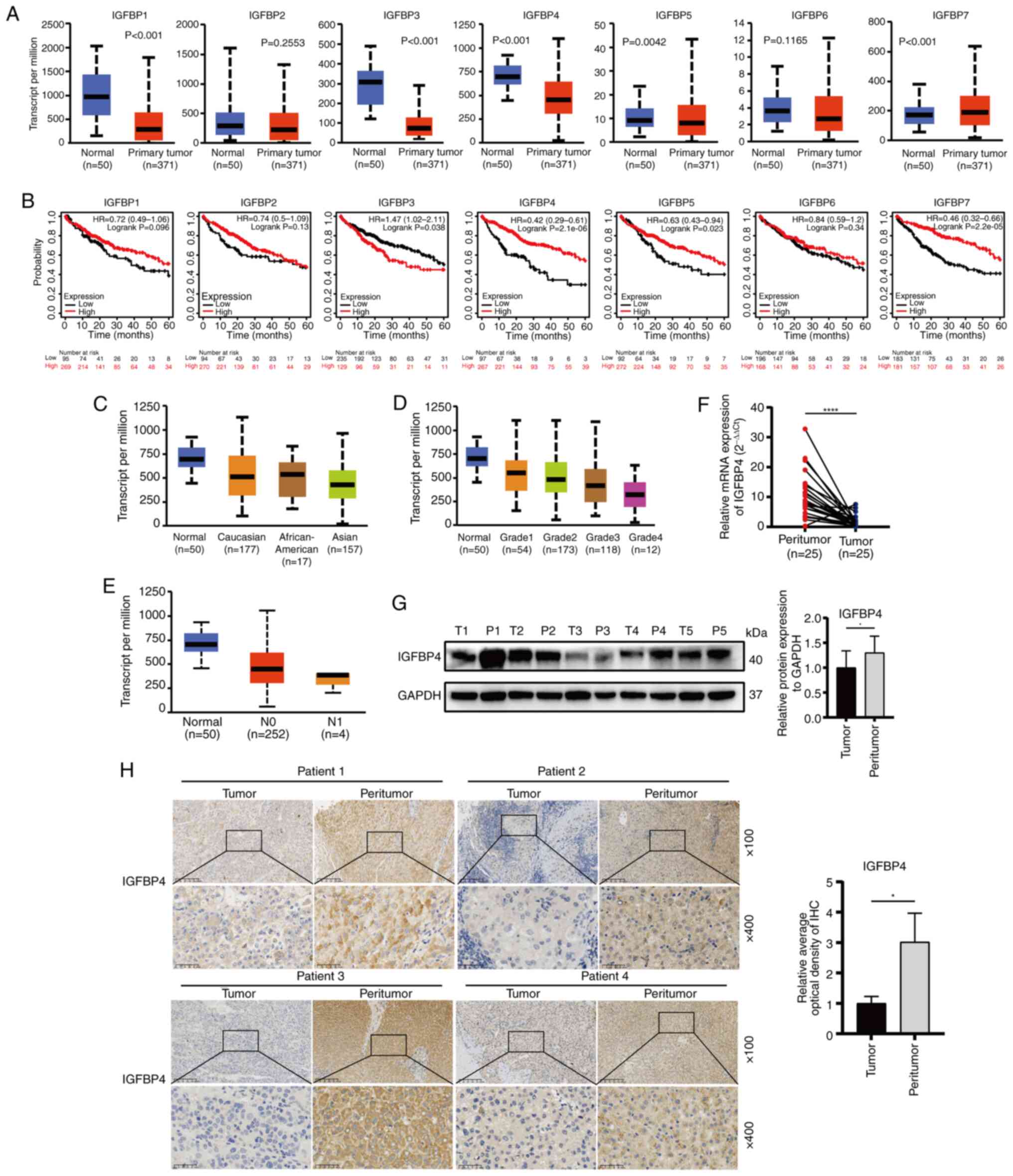 To determine which IGFBP family member may be the key to regulating HCC progression, the IGFBPs family (IGFBP1-7) gene expression was first analyzed using TCGA-LIHC datasets. The results showed that the IGFBP1 (P<0.001), IGFBP3 (P<0.001), IGFBP4 (P<0.001) and IGFBP5 (P=0.0042) have significantly downregulated expression in liver cancer (Fig. 1A). Kaplan-Meier plotter website was used to predict the single gene expression associated with HCC prognosis, and low expression of IGFBP4 (P=2.1×10−6) and IGFBP7 (P=2.2×10−5) was found; rather, other IGFBP members were significantly correlated with poor prognosis of patients with LIHC (Fig. 1B). Thus, further studies were performed to investigate the role of IGFBP4 in HCC progression. The expression of IGFBP4 was found to be lower in the HCC population compared with the normal population, especially in the Asian population (Fig. 1C). In addition, the expression of IGFBP4 was further reduced in patients with HCC with poor liver tumor grade and lymph node metastasis (Fig. 1D and E). The downregulated expression of IGFBP4 in the clinical tumor specimens of patients with HCC was further validated using RT-qPCR (P<0.0001) and WB (Fig. 1F and G). IHC staining also demonstrated that IGFBP4 expression was lower in HCC tissues compared with that in the matched adjacent normal tissues (Fig. 1H). These data indicated that IGFBP4 was downregulated in HCC and its low expression predicts poor prognosis in patients with HCC.