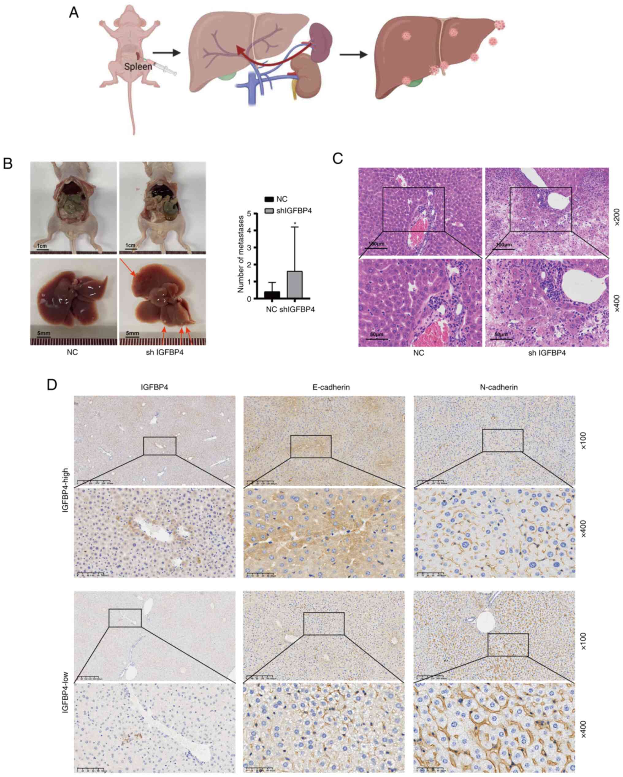 IGFBPs are a family of proteins that bind to IGFs and are usually composed of seven high-affinity IGFBP isoforms, namely IGFBP1 to IGFBP7 (7). IGFBP4, the smallest protein in the IGFBP family (29), is a secreted protein mainly produced by the liver (30). It acts as a transport protein for IGF-I and IGF-II and regulates their biological effects. The levels and expression of IGFBP4 in various tissues are influenced by IGFBP proteinases, multiple growth factors and hormones. The results of the present study suggested that IGFBP4 may play a positive regulatory role in the process of tumor cell metastasis and invasion. Overexpression of IGFBP4 in glioblastoma cells leads to the upregulation of molecules involved in tumor growth (31). Inhibition of IGFBP4 could significantly reduce the invasion and expression of mesenchymal markers in oral squamous cell carcinoma (32). Several studies have found that overexpression of IGFBP4 inhibits the invasiveness of cancer cells, including lung cancer (33), colorectal cancer (34) and breast cancer (9). Previous research has shown that transcriptional activation of IGFBP4 could inhibit the metastasis of liver cancer (35,36). In the present study, the analysis of the TCGA database and clinical samples from patients with HCC showed that IGFBP4 was downregulated in liver cancer. In addition, despite the lack of 5-10 years of survival data which is the limitation in the present study, the five-year survival curve analysis still showed that the high expression of IGFBP4 was associated with favorable prognosis in patients with HCC. EMT was considered one of the key steps in tumor metastasis and invasion. During EMT, tumor cells could lose the adhesive properties of epithelial cells, acquire the motility of mesenchymal cells, and enter other organs through the blood or lymphatic system. In the present study, comprehensive experimental methods such as gap closure experiments and Transwell assays were used to verify that overexpressing IGFBP4 could inhibit the migration ability of HCC in vitro and reduce the tumor metastasis in vivo. It was confirmed that overexpression of IGFBP4 in HCC cells leads to upregulation of the epithelial marker protein E-cadherin, downregulation of the mesenchymal marker protein N-cadherin and the cytoskeletal protein Vimentin.