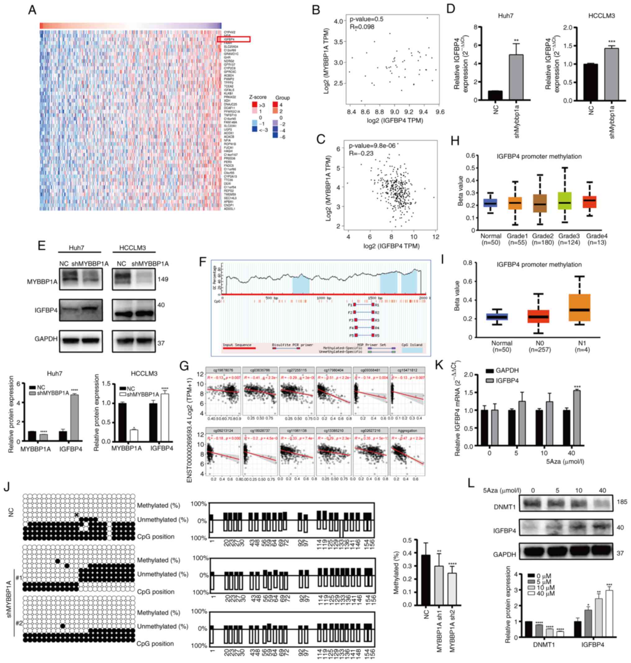 Our previous study had shown that IGFBP5, another important IGFBP family member, could be regulated by MYBBP1A and inhibit the metastasis ability of liver cancer cells (13). Thus, it was hypothesized that IGFBP4 may be regulated by MYBBP1A as well. In order to investigate the relation between MYBBP1A and IGFBP4, though analyzing the data from the TCGA database and GTEx database, it was found that the IGFBP4 gene expression varied obviously when the expression of MYBBP1A was changed (Fig. 5A). At the same time, a correlation analysis between two genes was conducted and it was identified that there was no significant correlation between the expression of MYBBP1A and IGFBP4 in the liver tissue of the normal liver tissue (P=0.5, R=0.098) (Fig. 5B). However, a negative correlation of MYBBP1A and IGFBP4 expression was observed in liver tumor tissues of patients with HCC (P=9.8×10−6, R=-0.23) (Fig. 5C). The experimental results demonstrated that MYBBP1A knockdown resulted in a significant increase in the mRNA and protein expression level of IGFBP4 (Fig. 5D and E). By contrast, after overexpressing MYBBP1A, IGFBP4 decreased in both mRNA and protein levels (Fig. S5A and B). Our previous study (13) reported that MYBBP1A inhibited IGFBP5 transcription by promoting the high methylation level of CpG island at IGFBP5 CDS sites. Then, the Methprimer database was used to predict the methylation sites of IGFBP4 and found that there were CpG islands in the promoter region of IGFBP4 (Fig. 5F). The SMART database was used to analyze the correlation between IGFBP4 methylation and expression and it was found that the expression of IGFBP4 was significantly negatively associated with the methylation in transcription level (Fig. 5G). In addition, a higher level of IGFBP4 promoter methylation was observed in patients with higher tumor grade and stage (Fig. 5H and I). Bisulfite sequencing PCR (BSP) technology was utilized to compare the methylation levels of CpG islands in the IGFBP4 promoter region between the MYBBP1A knocked-down group and the NC group (Fig. 5J). Overall methylation in the IGFBP4 promoter region was decreased in the MYBBP1A knockdown group compared with the control group. More importantly, mRNA levels of IGFBP4 in HCC cells were significantly increased after treatment with DNA methyltransferase inhibitor Decitabine (5-Aza-2′-deoxycytidine) (0, 5, 10 and 40 μmol/l) (Fig. 5K and L). The inhibitory efficiency of 5Aza was verified by detecting the expression of DNMT1 at different concentrations of 5Aza. These results all confirmed that MYBBP1A affects the expression level of IGFBP4 by promoting CpG island methylation of the IGFBP4 promoter region.