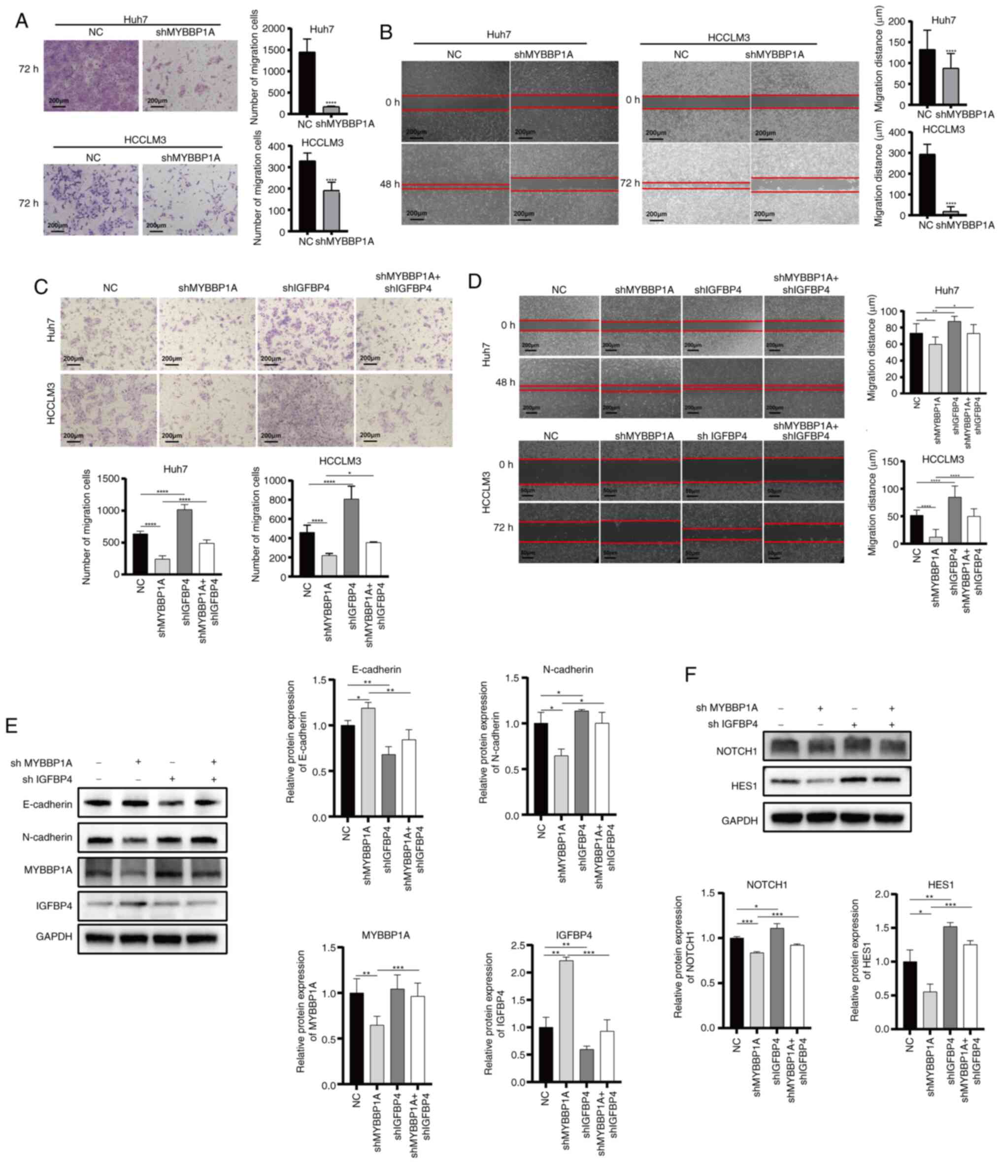 To further confirm our theory, lentivirus-mediated shRNA targeting MYBBP1A was used to construct MYBBP1A-knockdown Huh7 and HCCLM3 cells. Transwell and gap closure assay results demonstrated that knocking down MYBBP1A decreased the migratory activities of liver cancer cells (Fig. 6A and B). Then, the lentivirus-mediated shMYBBP1A and shIGFBP4 were used to co-transfect Huh7 and HCCLM3 cells. The results showed that knocking down MYBBP1A suppressed migration ability while knocking down IGFBP4 restored the migration abilities of liver cancer cells (Fig. 6C and D). Besides, colony formation assays revealed that the proliferation ability of liver cancer cells could also be restored (Fig. S6A and B). Moreover, IGFBP4 knockdown could restore the repressed EMT progression caused by MYBBP1A inhibition. Specifically, inhibition of MYBBP1A increased E-cadherin expression, while knocking down IGFBP4 restricted the increase of E-cadherin. Similarly, MYBBP1A inhibition decreased N-cadherin expression, and knocking down IGFBP4 restored its expression caused by MYBBP1A inhibition (Fig. 6E). As for NOTCH signaling regulation, IGFBP4 knockdown could restore the repressed NOTCH1 and Hes1 expression caused by MYBBP1A inhibition (Fig. 6F). These results demonstrated that IGFBP4 was involved in regulating EMT, cancer metastasis and EMT and NOTCH activation mediated by MYBBP1A in liver cancer.