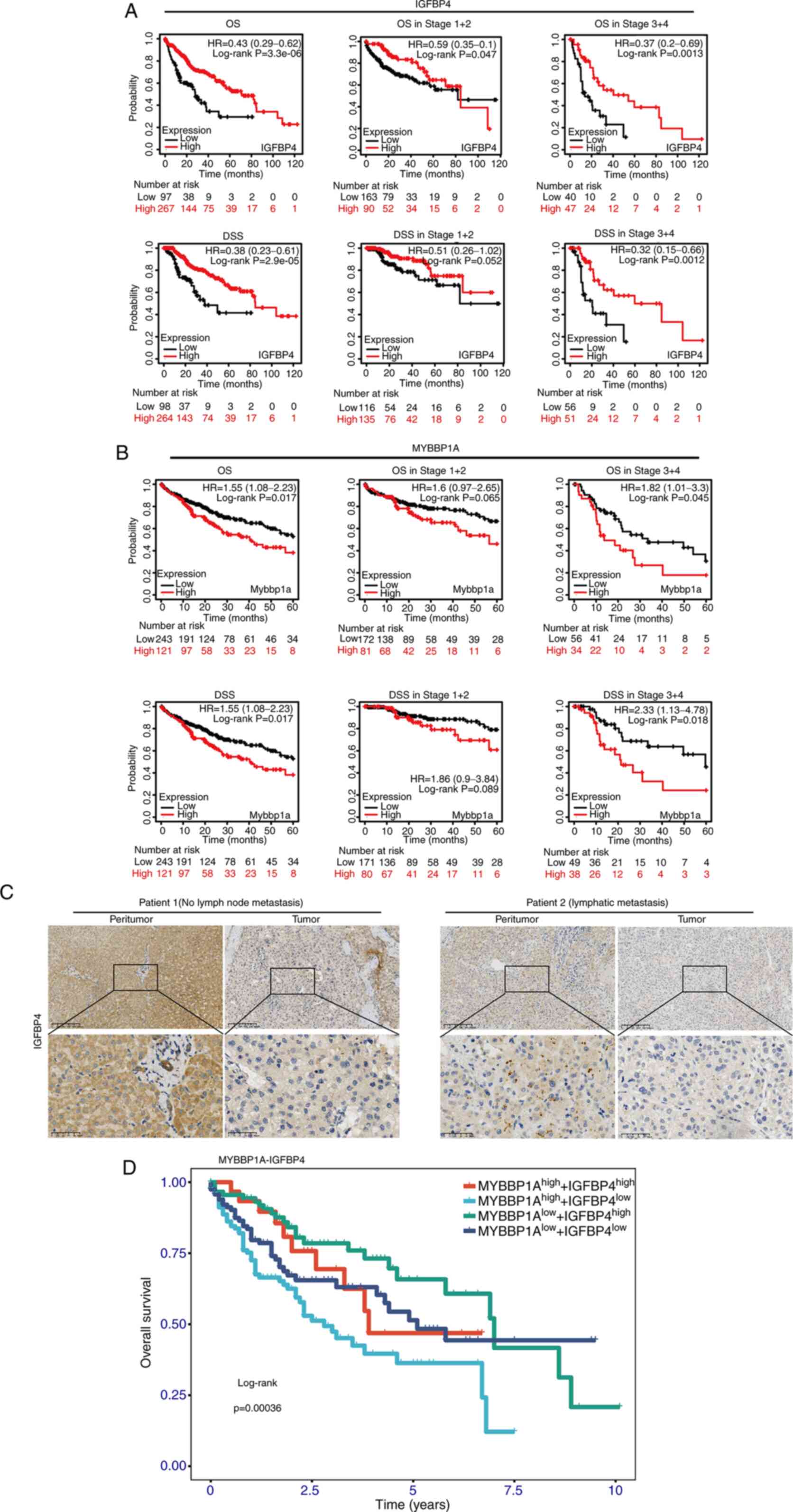 Overall survival (OS) time and disease-specific survival time (DSS) of patients with liver cancer with different IGFBP4 expression groups in different tumor grades and stages were analyzed. The results demonstrated that high expression of IGFBP4 was correlated with longer OS [log-rank P=3.3×10−6, hazard ratio (HR)=0.43] and DSS (log-rank P=2.9×10−5, HR=0.38). This association was statistically significant in late stages (stages III and IV; log-rank P=0.0013 in OS and log-rank P=0.0012 in DSS) but not in early stages (stages I and II; log-rank P=0.047 in OS and log-rank P=0.052 in DSS) in liver cancer (Fig. 7A). Interestingly, the negative correlation between MYBBP1A expression and OS (log-rank P=0.0045) or DSS (log-rank P=0.018) was observed in late stages (stages III and IV) rather than in early stages (stage I and II) in liver cancer (Fig. 7B). IHC staining was performed on tumor and peritumor tissue specimens of patients with liver cancer with different metastatic status in The First Affiliated Hospital of Zhejiang University. The results suggested that IGFBP4 expression levels in the liver tissues of patients with liver cancer were lower than those in normal individuals, and even lower in patients with metastatic liver cancer (Fig. 7C). Then, the survival curves of patients with HCC with MYBBP1AHighIGFBP4Low, MYBBP1AHighIGFBP4High, MYBBP1ALowIGFBP4High and MYBBP1ALowIGFBP4Low were analyzed; the results revealed that the OS of patients with MYBBP1AHighIGFBP4Low was significantly poorer than those with MYBBP1AlowIGFBP4High. The MYBBP1ALowIGFBP4High group had the most favorable OS in these four groups (Figs. 7D and S8). Therefore, it is concluded that IGFBP4 and MYBBP1A expression could serve as potential biomarkers in predicting the prognosis of liver cancer.