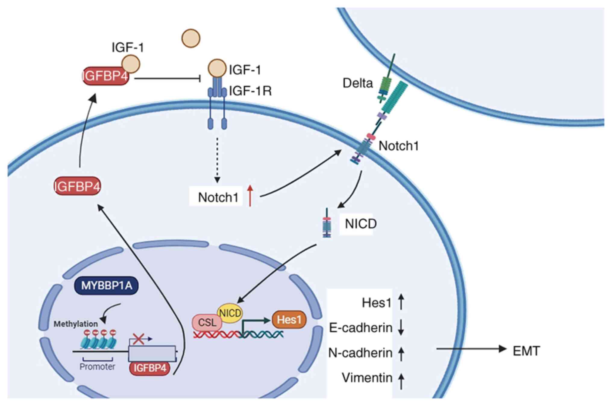 The previous phase of our research (13) elucidated the mechanism of MYBBP1A regulates IGFBP5 transcription and inhibits the AKT pathway, and it was hypothesized that another member of the family, IGFBP4, may have a similar function. Since IGFBP4 has been found to play an important role in other cancers, experiments were designed to verify the function of IGFBP4 and its upstream and downstream pathways in HCC. In conclusion, IGFBP4 is a potent biomarker that plays a protective role in liver cancer, especially in metastatic liver cancer. By exploring the upstream and downstream of IGFBP4, it was revealed that MYBBP1A inhibits the transcription of IGFBP4 through high methylation levels of the CpG islands of the IGFBP4 promoter region mediated by DNMT1, which promotes the activation of the NOTCH pathway, increasing the EMT of HCC and providing migration ability for cancer cells (Fig. 8). A recent study by the authors showed that liver cancer populations with high MYBBP1A expression had a poor prognosis (27), and subsequently, it was found that low expression of IGFBP4 in HCC was associated with poor prognosis in patients with HCC. Therefore, a combined prognostic analysis of MYBBP1A and IGFBP4 was performed. It was found that MYBBP1AHighIGFBP4High patients had an improved prognosis than MYBBP1AHighIGFBP4Low, and in the population with high MYBBP1A expression and poor prognosis, high IGFBP4 expression at the same time could prolong the OS time. It was also found that MYBBP1AlowIGFBP4Low patients had an improved prognosis than those with MYBBP1AHighIGFBP4Low, and in populations with high MYBBP1A expression and poor prognosis, simultaneous high expression of IGFBP4 could prolong OS. Similarly, among the four groups, MYBBP1ALowIGFBP4High patients had the best prognosis, and the OS of patients with MYBBP1ALowIGFBP4High was significantly longer than those with MYBBP1AHighIGFBP4Low (Fig. S8). Dual gene biomarker combination prediction of MYBBP1A and IGFBP4 has great potential in the prognosis of metastatic liver cancer, providing a theoretical basis for the precise treatment and survival prediction of liver cancer.
