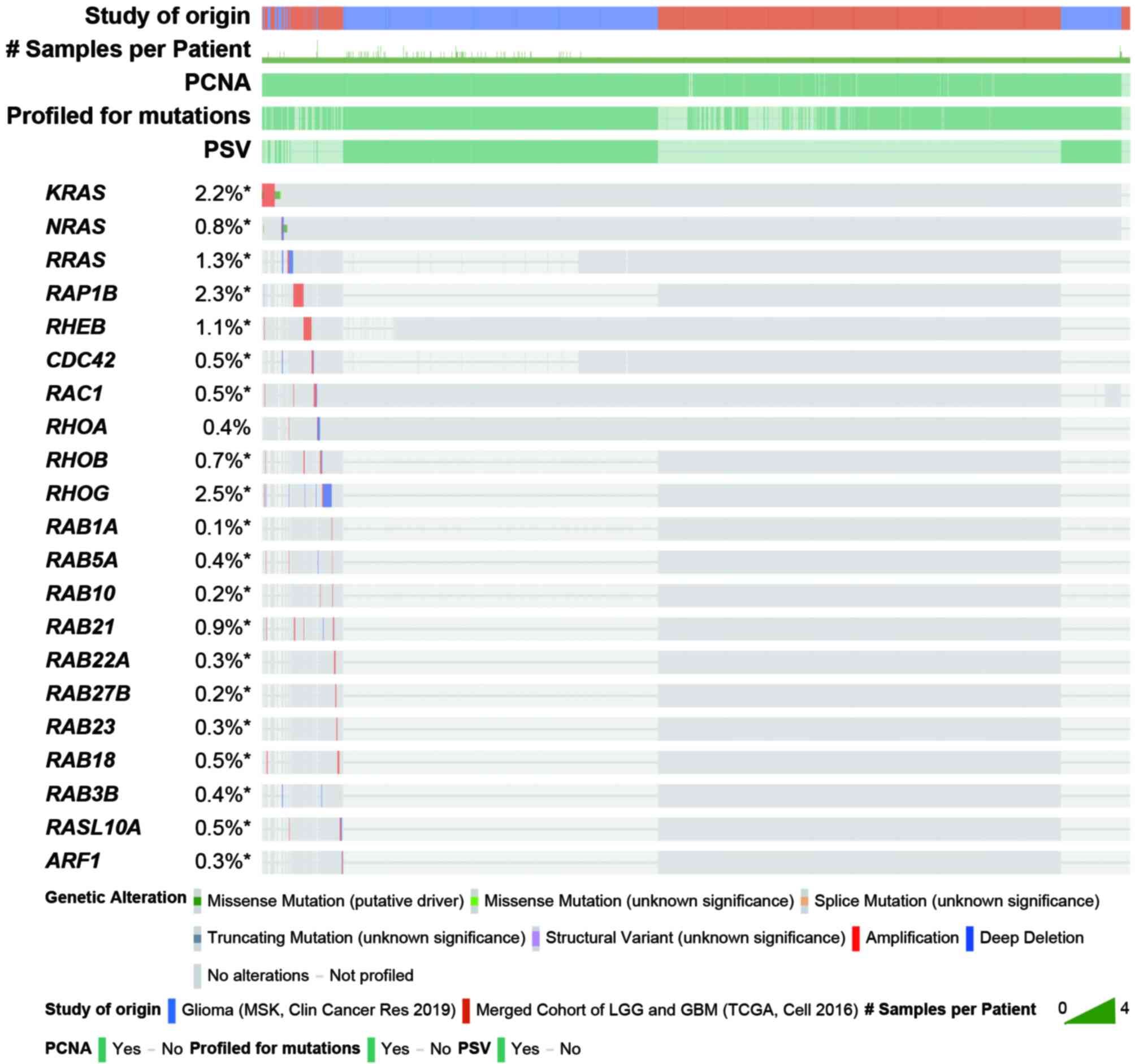 The small GTPases, also known as the small G proteins or RAS superfamily, is a large protein family, which can be roughly divided into five subfamilies, namely the RAS subfamily, RHO subfamily, RAB subfamily, ADP-ribosylation factor (ARF) subfamily and RAN subfamily (15), which have similar modes of action. They are binary molecular switches that can cycle between an active GTP-bound conformation and an inactive guanosine diphosphate (GDP)-bound conformation (16). This process is strictly controlled by guanine nucleotide exchange factors that facilitate GDP dissociation, GTPase-activating proteins that stimulate GTP hydrolysis, and guanine nucleotide dissociation inhibitors that form soluble complexes with small GTPases by shielding their lipid (17,18). These small GTPases participate in most cellular biological processes, including differentiation, proliferation, cell migration, apoptosis, vesicle and organelle dynamics and transport, nuclear dynamics and regulation of the cytoskeleton (15,19). The mutation and abnormal expression of genes encoding small GTPases serve important roles in multiple diseases, including glioma (12,20-32). To investigate structural alterations in small GTPase genes in patients with glioma, a comprehensive analysis was performed utilizing data from Glioma (MSK, Clin Cancer Res 2019) and Merged Cohort of LGG and GBM (TCGA, Cell 2016) in cBioPortal (https://www.cbioportal.org) (33). The results demonstrated that the incidence of changes in small GTPase gene structure is considered to be low in glioma (Fig. 1) (33). Several studies have shown that the abnormal expression of genes encoding small GTPases is often influenced by epigenetic regulation in glioma (34-66) (Tables I and II). To elucidate the evolutionary relationships among subfamily members, phylogenetic analysis was performed using MEGA11 (67) (Fig. 2).