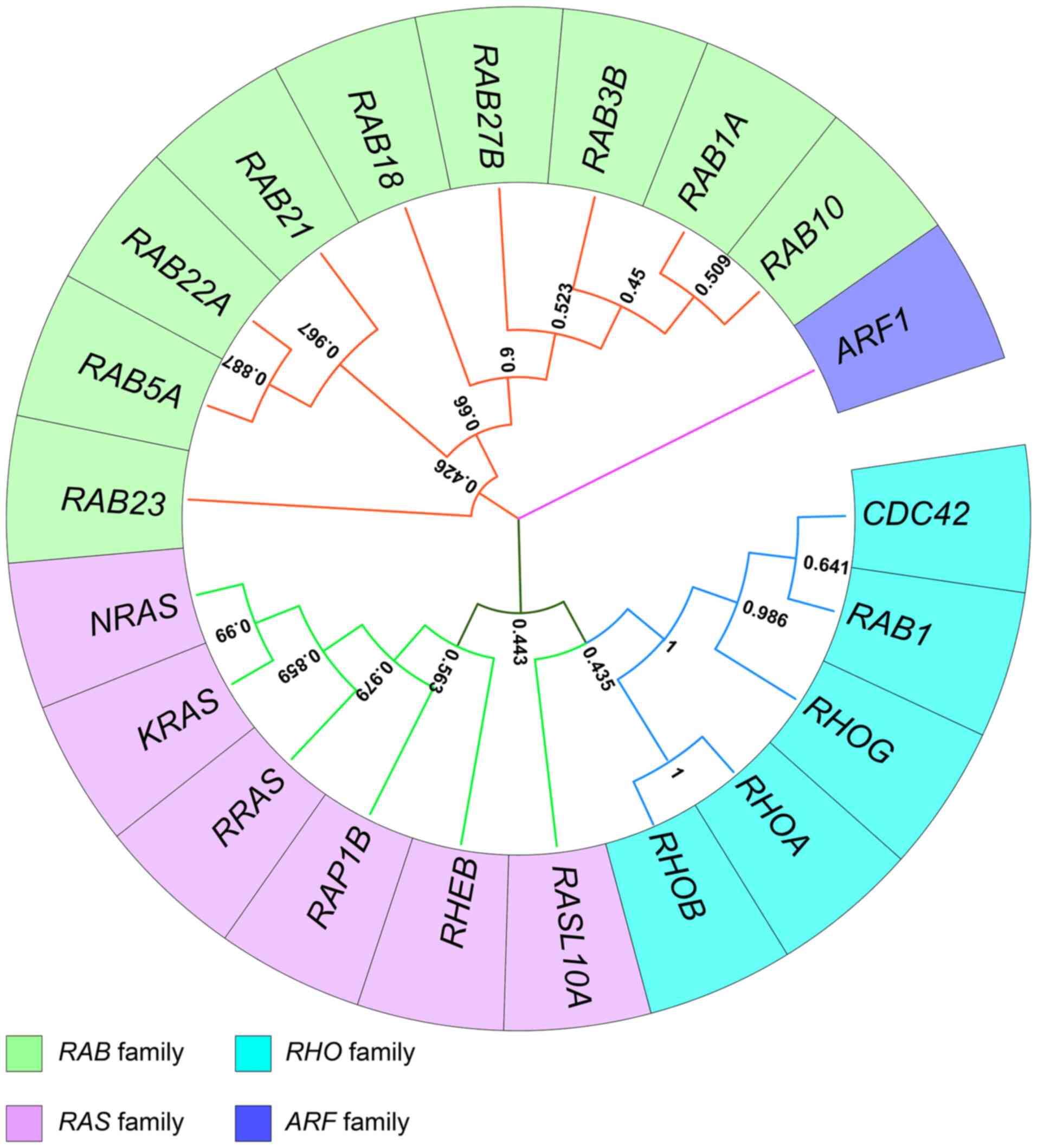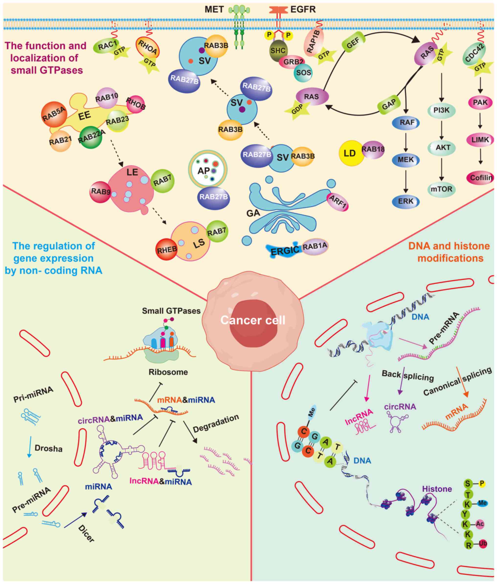 The RAB family is the largest subgroup of the RAS superfamily, which comprises ~70 members that function as controllers of vesicle traffic, membrane tethering and fusion (161-163). Each RAB has its own specific membrane localization, which is beneficial for controlling the specificity and directionality of membrane trafficking pathways (161). The abnormal expression and activity of RABs are associated with the occurrence and progression of various tumors (164-168). RAB1A, RAB3B, RAB5A, RAB10, RAB21, RAB22A, RAB27B, RAB23 and RAB18 are mentioned in the present review (53-65).