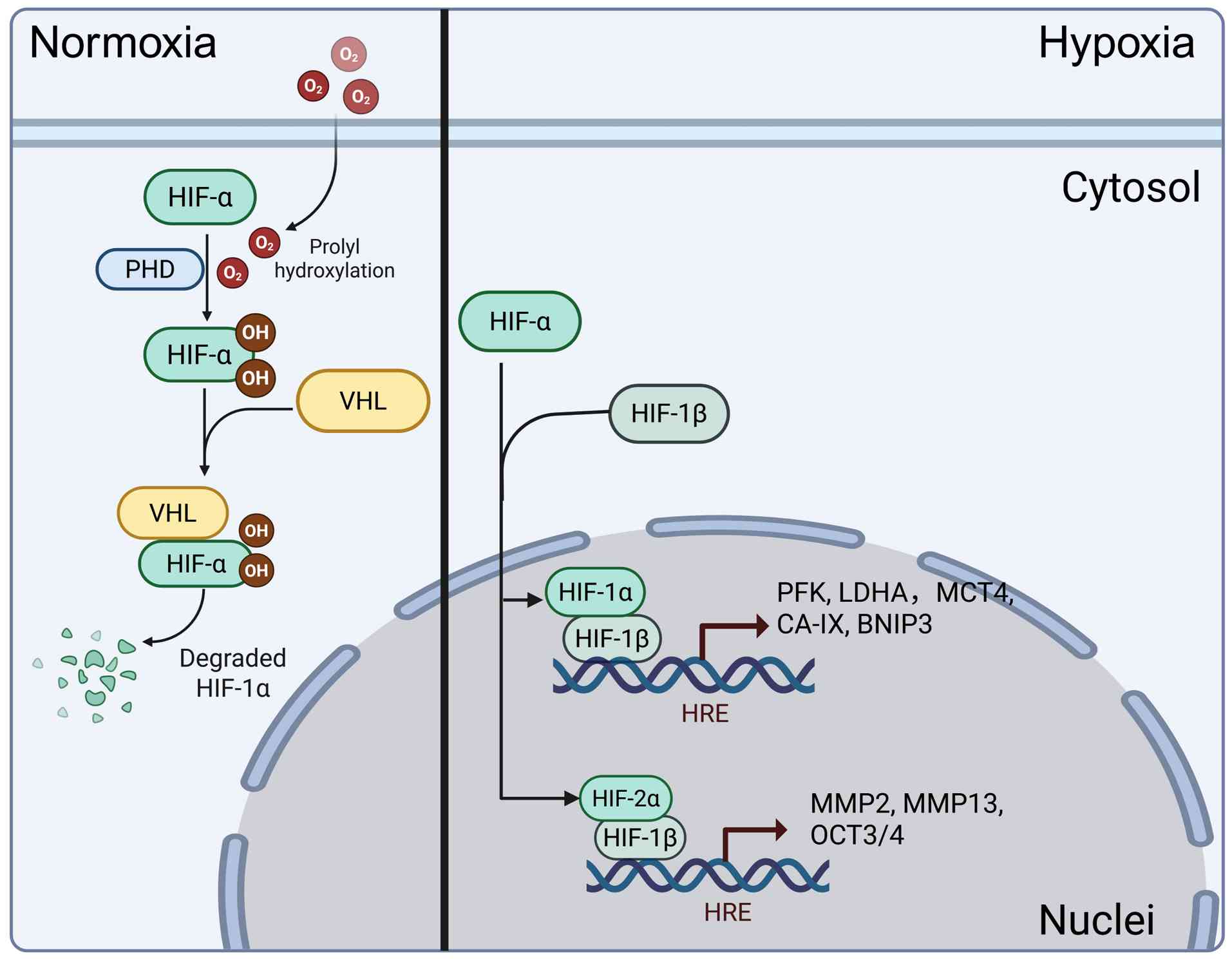 The immune system serves as the primary defense mechanism in the body against external pathogens and abnormal cells; it plays a vital role in identifying and eliminating tumor cells (1). The relationship between tumors and immune function represents a complex and intricate biological network that has emerged as the key focus in research on cancer. Hypoxia is a common characteristic of solid tumors (2). During tumor growth, cancer cells progressively form an immunosuppressive hypoxic tumor microenvironment (TME), which promotes the proliferation and metastasis of tumors by influencing processes such as metabolism, angiogenesis and immune evasion (3). In the TME, critical transcription factors, particularly hypoxia-inducible factors (HIFs) and their downstream signaling pathways, are activated. These signals regulate the differentiation, function and metabolic reprogramming of immune cells, thereby shaping the direction and strength of the tumor immune response. Ultimately, HIFs influence angiogenesis, cell proliferation and invasion in tumors, mediating the progression and development of tumors (4).