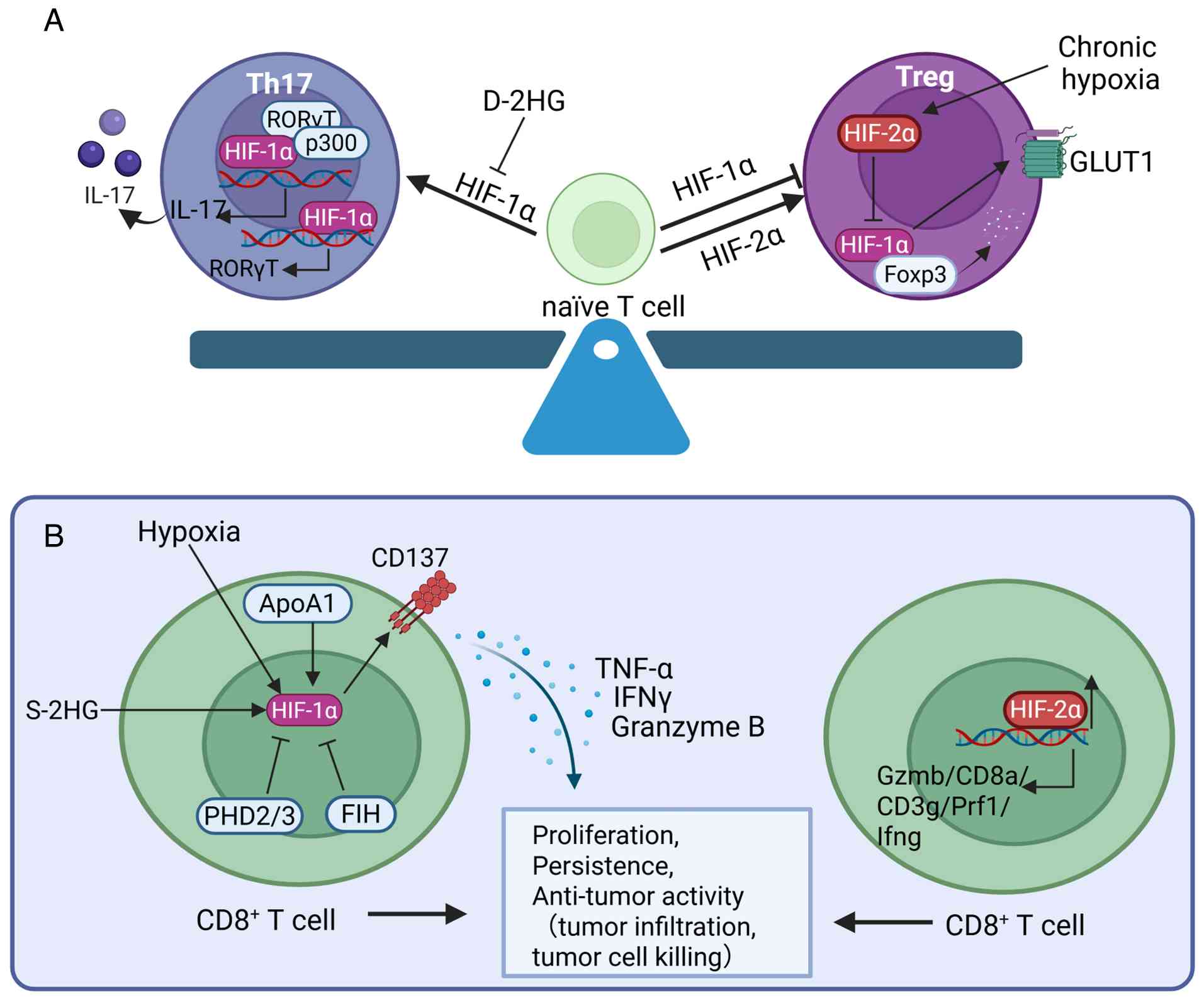 The expression of HIFs in T cells exhibits stage-specific characteristics. While HIF-1α in cancer cells can inhibit the activation of T cells via PD-L1 interaction (40), it primarily displays an activation-promoting effect in naïve T cells (41). Studies have highlighted the upregulation of aerobic glycolysis as a hallmark of T cell activation (42,43). In response to T cell activation, the transcriptional activity of HIF-1 increases, promoting the upregulation of glycolytic enzymes, such as pyruvate kinase, hexokinase 2 (HK2) and GLUT1; these enzymes and their associated metabolic pathways are integral to the activation and function of T cells (44-46). However, in tissues, hypoxia may suppress T cell activation, with T cells exposed to higher oxygen levels exhibiting a more robust activation profile than those in hypoxic environments (47). Glycoproteomic studies on the surfaces of primary human T cells have shown that hypoxia substantially alters the CD8+ T cell surface profile in a manner consistent with metabolic reprogramming and an immunosuppressive state. CD4+ T cells demonstrated similar responses, indicating a common hypoxia-induced surface receptor program and suggesting that hypoxic environments pose challenges to T cell activation (48). Therefore, the levels of HIF-1 during and after activation play a critical role in adapting to the hypoxic environment and regulating the functions of T cells. The evidence from experiments has shown that preconditioning human T cells to hypoxia or activating HIF pathways before chimeric antigen receptor T-cell therapy sustainably enhance T cell cytotoxic functionality (49,50).