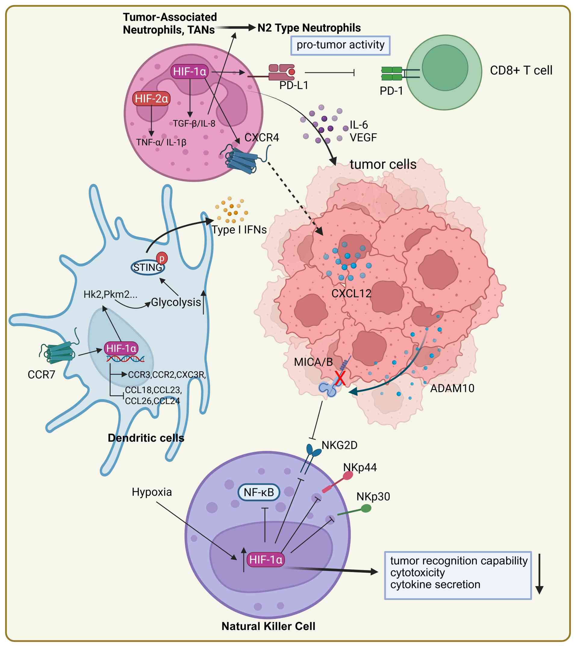 Neutrophils are key effector cells of the innate immune system and play a complex dual role in tumor immunity. They exert antitumor effects by directly killing tumor cells. On the other hand, particularly under hypoxic conditions, neutrophils may facilitate the initiation and progression of tumors. The polarization, transcriptional regulation of tumor-associated neutrophils (TANs) and their interactions with tumors and other immune cells are closely associated with HIFs (110).