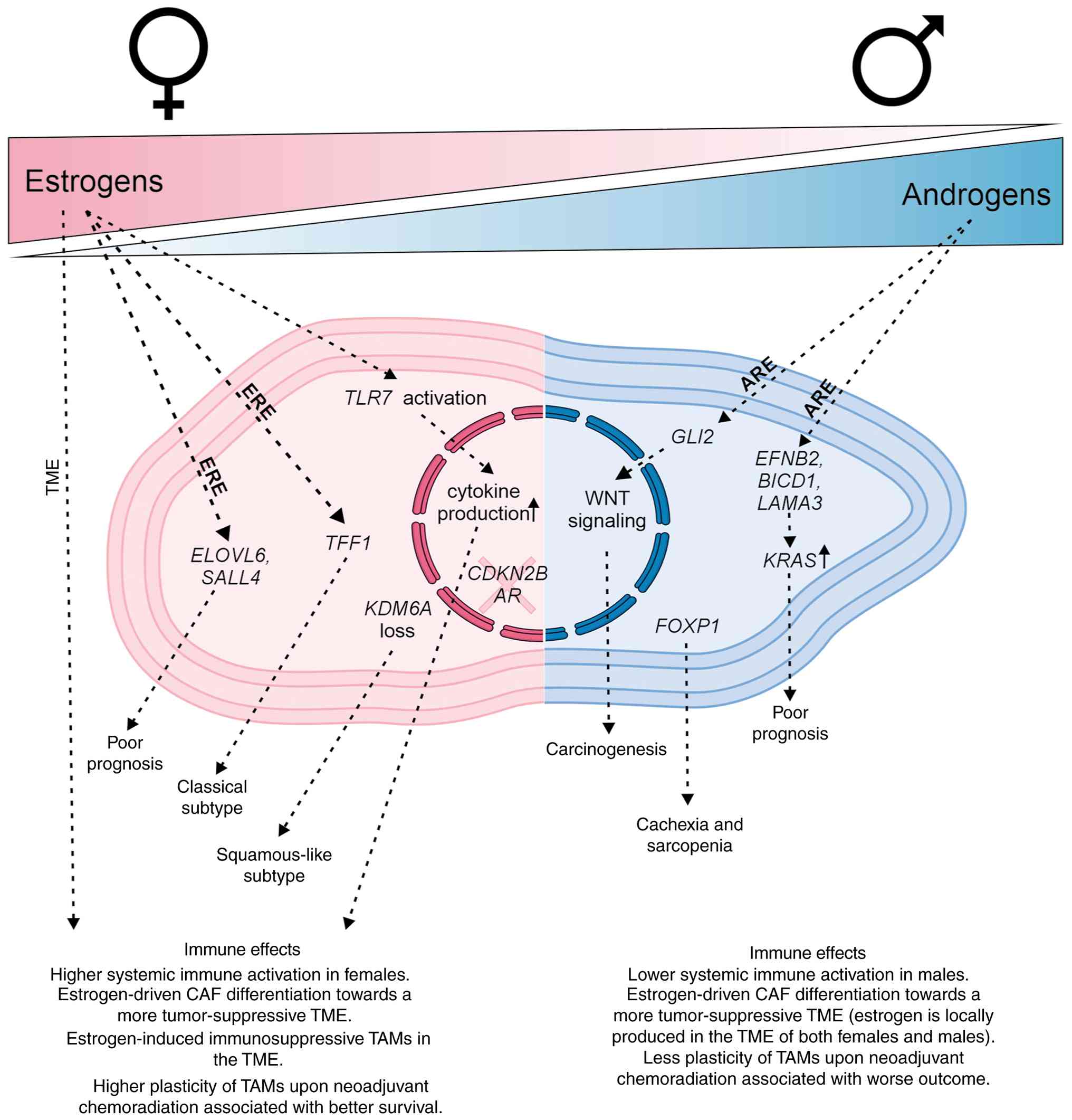 In PDAC, the TME is a key contributor to immune evasion and poor prognosis; it is typically characterized by scarce cytotoxic T cell infiltration, abundant regulatory T cells and a dense, fibrotic stroma, which are features that also limit the response to immunotherapy (76,77). As a result, checkpoint inhibitors have shown limited efficacy in PDAC due to the inherently immunosuppressive nature of the tumor (78). Nevertheless, emerging evidence indicates that sex differences do influence immune pathways and the TME in PDAC. For example, He et al (79) identified a typically immunosuppressive subpopulation of formyl peptide receptor 2 (+) M2 macrophages that is specifically enriched in PDAC lesions from female patients. These tumor associated macrophages (TAMs), induced by estrogen, were associated with T cell exhaustion, reduced immune cell infiltration and poorer survival in women, suggesting a sex-specific immunosuppressive mechanism. In contrast to these findings, a recent study reported that female patients with PDAC exhibit higher levels of stromal biomarkers and increased tumor stiffness, both of which were associated with longer survival (80). The researchers further showed that estrogen signaling shapes the TME by driving cancer-associated fibroblasts toward a more tumor-suppressive phenotype (80). However, these estrogen-related effects were mediated not by systemic hormones but by locally produced estrogens within the tumor tissue and therefore do not fully explain the survival differences observed between women and men (80). In another study investigating patients with treatment-naive PDAC, women exhibited elevated circulating levels of C-X-C motif chemokine ligand (CXCL)9, IL-1β, IL-6, IL-10 and IL-13, supporting the notion of enhanced systemic immune activation in women (81).