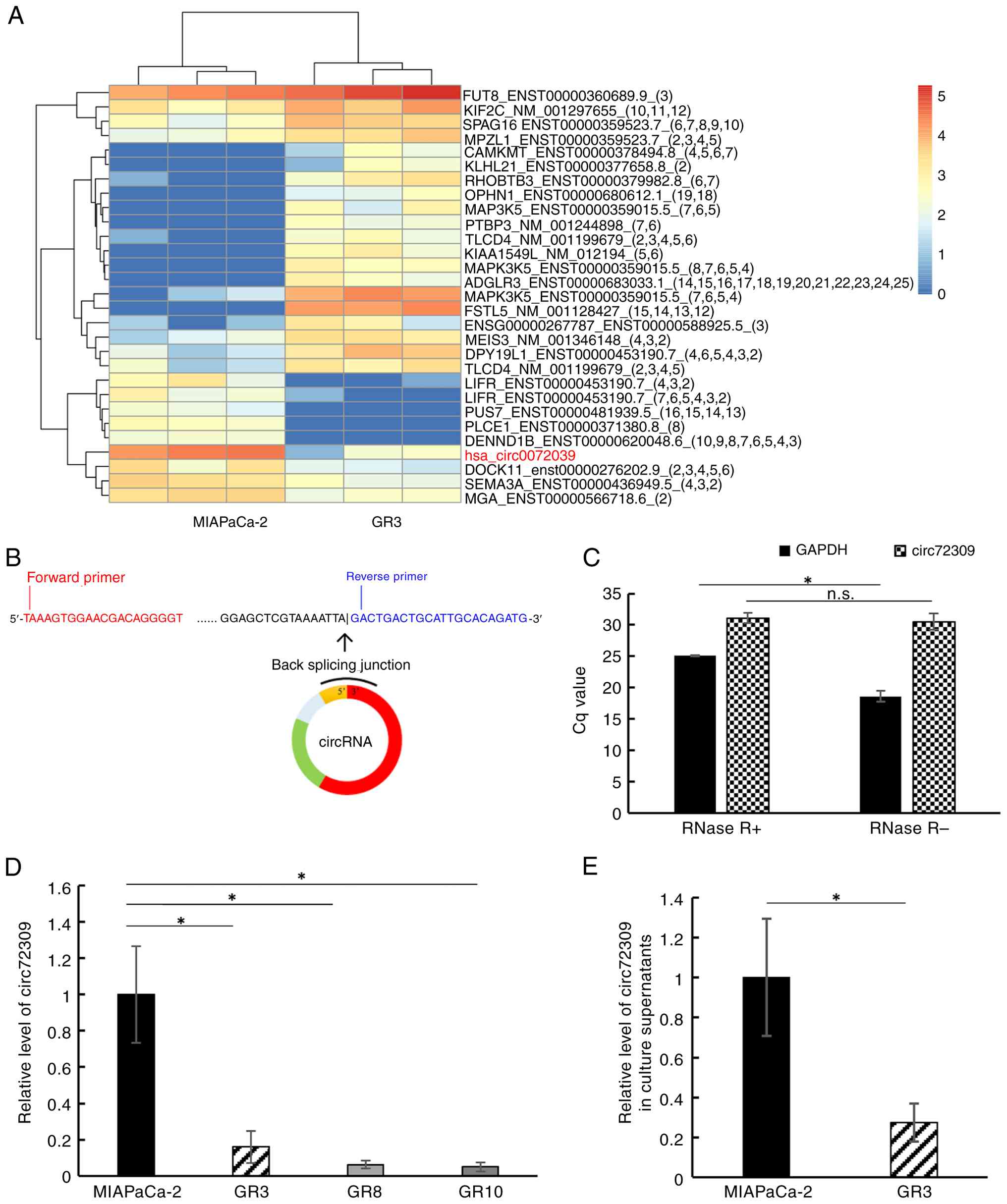 circRNA sequencing was performed on parent PC cell lines (MIAPaCa-2, gemcitabine IC50=12.5 ng/ml; n=3) and a gemcitabine-resistant cell line (GR3; gemcitabine IC50 not reached; n=3) to extract candidate circRNAs associated with gemcitabine sensitivity (GSE297252, https://www.ncbi.nlm.nih.gov/geo/query/acc.cgi?acc=GSE297252). A total of 29 differentially expressed circRNAs (20 upregulated and 9 downregulated) were identified by circRNA sequencing (Fig. 1A). Based on a literature search, circ72309 was identified as potentially relevant; it has a full length of 7,248 bp, a spliced length of 580 bp and is located on human chromosome 5 (chr5:38523520-38530768). To confirm the levels of circ72309 by RT-qPCR, the primers specific for circ72309 were designed to amplify the backsplicing junction sequence (Fig. 1B and Table SV) and the primers were subjected to RNase R treatment to ascertain whether they were capable of recognizing circular RNA. The Cq value of GAPDH, a linear RNA, was increased by RNase R treatment; however, the Cq value of circ72309 was unchanged by RNase R treatment, confirming that the primers recognized the backsplicing junction of circ72309 (Fig. 1C). Subsequently, the levels of circ72309 in three gemcitabine-resistant cell lines (GR3, GR8 and GR10) were confirmed by RT-qPCR; circ72309 was markedly lower in GR cell lines than in MIAPaCa-2 (Fig. 1D). Furthermore, the culture supernatant levels of circ72309 in GR3 was observed to be markedly lower than that in MIAPaCa-2 cells, as well as in cells when compared between MIPaCa-2 and GR3 (Fig. 1E).