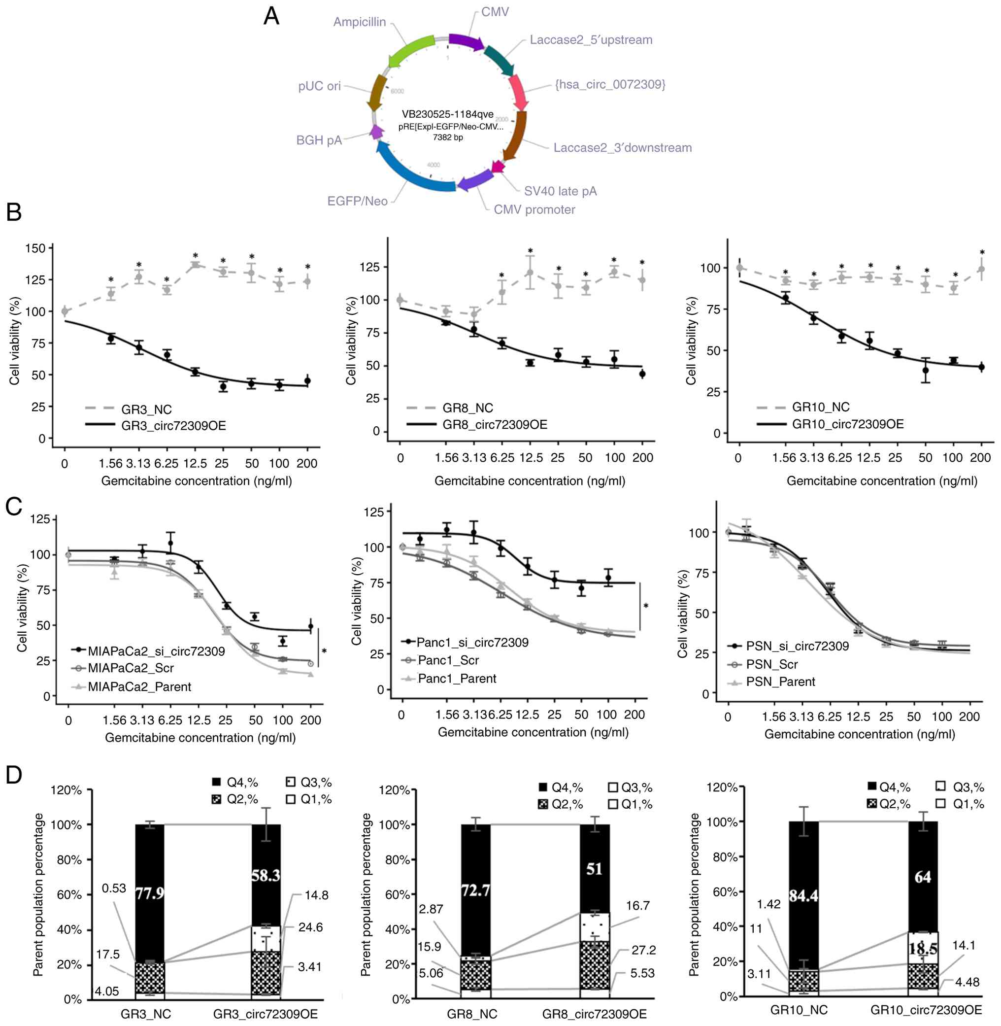 The identified 580-bp sequence was synthesized as an artificial oligonucleotide, subcloned into the pRP[Exp]-EGFP Laccase2 MCS Exon Vector (vector ID: VB230525-1184qve), flanked by a GT-AG splice site (Fig. 2A) and transfected into GR3, GR8 and GR10 cells. The circ72309 levels in the transfected cell lines were markedly increased following transfection (Fig. S2). Each overexpressed gemcitabine-resistant cell line (GR3_circ72309 OE, GR8_circ72309 OE and GR10_circ72309 OE) was assessed using MTT and apoptosis assays. The pRP[Exp]-EGFP/Neo-CMV>ORF_Stuffer (vector ID: VB900145-9829wty) was used as a control (GR_NC) for comparison. In the MTT assay, a concentration-dependent decrease in cell viability was evident in GR_circ72309 OE, indicating enhanced sensitivity to gemcitabine. The fitted curves followed a typical sigmoidal profile, with IC50 values of 13.3 ng/ml (R2=0.974) for GR3_circ72309 OE, 130 ng/ml (R2=0.951) for GR8_circ72309 OE and 16.9 ng/ml (R2=0.984) for GR10_circ72309 OE (Fig. 2B). In resistant clones, cell viability remained relatively high even at the maximal drug concentrations tested and the curves did not follow a typical sigmoidal profile, consistent with a resistant phenotype. The effect of si_circ72309 on gemcitabine sensitivity was evaluated using MIAPaCa-2 (IC50, 23.3 ng/ml), Panc-1 (IC50, 24.7 ng/ml) and PSN-1 (IC50, 6.0 ng/ml) cells. Next, untreated parent cells, scramble control (Scr) transfected cells and GR3, GR8 and GR10 si_circ72309 transfected cells were assessed. In MIAPaCa-2, no difference in gemcitabine sensitivity was observed between MIAPaCa-2_Parent and MIAPaCa-2_Scr (IC50, MIAPaCa-2_ Parent vs. MIAPaCa-2_Scr, 23.3 ng/ml vs. 23 ng/ml). However, MIAPaCa-2_si_circ72309 demonstrated increased resistance to gemcitabine, with an IC50 of 180 ng/ml. Similarly, gemcitabine resistance was markedly augmented in Panc-1_si_circ72309 (IC50, not reached) relative to Panc-1_Parent (IC50, 24.7 ng/ml) and Panc-1_Scr (IC50, 21.3 ng/ml). No effect on gemcitabine sensitivity was observed in PSN-1 (Fig. 2C). The apoptosis rate after 20 ng/ml gemcitabine treatment was examined using the annexin V assay, which showed a significant increase in early and late apoptotic cells (Q3 and Q2) in GR_circ72309 OE [rate of apoptosis cells (Q2+Q3): GR3_NC vs. GR3_circ72309 OE, 18.0 vs. 38.3%, P=0.002; GR8_NC vs. GR8_circ72309 OE, 18.7% vs. 43.9%, P=0.009; GR10_NC vs. GR10_circ72309 OE, 12.4% vs. 32.6%, P=0.045, Fig. 2D]. This showed that overexpression of circ72309 in gemcitabine-resistant cell lines induced apoptosis in the presence of gemcitabine, thereby enhancing gemcitabine sensitivity.