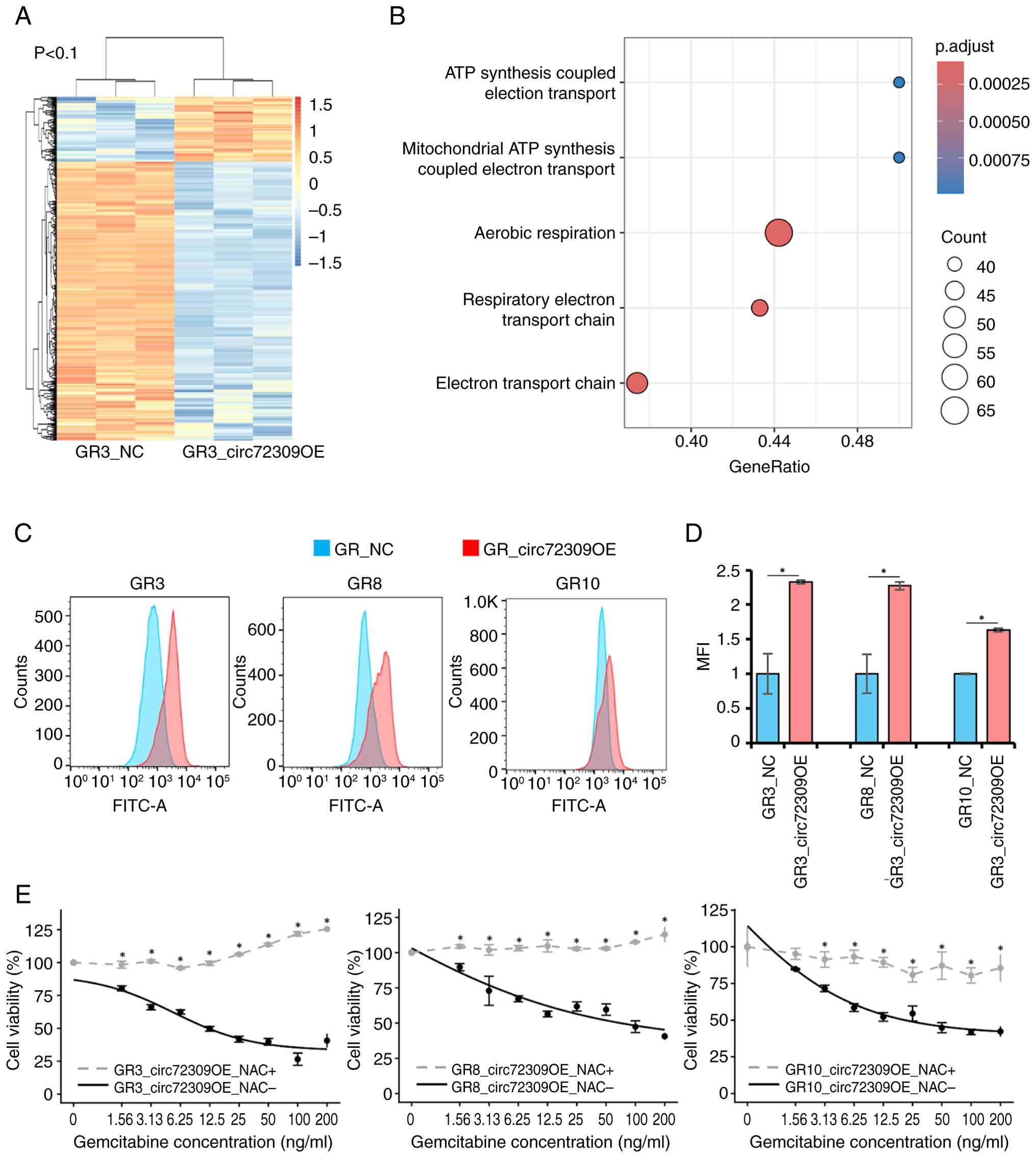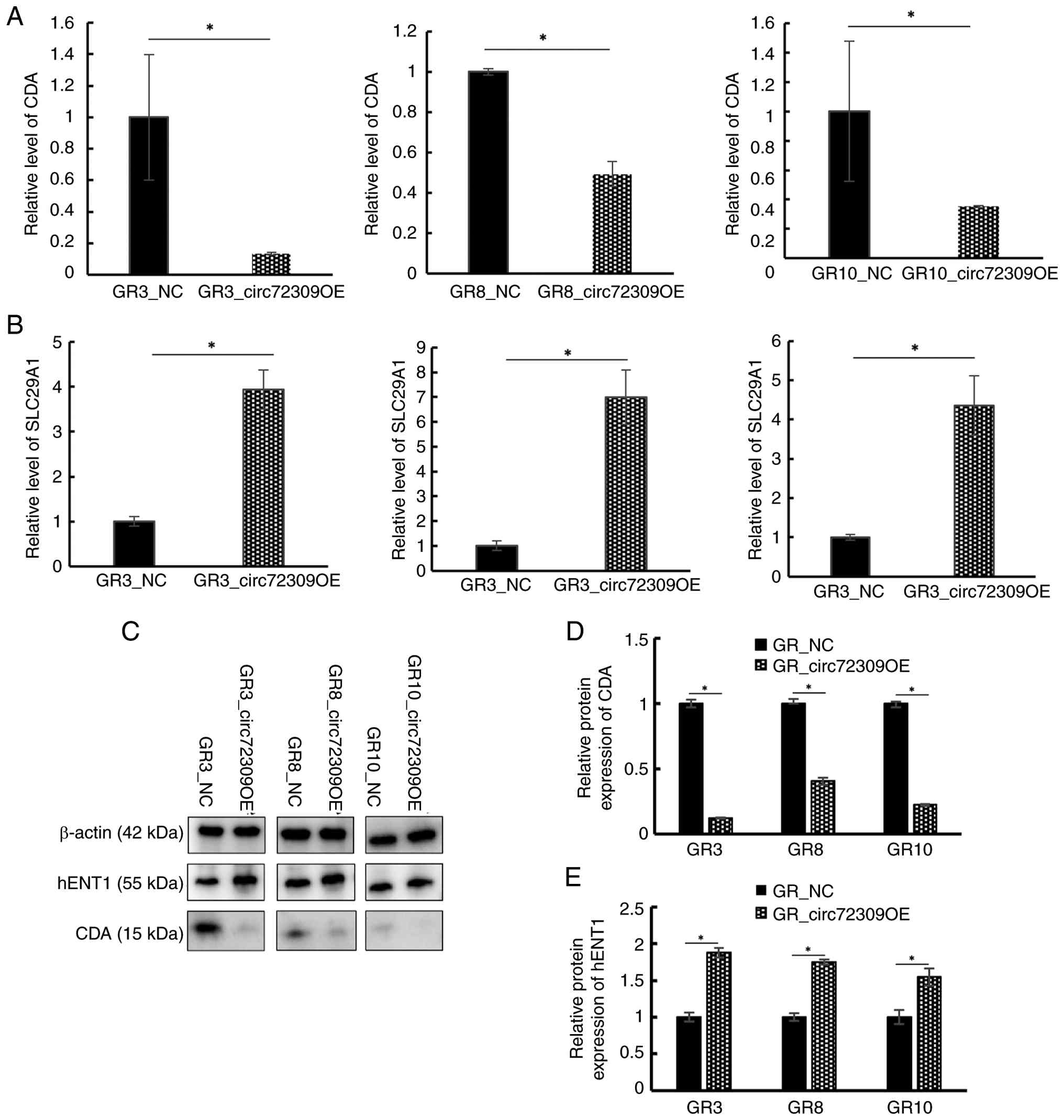 To investigate the mechanism by which overexpression of circ72309 improved gemcitabine sensitivity, GR3_NC (n=3) and GR3_circ72309 OE (n=3) were submitted for mRNA sequencing (Fig. 3A). The differentially expressed mRNAs (545 in total; 103 upregulated and 442 downregulated) were identified (GSE297082, https://www.ncbi.nlm.nih.gov/geo/query/acc.cgi?acc=GSE297082). GSEA showed that the oxidative phosphorylation and ATP production pathway in mitochondria were enhanced in GR3_circ72309 OE (Fig. 3B), suggesting that ROS activity may be involved in the increase in gemcitabine sensitivity. The ROS activity in GR_circ72309 OE showed an increase compared to GR_NC (Fig. 3C and D). A previous report revealed that the effect of ROS reduces CDA, which metabolizes gemcitabine to the inactive form 2′,2′-Difluoro-2′-deoxyuridine (dFdU) (37). Subsequently, GR_circ72309 OE were treated with a ROS scavenger, NAC, to suppress ROS activity and the effect on gemcitabine sensitivity was then assessed. As a control, the same volume of PBS was added to GR_circ72309 OE_NAC-. In the MTT assay, GR_circ72309 OE_NAC+ promoted gemcitabine resistance, indicating that NAC counteracted the gemcitabine sensitivity observed following overexpression of circ72309 (IC50: GR3_circ72309 OE_NAC-vs. GR3_circ72309 OE_NAC+, 12.0 ng/ml vs. not reached; GR8_circ72309 OE_NAC-vs. GR8_circ72309 OE_NAC+, 69.6 ng/ml vs. not reached; GR10_circ72309 OE_NAC-vs. GR10_circ72309 OE_NAC+, 20.8 ng/ml vs. not reached; Fig. 3E). When CDA expression was confirmed by RT-qPCR and western blotting, its expression was markedly reduced in GR_circ72309 OE (Fig. 4A, C and D). mRNA sequencing results confirmed the changes in genes related to gemcitabine metabolism and showed a significant increase in SLC29A1 expression (log fold change, 1.16; P<0.001). The gene encodes human equilibrative nucleoside transporter 1 (hENT1), a transmembrane glycoprotein that localizes to the plasma and mitochondrial membranes and mediates the cellular uptake of nucleosides from the surrounding medium. When the expression of SLC29A1 was confirmed by RT-qPCR and western blotting, the expression was markedly increased in GR_circ72309 OE cells (Fig. 4B, C and E).