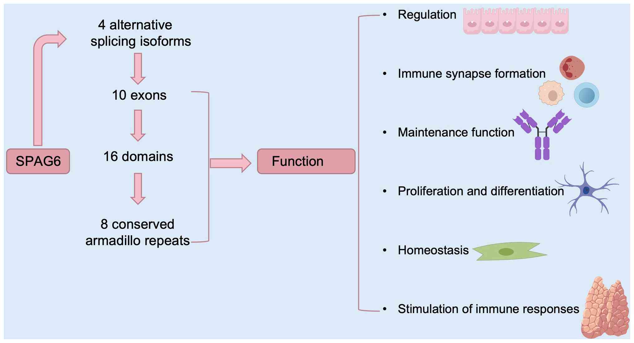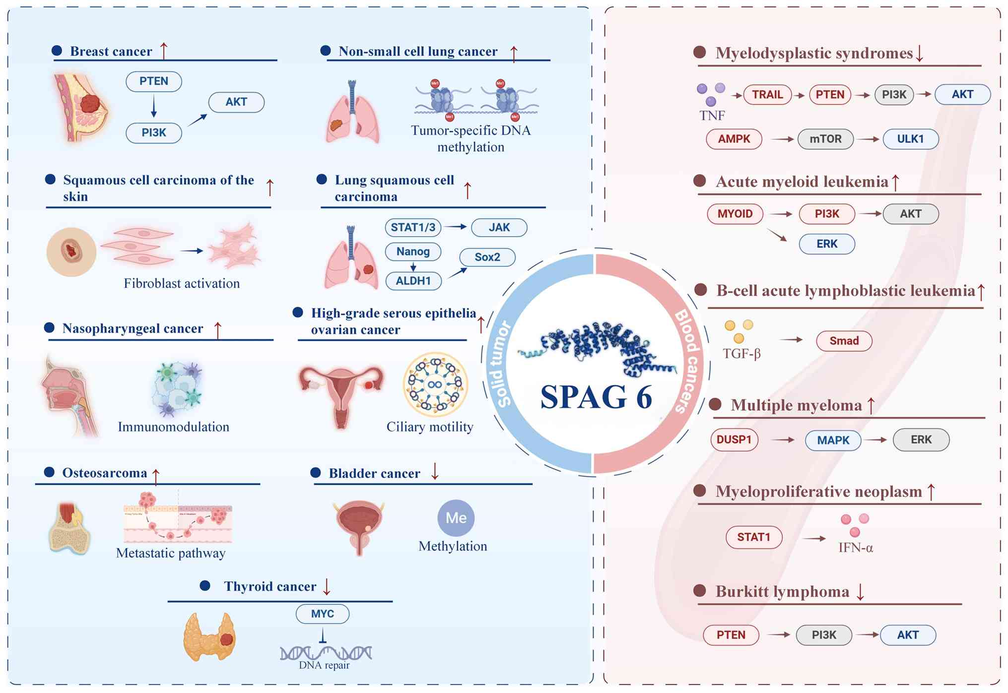 In summary, SPAG6 is a tubulin protein with multiple physiological functions, including regulation of ciliary/flagellar movement, mediation of the formation and function of immune synapses, neuronal proliferation and differentiation. It regulates the morphology, growth and migration of fibroblasts and attenuates the function of middle ear and Eustachian tube epithelial cells. In addition, SPAG6 acts as an oncogene in most tumors, promoting tumorigenesis through its high expression and regulating signaling pathways, such as PTEN/PI3K/AKT and MAPK/ERK, to promote tumor proliferation, migration and drug resistance (e.g., hematological tumors, osteosarcoma and breast cancer). It also exhibits tumor-suppressing effects in bladder cancer (methylation silencing) and thyroid cancer (overexpression inhibits the malignant phenotype). It exhibits significant tissue specificity in hematological tumors (AML, MDS and lymphoma) and serves as a prognostic marker and therapeutic target. SPAG6 silencing enhances tumor cell sensitivity to chemotherapy. In solid tumors, SPAG6 is closely associated with immune infiltration, cancer stemness and epigenetic regulation (e.g., breast cancer circRNA stabilizes SPAG6 mRNA), and pancancer analyses suggest that its expression is associated with immune microenvironment remodeling. Overall, SPAG6 is a potential biomarker for tumor classification, prognosis assessment and targeted intervention. It may be used to guide treatment selection and assess disease prognosis. Nevertheless, SPAG6-related studies have several limitations. In vitro and in vivo studies are needed to evaluate its potential as a therapeutic target and prognostic marker in tumors. In addition, it is necessary to examine its upstream and downstream regulatory pathways and identify proteins that interact with SPAG6 through protein-protein interactions to elucidate the mechanisms underlying its role in tumorigenesis and tumor progression.