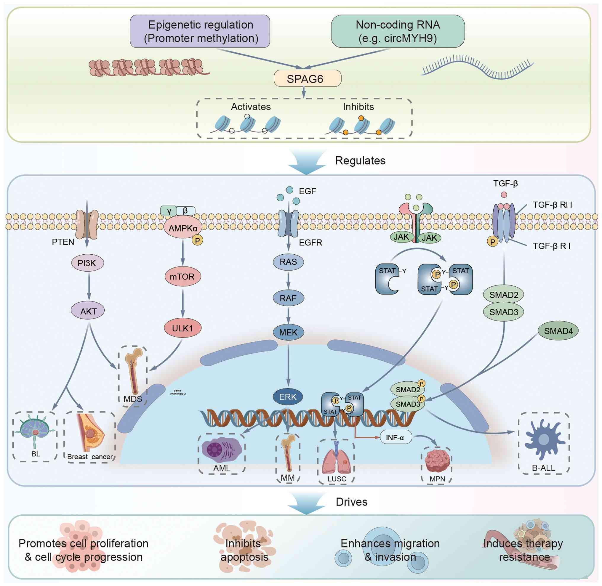In hematologic malignancies, high SPAG6 expression in MDS promotes disease progression by inhibiting the TRAIL apoptosis pathway (reducing FAS-Associated Via Death Domain binding to death receptors), activating the PI3K/AKT signaling pathway (downregulating PTEN) (63), and attenuating the G1/S transition of the cell cycle (12). SPAG6 silencing induces AMPK/mTOR/ULK1-mediated autophagic apoptosis and enhances the DNA demethylation efficacy of decitabine (64). In AML, SPAG6 serves as an independent prognostic marker (71), with high expression activating the PI3K/AKT and ERK pathways through the formation of a SPAG6-MYO1D complex that drives leukemia growth and is associated with MRD monitoring (73). SPAG6 expression is significantly reduced in adult patients with B-ALL during remission and it maintains tumor cell proliferation through the TGF-β/Smad signaling pathway (76). In MM, SPAG6 binds to DUSP1 and activates the MAPK/ERK pathway, thereby promoting the malignant phenotype and exhibiting an association with bone infiltration (79). In BCR-ABL1-negative MPN, SPAG6 forms a positive feedback loop with STAT1 (83). Its silencing enhances the proapoptotic effect of IFN-α. In BL, SPAG6 activates the PI3K/AKT pathway by inhibiting PTEN, and its downregulation inhibits tumor growth in vivo and in vitro (11).