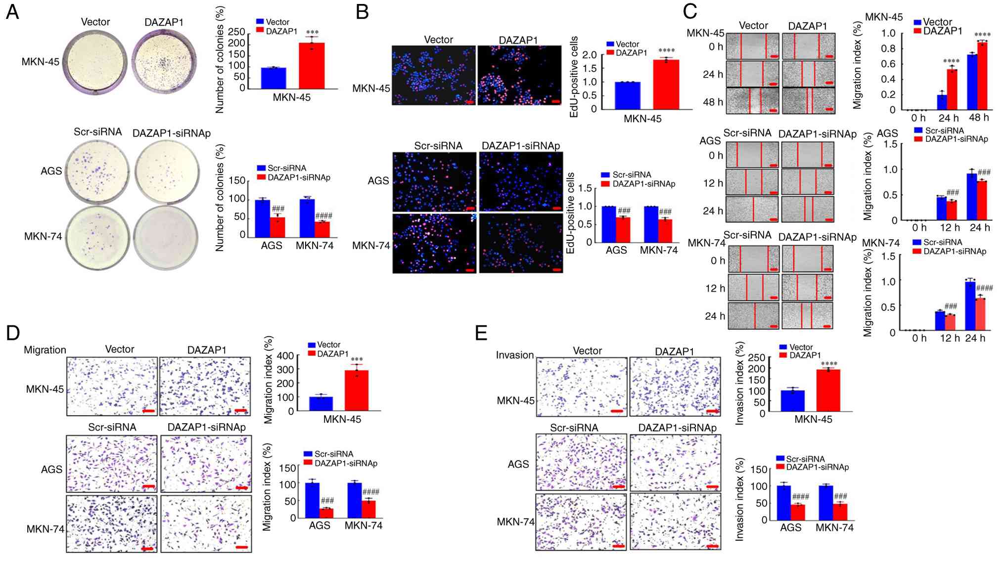 MKN-45 GC cell line with relatively low and AGS and MKN-74 cell lines with relatively elevated endogenous DAZAP1 levels were selected for transfection and functional experiments (Fig. 1C). Stable transfectants were constructed via DAZAP1-sense plasmids in MKN-45 cells (Fig. S2A) or DAZAP1 was suppressed using siRNAp in AGS and MKN-74 cells (Fig. S2B), as demonstrated via western blot analysis and qPCR. Subsequently, colony formation assays showed that overexpression of DAZAP1 led to significantly more colonies than the vector in MKN-45 cells (Fig. 2A). EdU assay showed that overexpression of DAZAP1 significantly induced cell proliferation compared with the control vector in MKN-45 cells (Fig. 2B). Proliferation of AGS and MKN-74 cells was inhibited by the knockdown of DAZAP1 (Fig. 2A and B).