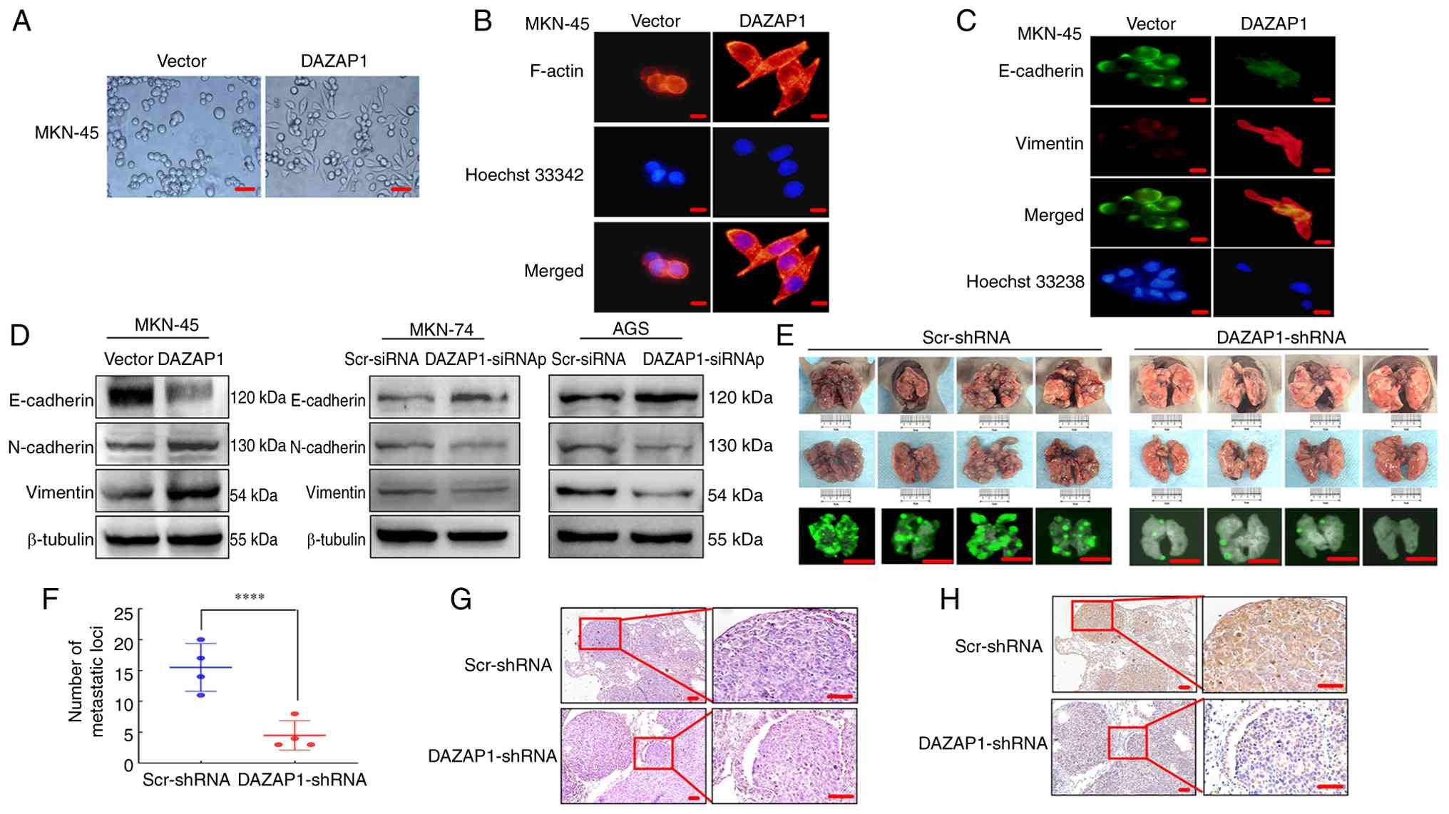 Additionally, to explore the association between DAZAP1 and migration/invasion, the function of DAZAP1 in metastases was examined by injecting AGS/LV-pEGFP-DAZAP1-shRNA and AGS/LV-pEGFP-Scr-shRNA expressing GFP into nude mice (Fig. 3E). The knockdown efficiency of DAZAP1-shRNA was verified in AGS cells (Fig. S4C). Smaller lung metastatic nodules were detected in the LV-DAZAP1-shRNA compared with the LV-pEGFP-Scr-shRNA group (Fig. 3F). Histological examination confirmed the presence of GC cell metastases in the lung tissue (Fig. 3G). Moreover, IHC analysis demonstrated that vimentin protein levels were promoted in cancer tissue of the LV-pEGFP-Scr-shRNA compared with those in the LV-DAZAP1-shRNA group (Fig. 3H). These results indicated that DAZAP1 in GC cells may be a vital contributor to EMT progression, thereby mediating the ability of GC cells to migrate and invade.