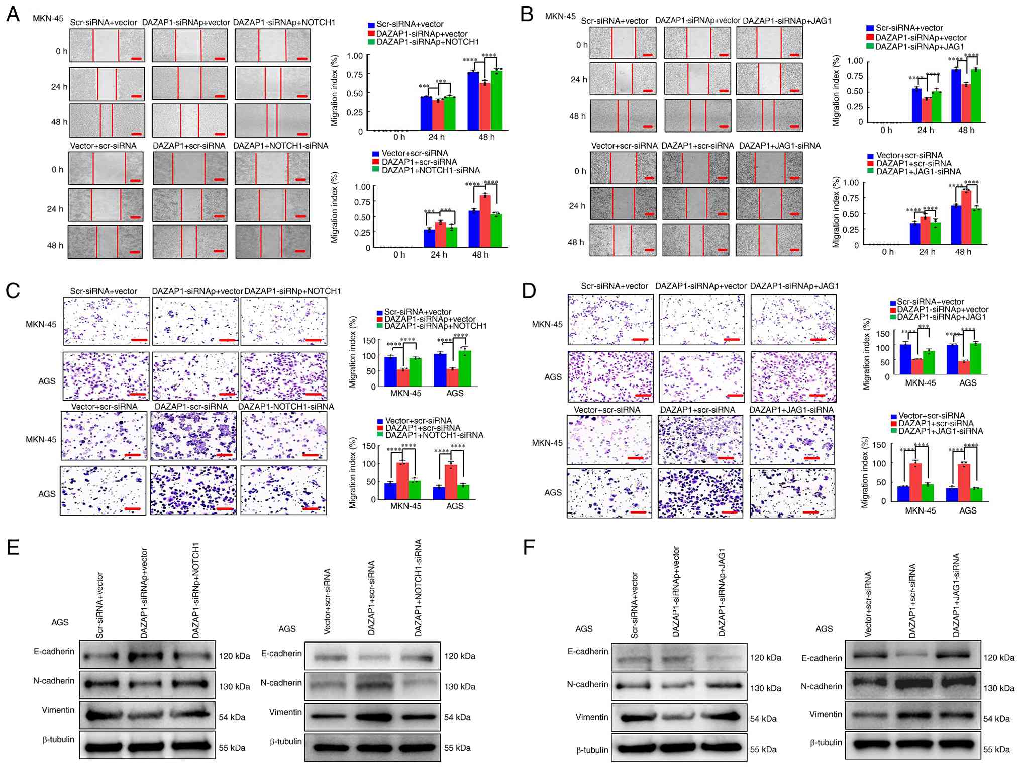 Ligands for NOTCH1 are transmembrane proteins expressed on adjacent cells, including JAG and Δ (14,15,23). The present study assessed whether DAZAP1/NOTCH1 or DAZAP1/JAG1 pathways contribute to GC cell progression. First, the present study constructed stable transfectants using NOTCH1- and JAG1-sense plasmids or knockdown of NOTCH1 and JAG1 with siRNAp in MKN-45 and AGS cells (Fig. S3A), as confirmed by western blot and RT-qPCR analysis. DAZAP1 knockdown attenuated the migratory and invasive abilities of GC cells, whereas overexpression of NOTCH1 or JAG1 partially reversed the phenotypes induced by DAZAP1 suppression compared with the control, as demonstrated by wound healing and Transwell assays (Figs. 5A-D and S4A-D). Rescue experiments showed that DAZAP1 overexpression markedly increased cell motility ability, which was abrogated by downregulation of NOTCH1 or JAG1 (Figs. 5A-D and S4A-D).