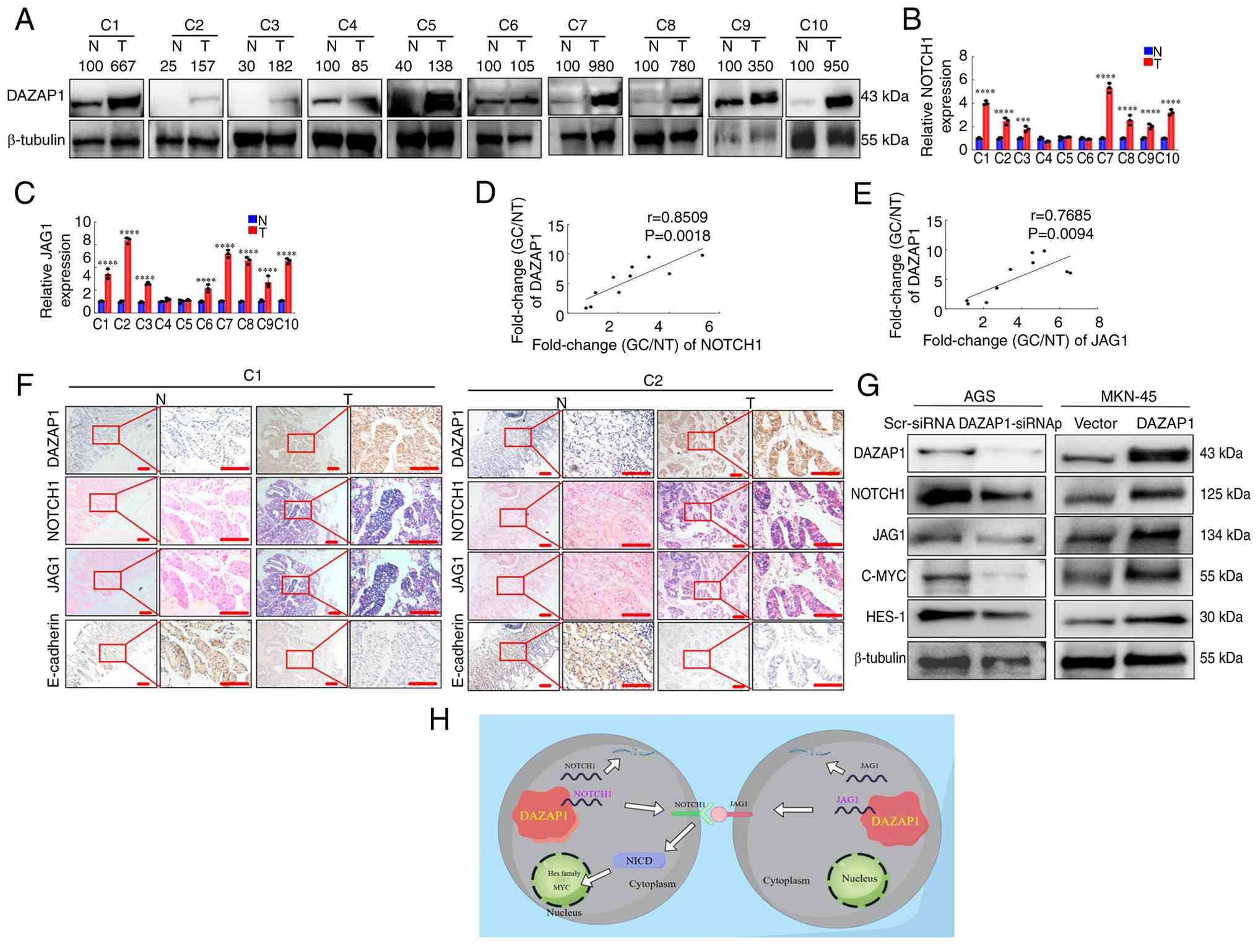 IHC and ISH were demonstrated that the expression of DAZAP1, NOTCH1 and JAG1 was significantly higher, while that of E-cadherin was significantly lower, in GC compared with healthy tissue (Fig. 7F).