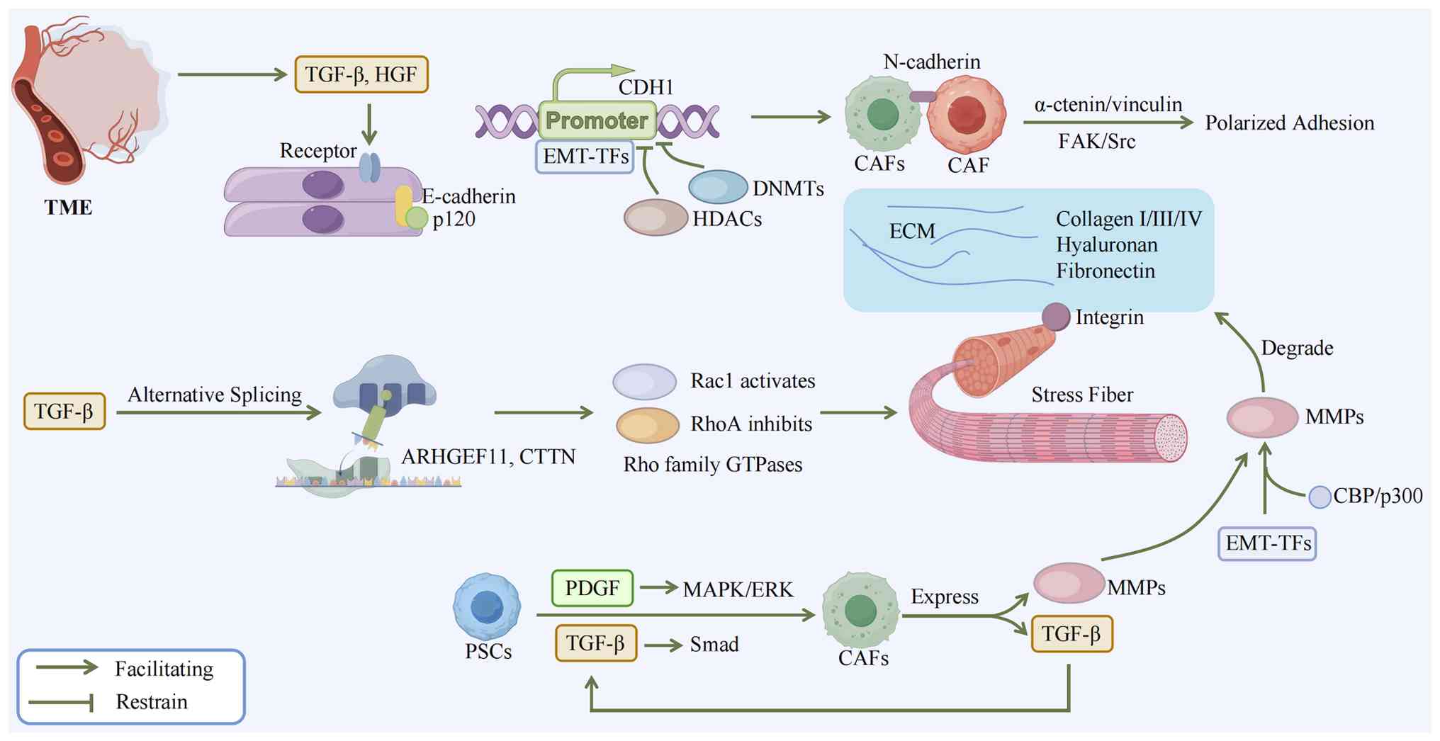 EMT not only alters the characteristics of cancer cells themselves but also reshapes their interactions with the TME, particularly with CAFs and the ECM. Disrupting this crosstalk is therefore a critical strategy to inhibit metastasis.