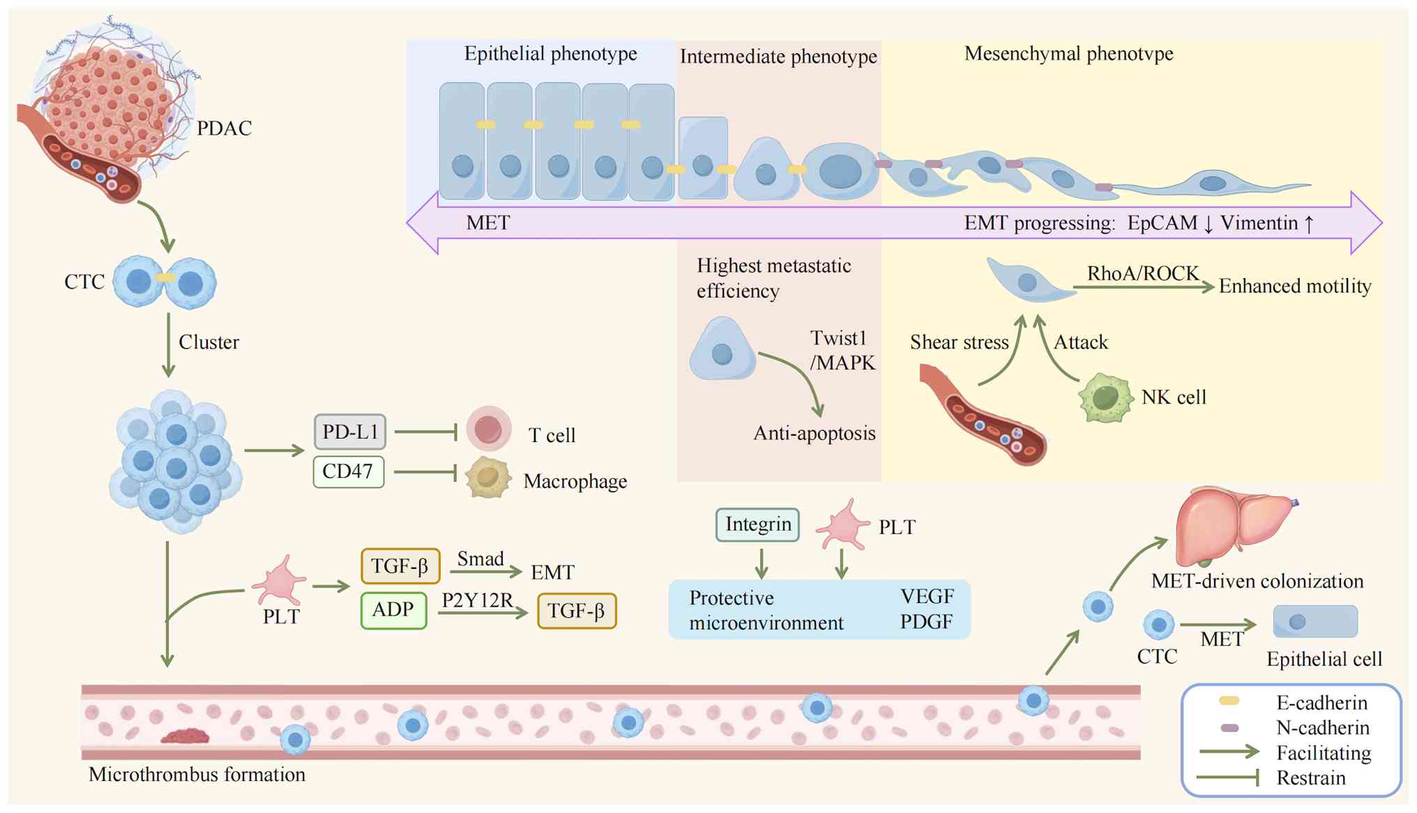 Studies have found that CTCs in the peripheral blood of PDAC patients often exhibit varying degrees of EMT characteristics and their phenotypic heterogeneity is associated with TGFβ/Smad pathway activation and Snail-mediated downregulation of epithelial markers (36,37). Although cells that have fully undergone EMT exhibit enhanced motility via the RhoA/ROCK pathway: Activation of this pathway regulates actin filament contraction and focal adhesion dynamic assembly, thereby driving cytoskeletal reorganization to promote migration, while their single-cell state makes them more vulnerable to damage from blood shear stress and attack by natural killer (NK) cells (37,38). In recent years, the 'partial' EMT or 'hybrid' EMT state has been confirmed to be the phenotype with the highest metastatic efficiency: such cells acquire mesenchymal properties via Twist1/MAPK pathway activation to resist apoptosis, while retaining E-cadherin-mediated cell junctions; their plasticity is maintained by the Notch-Jagged1 signaling pathway, which sustains intercellular fate consistency through lateral induction (38).