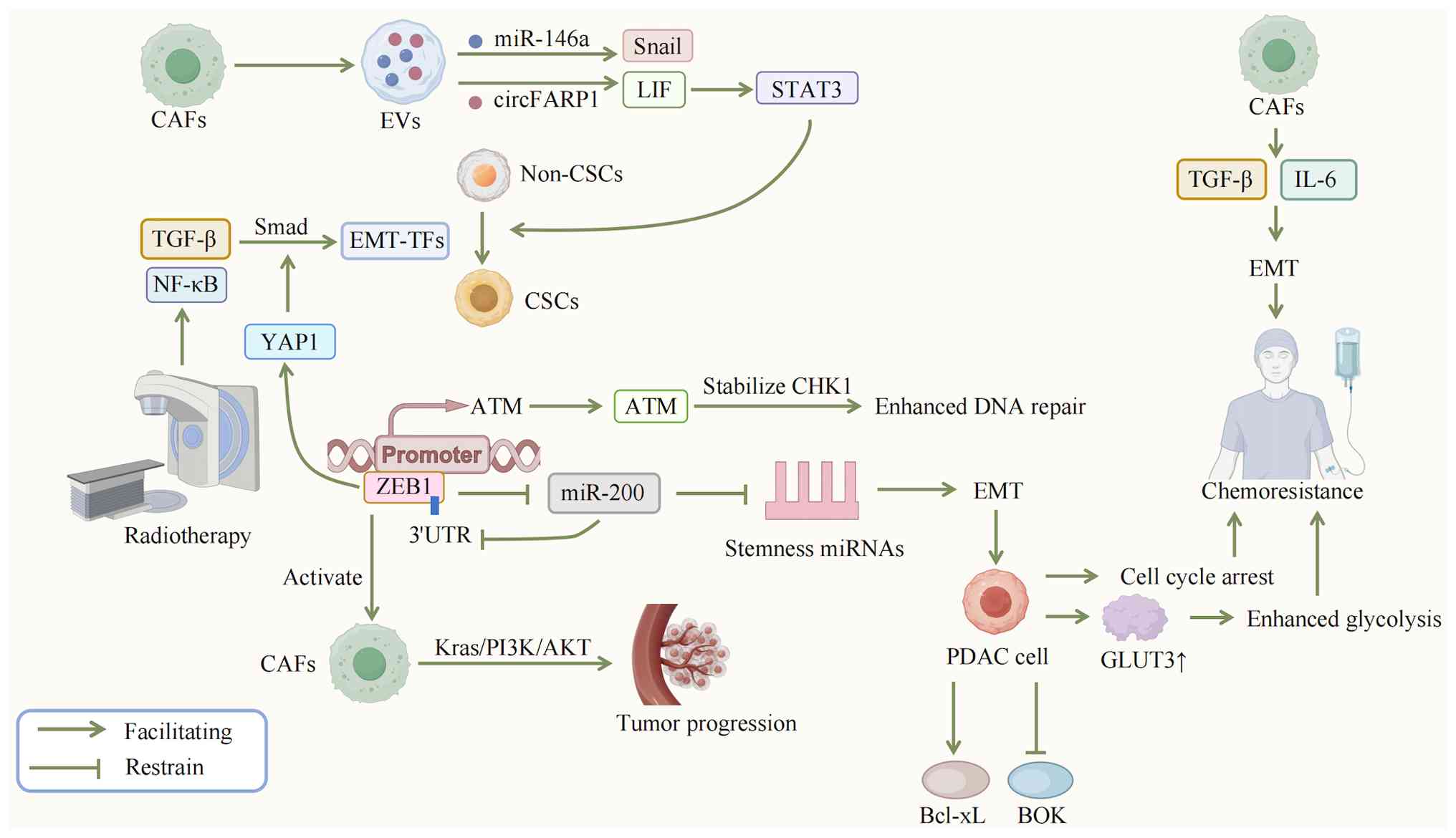 In pancreatic cancer, EMT is a key mechanism mediating resistance to chemotherapy and radiotherapy and it affects the response of tumor cells to treatment through a multi-dimensional regulatory network. EMT-TFs such as ZEB1 play a central role: High ZEB1 expression is closely associated with gemcitabine resistance and ZEB1 can maintain the EMT phenotype and reduce drug sensitivity by inhibiting the miR-200 family to form a negative feedback loop; conversely, ZEB1 knockdown can markedly reverse this process (69,70). Additionally, EMT-induced metabolic reprogramming provides an energy basis for drug resistance: PDAC cells with ZEB1 deficiency cannot compensatorily enhance glycolysis when oxidative phosphorylation is inhibited, making them sensitive to metabolic stress; by contrast, EMT-activated cells maintain energy supply by upregulating glucose transporters [such as Glucose Transporter 3 (GLUT3)] and the Warburg effect, thereby tolerating metabolic stress induced by chemotherapeutic drugs (69). In terms of radioresistance, EMT achieves resistance by enhancing DNA damage repair capacity: ZEB1 can directly bind to the Ataxia Telangiectasia Mutated Protein (ATM) promoter and form a complex with p300/PCAF to promote ATM expression; meanwhile, ZEB1 stabilizes CHK1 by sequestering the deubiquitinase USP7, accelerating DNA damage repair to reduce radiation-induced cell death (69); furthermore, radiotherapy itself can upregulate EMT-TFs such as ZEB1 and Snail by activating pathways such as TGF-β and NF-κB, further exacerbating resistance (71). The involvement of the TME is another important aspect: Cytokines such as TGF-β and IL-6 secreted by CAFs can induce EMT, promoting resistance of PDAC cells to chemotherapeutic drugs; targeting paracrine signals between CAFs and tumor cells can partially reverse this resistance (69,71). Notably, while EMT is not necessary for metastasis, it clearly induces chemotherapy resistance in pancreatic cancer, this property provides a theoretical basis for EMT-targeted therapeutic strategies (72). Meanwhile, EMT is closely associated with the CSC phenotype: EMT-TFs can maintain the stemness of CSCs, making them less sensitive to radiotherapy and chemotherapy and forming a drug-resistant cell population (73).