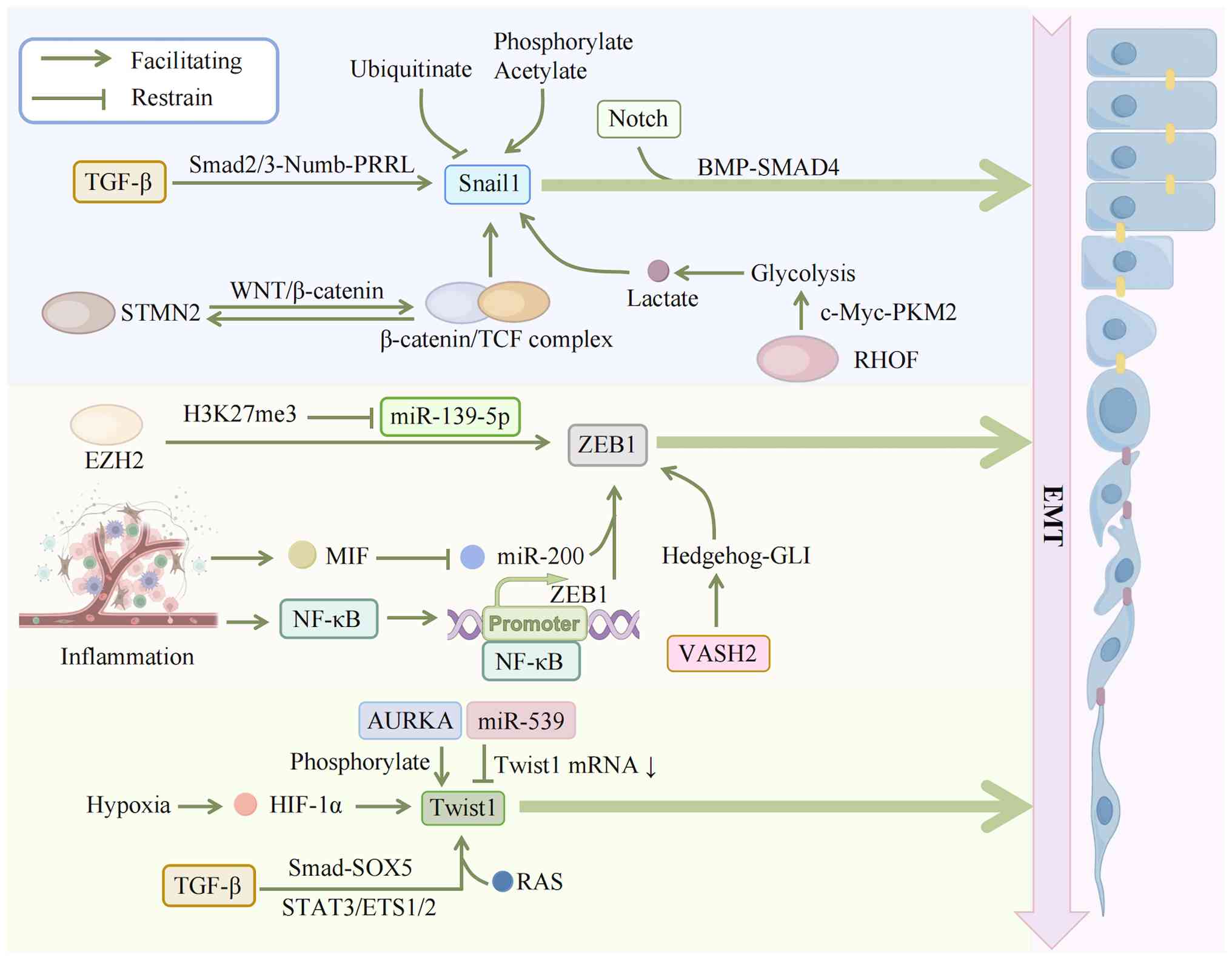 lncRNAs exhibit bidirectional regulatory characteristics: in positive regulation, ZFAS1 maintains EMT activity through an AMPK-ZEB1 positive feedback loop under metabolic stress (160). FGD5-AS1, upregulated by the IL-6/STAT3 pathway, enhances the acetylation of STAT3 by bridging p300 and STAT3, activating the STAT3/NF-κB pathway and inducing M2 macrophage polarization, which reinforces EMT via paracrine TGF-β (161). LINC00842 binds to the inhibitory domain of PGC-1α in a high-glucose environment, maintaining its activity to support EMT-related fatty acid synthesis metabolism (162). In negative regulation, MTSS1-AS accelerates the degradation of MZF1 by promoting the interaction between MZF1 and STUB1, upregulating the EMT suppressor MTSS1 (163). KCNK15-AS1 activates PTEN by mediating REST degradation, inhibiting the expression of Vimentin driven by the PI3K/Akt pathway (164). The newly identified MEG3, as a tumor-suppressive lncRNA, upregulates E-cadherin expression by sponging miR-421 and can also regulate SLFN5 expression by targeting miR-146b-5p, dualistically inhibiting the EMT process (165,166).