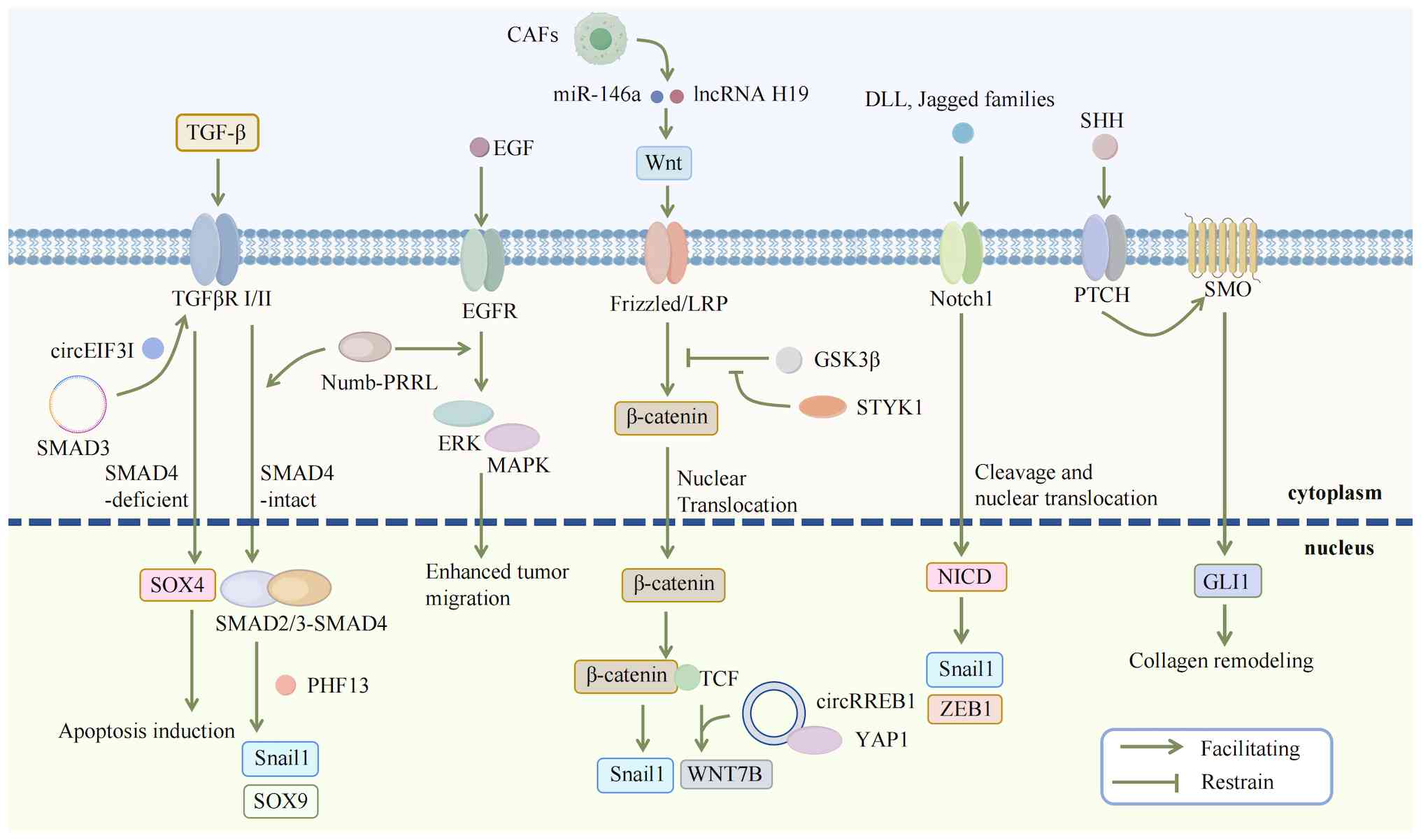 The TGF-β signaling pathway exerts dual effects in EMT of PDAC The switch of its function from early tumor suppression to late metastasis promotion depends on multi-level regulation. In PDAC cells with retained SMAD4, TGF-β activates the SMAD2/3-SMAD4 complex to regulate transcription factors such as Snail and Twist; meanwhile, it maintains the activity of super-enhancers of genes such as SNAI1 and SOX9 with the help of the epigenetic regulator PHF13, ensuring the continuous expression of EMT-related genes (105,106); deletion of SMAD4 disrupts this regulation, converting SOX4 from a pro-tumor factor to a pro-apoptotic molecule, highlighting the decisive effect of SMAD4 on pathway function (105,107). Activation of the TGF-β pathway is regulated by a 'promotion-inhibition' dynamic balance: circEIF3I (CircBase ID: hsa_circ_0011385) promotes pathway activation by enhancing the binding of SMAD3 to TGFβRI (108). Under TGF-β1 stimulation, Numb-PRRL not only activates the SMAD2/3-Snail pathway downstream of the TGF-β signaling pathway to enhance EMT but also forms a cross-activation loop with Notch1 to synergistically strengthen the EMT-promoting effect of this pathway. Notably, Notch inhibitors (such as RO4929097) can block this cross-activation loop, thereby reversing the enhancing effect of Numb-PRRL on the SMAD2/3-Snail pathway (80). Conversely, abnormal expression of TGF-β receptors (TGFβRI/II) disrupts the balance, weakening tumor suppressor function and amplifying pro-metastatic signals (109).