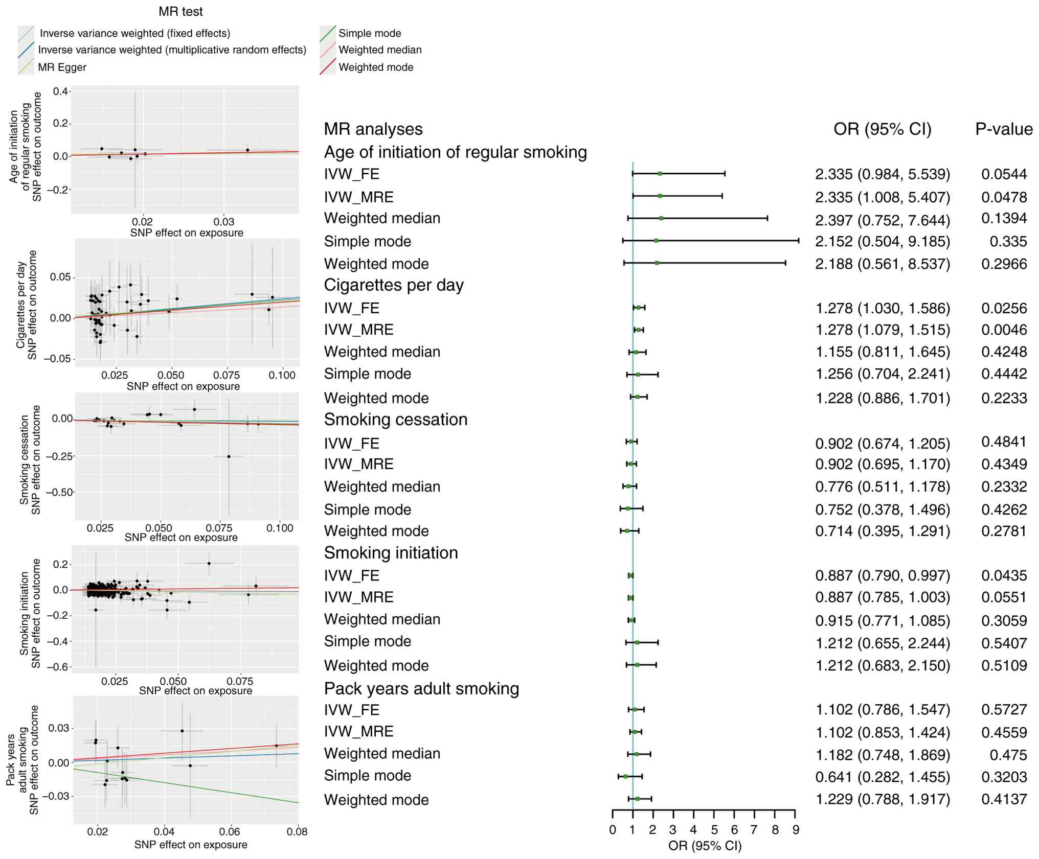 The identification of IVs conformed to three assumptions: Relevance, independence and exclusion restriction. Single-nucleotide polymorphisms (SNPs) with P<5×10−8 and a linkage disequilibrium of r2<0.001 within 10,000-kb windows were selected as IVs for smoking. Palindromic SNPs were harmonized. Finally, 13 SNPs were identified as IVs for pack years of adult smoking. R2 was calculated to reveal the proportion of exposure variation explained by SNPs. The F-statistic was calculated to assess the strength of the association between the SNP and exposure. SNPs with F≥10 were considered as strong genetic instruments and were included in the subsequent analysis.