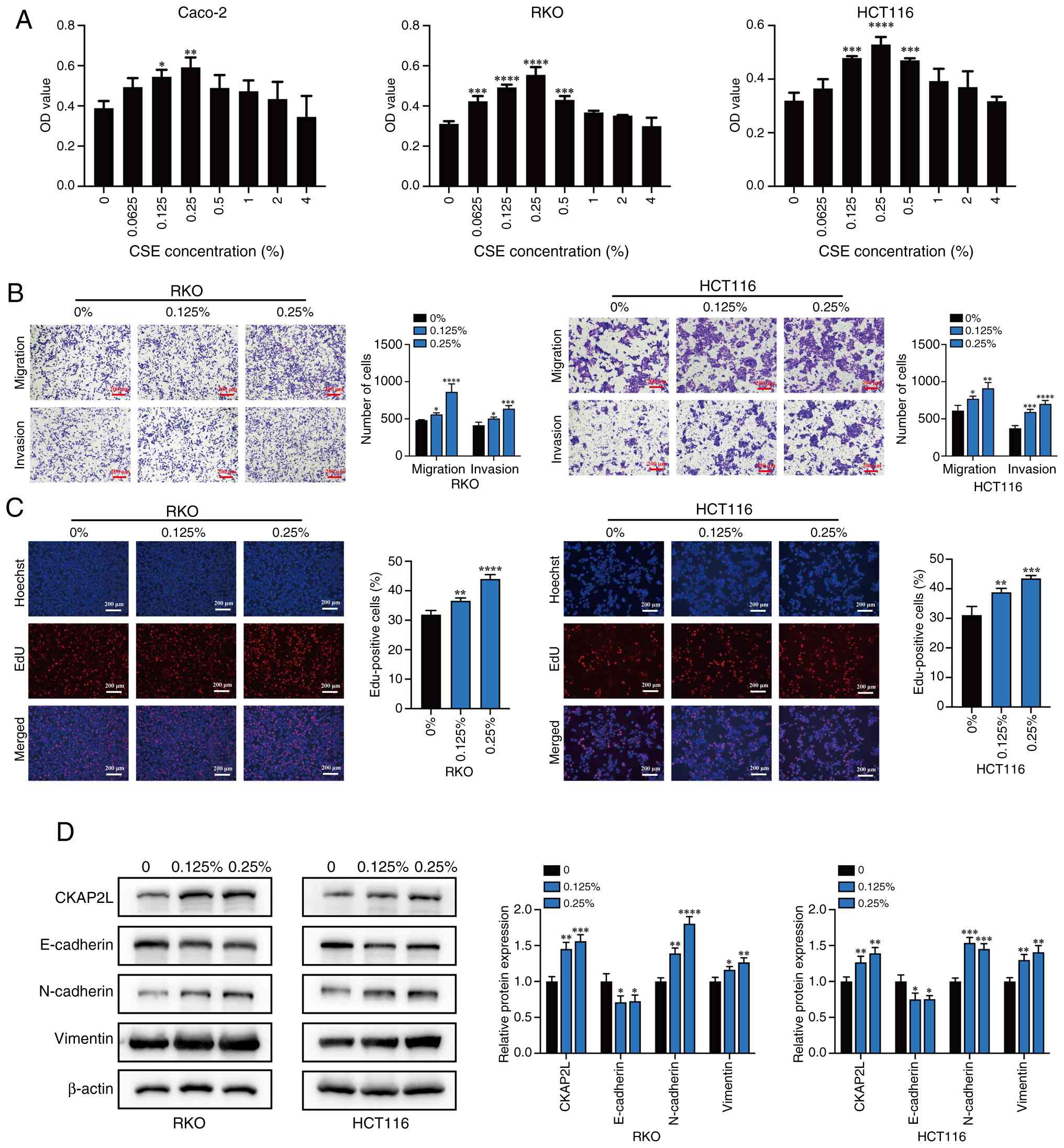 After 4 days of treatment with CSE, compared with that in the control group, treatment with CSE increased cell viability; among all groups, CSE concentrations of 0.125 and 0.25% had the highest capacity to promote cell viability in all three cell lines, as confirmed by CCK8 (Fig. 2A). In groups treated with 4% CSE, cell viability was not significantly promoted. Therefore, in the subsequent experiments, CSE concentrations of 0.125 and 0.25% were selected to establish the chronic smoke exposure model, and were used for functional experiments on RKO and HCT116 cells. Among the three cell lines, RKO and HCT116 cells showed a more significant increase in cell proliferation after short-term CSE treatment, and were selected for subsequent experiments.