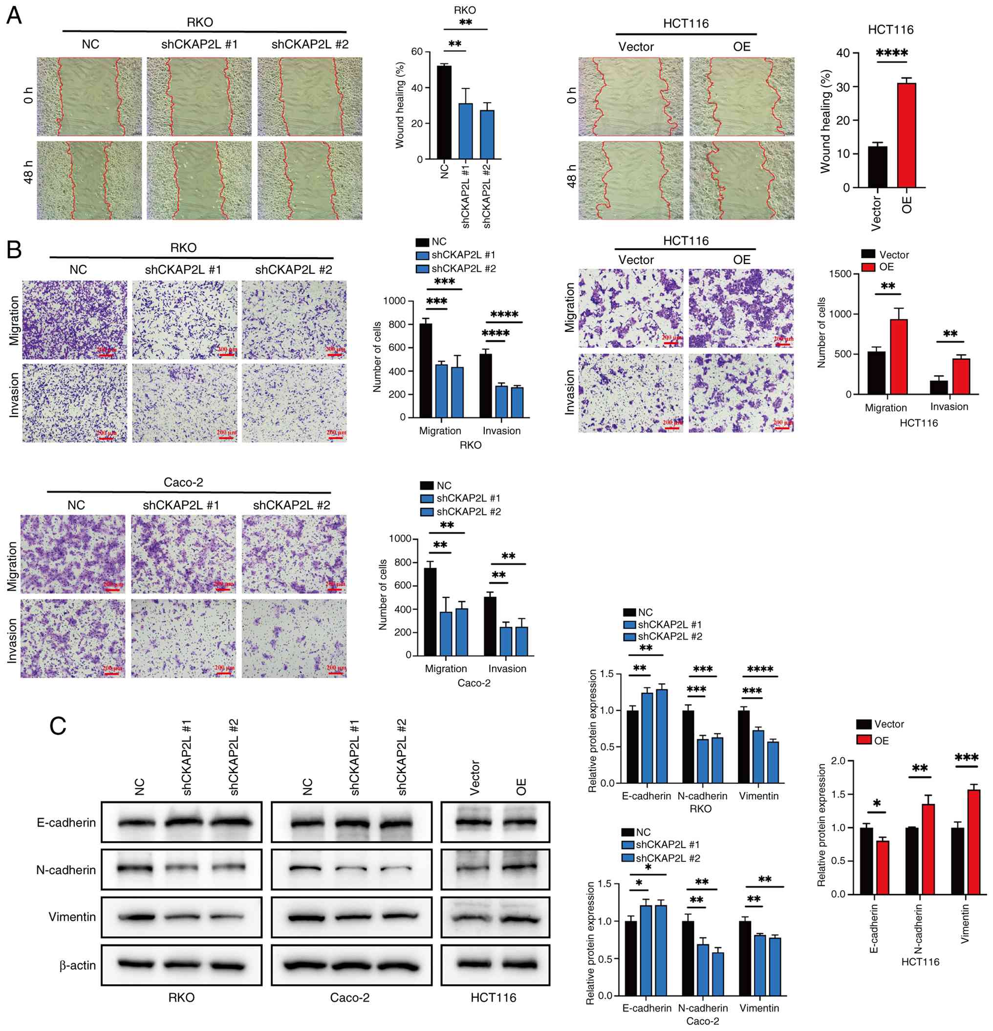 Wound healing assay confirmed that knockdown of CKAP2L inhibited the migratory ability of RKO cells (P<0.05; Fig. 4A). By contrast, promotion of migration was observed in HCT116 cells after CKAP2L overexpression (P<0.05; Fig. 4A). The same trend in migration and invasion was confirmed by Transwell assay (Fig. 4B). Western blotting revealed that knockdown of CKAP2L enhanced E-cadherin expression, and suppressed N-cadherin and Vimentin expression (Fig. 4C), whereas overexpression of CKAP2L showed the opposite trend. These results revealed that CKAP2L may enhance the migration and invasion of CRC cells by promoting EMT.