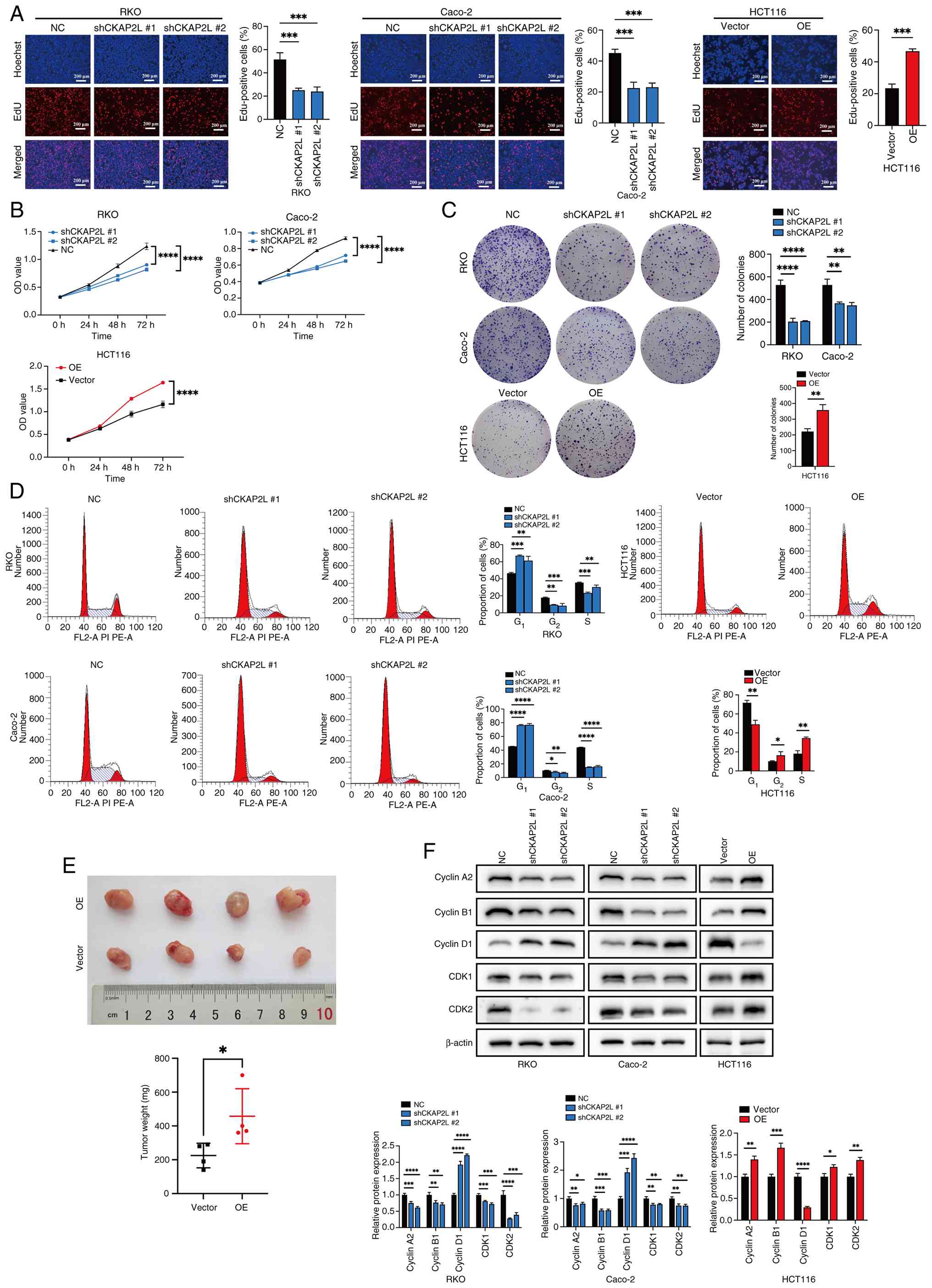 The proliferation of cells in vitro was confirmed by EdU, CCK8 and colony formation assays. Notably, EdU (Fig. 5A), CCK8 (Fig. 5B) and colony formation (Fig. 5C) assays showed that knockdown of CKAP2L significantly suppressed the proliferation of Caco-2 and RKO cells. By contrast, overexpression of CKAP2L promoted the proliferation of HCT116 cells.