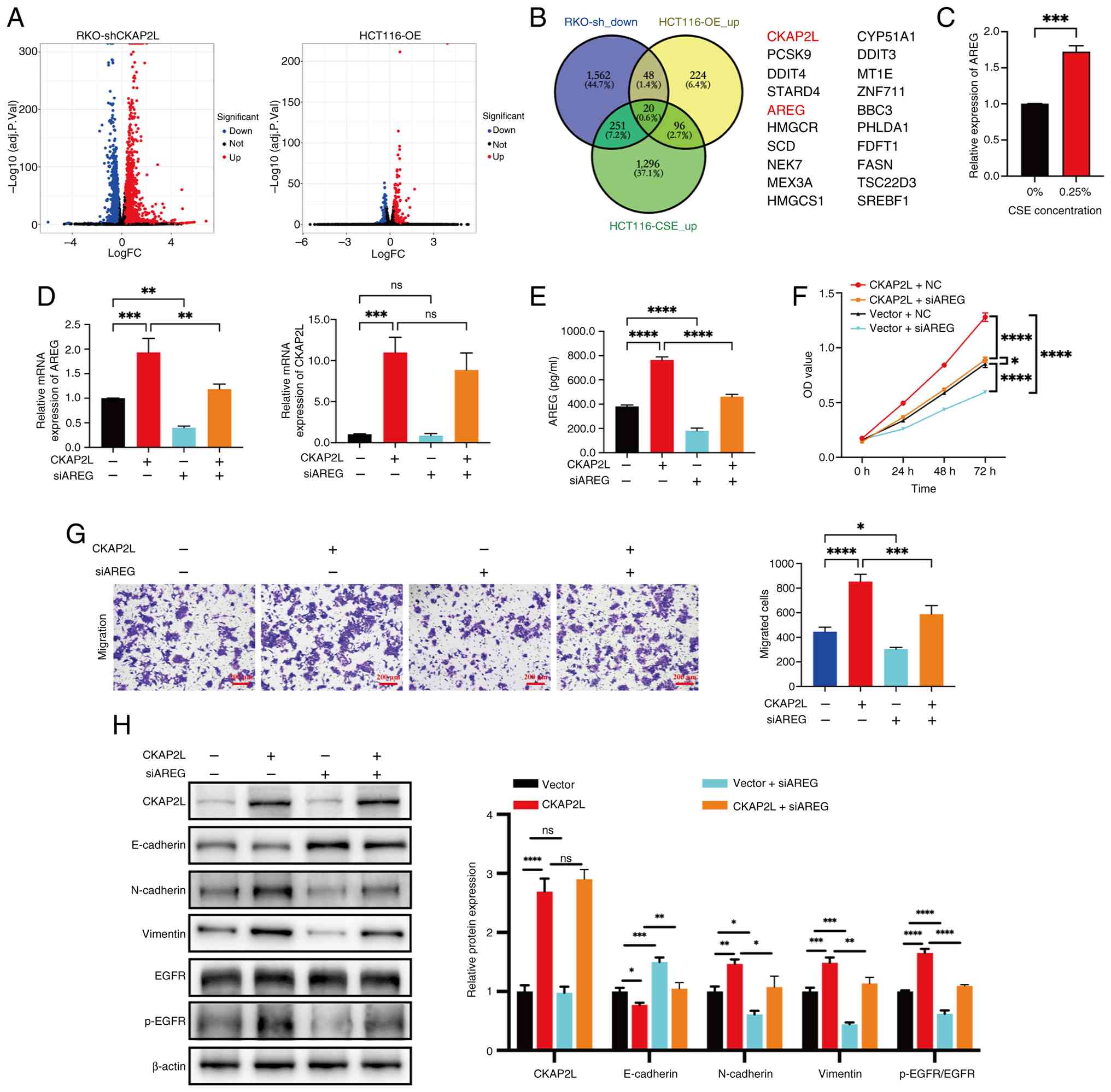 To evaluate whether CKAP2L promotes CRC progression by upregulating the expression of AREG, CCK8 and Transwell assays were conducted. As shown in Fig. 6F, AREG knockdown partially suppressed the enhanced proliferative ratio of CRC cells caused by overexpression of CKAP2L. Transwell assay results confirmed that knockdown of AREG expression decreased the number of migratory cells induced by CKAP2L overexpression (Fig. 6G). Western blotting further confirmed that inhibiting the expression of AREG partially restored the upregulated protein levels of N-cadherin and Vimentin and phosphorylation level of EGFR, and downregulated the protein levels of E-cadherin caused by overexpression of CKAP2L (Fig. 6H). These results suggested that CKAP2L may promote CRC progression by activating the AREG/EGFR pathway.