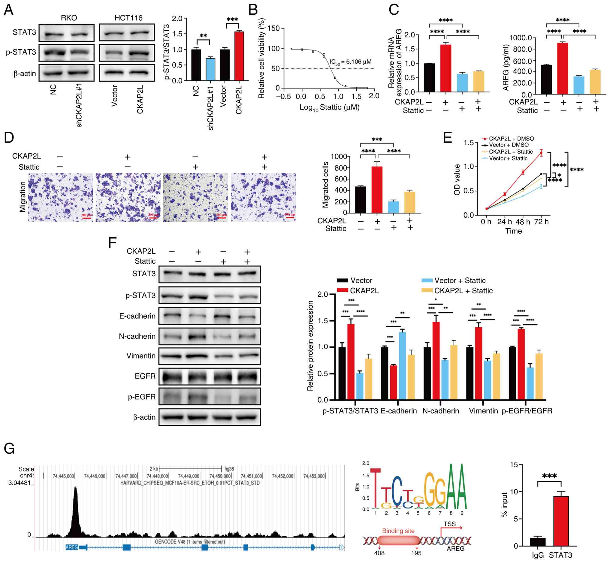 After overexpression of CKAP2L, the phosphorylation level of STAT3 increased, whereas the opposite occurred when CKAP2L was knocked down, as determined by western blotting (Fig. 7A). To explore whether CKAP2L promotes CRC progression by enhancing STAT3 phosphorylation, the STAT3 phosphorylation inhibitor Stattic was used. After culturing HCT116 cells in medium containing Stattic for 24 h, cell proliferation was measured using CCK8 to calculate the IC50; the results showed that the IC50 of Stattic was 6.106 μM (Fig. 7B). Both RT-qPCR and ELISA confirmed that Stattic inhibited AREG levels enhanced by CKAP2L overexpression (Fig. 7C). Furthermore, Transwell and CCK8 assays indicated that treatment with Stattic inhibited the migration and proliferation of HCT116 cells enhanced by overexpression of CKAP2L (Fig. 7D and E). Western blotting revealed that suppression of STAT3 phosphorylation inhibited the protein expression levels of N-cadherin and Vimentin and the phosphorylation level of EGFR enhanced by CKAP2L overexpression, and restored the expression level of E-cadherin downregulated by CKAP2L overexpression (Fig. 7F). These results indicated that CKAP2L may promote AREG expression by increasing the phosphorylation of STAT3.