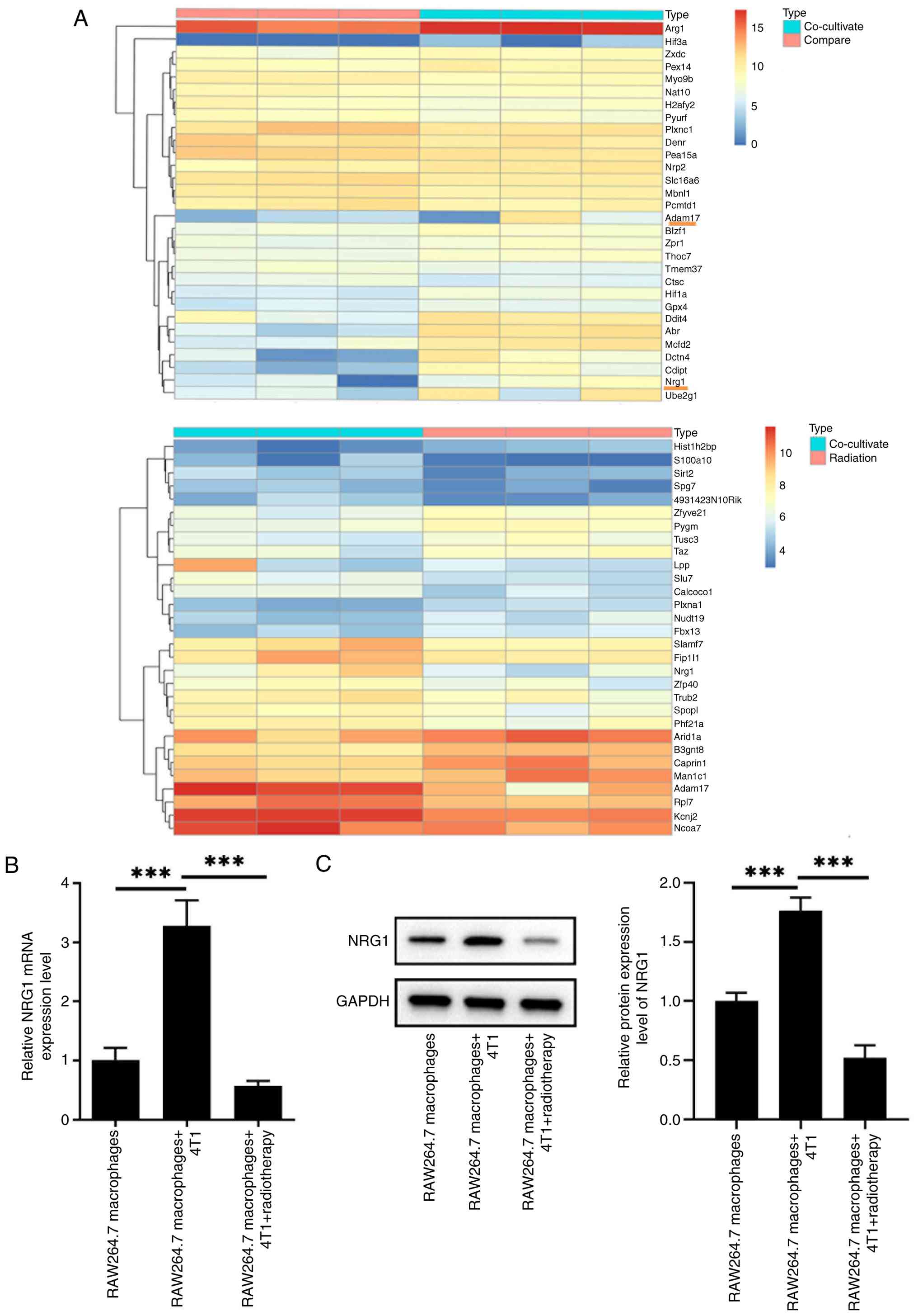 Through next-generation RNA sequencing analysis, NRG1 expression was found to be increased in RAW264.7 macrophages co-cultured with 4T1 cells. By contrast, radiotherapy treatment markedly suppressed NRG1 expression (Fig. 1A). These findings were further confirmed by RT-qPCR and immunoblotting analysis. Compared with the RAW264.7 macrophages group, both the mRNA and protein expressions of NRG1 in RAW264.7 macrophages were markedly increased following the co-culture with 4T1 cells, whereas radiotherapy treatment effectively reversed these changes (Fig. 1B and C).
