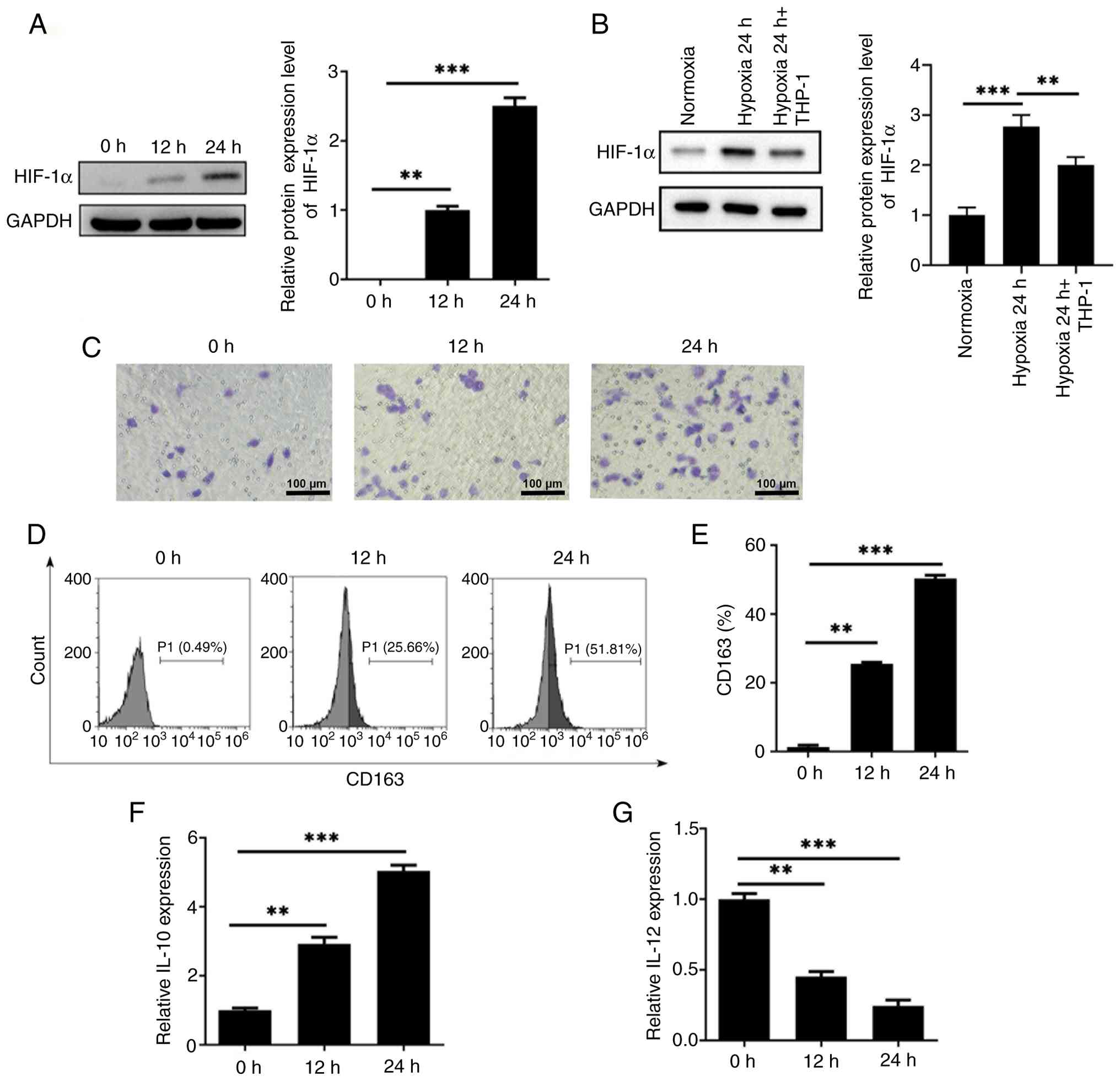 Under hypoxic conditions, the protein expression of HIF-1α in MDA-MB-231 cells was assessed using immunoblotting analysis. As shown in Fig. 2A, HIF-1α protein level progressively increased with prolonged hypoxia exposure (0, 12 and 24 h). Based on this observation, MDA-MB-231 cells pre-treated with hypoxia for 24 h were subsequently co-cultured with THP-1-derived macrophages for another 24 h. Following co-culture, the increased HIF-1α expression induced by hypoxia was markedly decreased, yet remained above normoxic control (Fig. 2B). Transwell assays demonstrated that the migration of THP-1 macrophages was markedly increased after co-culture with hypoxia-pretreated MDA-MB-231 cells (Fig. 2C). Flow cytometry analysis further showed that hypoxia stimulation increased the expression of CD163, a well-established M2 macrophage marker, in a time-dependent manner (Fig. 2D and E). IL-12 is a cytokine associated with the M1 phenotype, while IL-10 is indicative of M2 polarization. In addition, ELISA results revealed that hypoxia promoted IL-10 secretion while concomitantly reducing IL-12 production in THP-1 macrophages (Fig. 2F and G). Taken together, these findings suggested that hypoxic MDA-MB-231 cells could facilitate the M2 polarization of THP-1-derived macrophages.