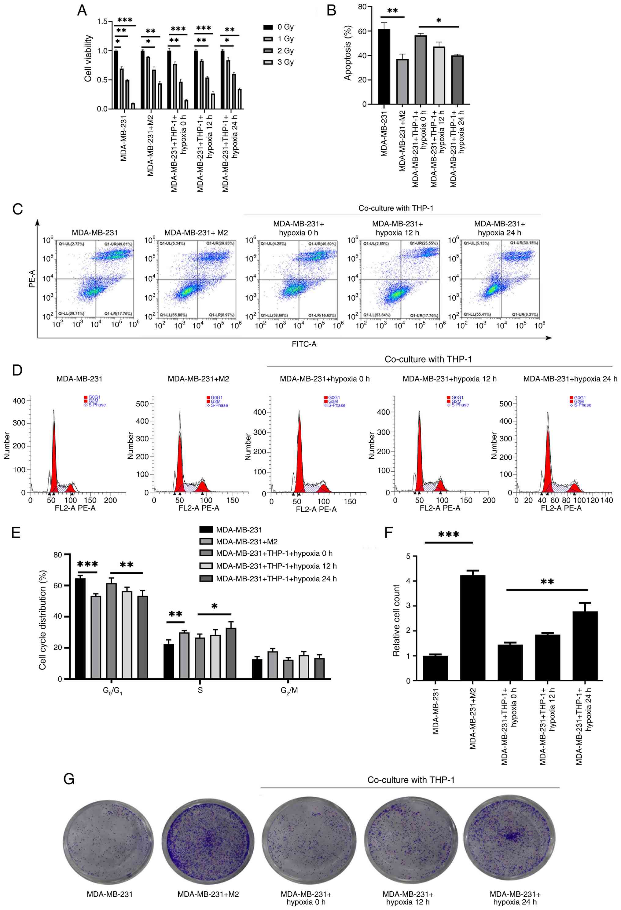 To investigate the radio-resistance of MDA-MB-231 cells, all cells were exposed to X-ray irradiation at doses of 1, 2 and 3 Gy. Given that hypoxic conditions can induce the differentiation of M0 macrophages into M2 macrophages, MDA-MB-231 cells were co-cultured with THP-1 macrophages under hypoxia for varying durations. The cells were divided into MDA-MB-231, MDA-MB-231 + M2, MDA-MB-231 + THP-1 + hypoxia 0 h, MDA-MB-231 + THP-1 + hypoxia 12 h and MDA-MB-231 + THP-1 + hypoxia 24 h groups. MDA-MB-231 cell viability was first assessed using the MTT assay. Compared with the 0 Gy group, MDA-MB-231 cell viability was reduced with increasing radiation dose, whereas co-culture with M2 macrophages conferred the strongest radiation resistance (Fig. 3A). Based on these findings, subsequent experiments were conducted using 2 Gy radiation. Flow cytometry revealed that M2 polarization markedly inhibited the apoptosis of MDA-MB-231 cells. Moreover, hypoxic co-culture with THP-1 macrophages suppressed apoptosis in a time-dependent manner compared with the MDA-MB-231 + THP-1 + hypoxia 0 h group (Fig. 3B and C). To assess whether the reduced apoptosis was associated with altered cell proliferation, cell-cycle distribution was analyzed by flow cytometry. The results showed that M2 polarization markedly increased the proportion of cells in S phase while decreasing the proportion in G0/G1 phase, suggesting accelerated DNA synthesis and proliferation potential. Similarly, hypoxic co-culture with THP-1 macrophages increased the S-phase fraction in a time-dependent manner (Fig. 3D and E). In addition, colony formation assays demonstrated that M2 polarization greatly increased the number of colonies compared with the MDA-MB-231 group and hypoxic co-culture with THP-1 macrophages further promoted clonogenic survival (Fig. 3F-G).