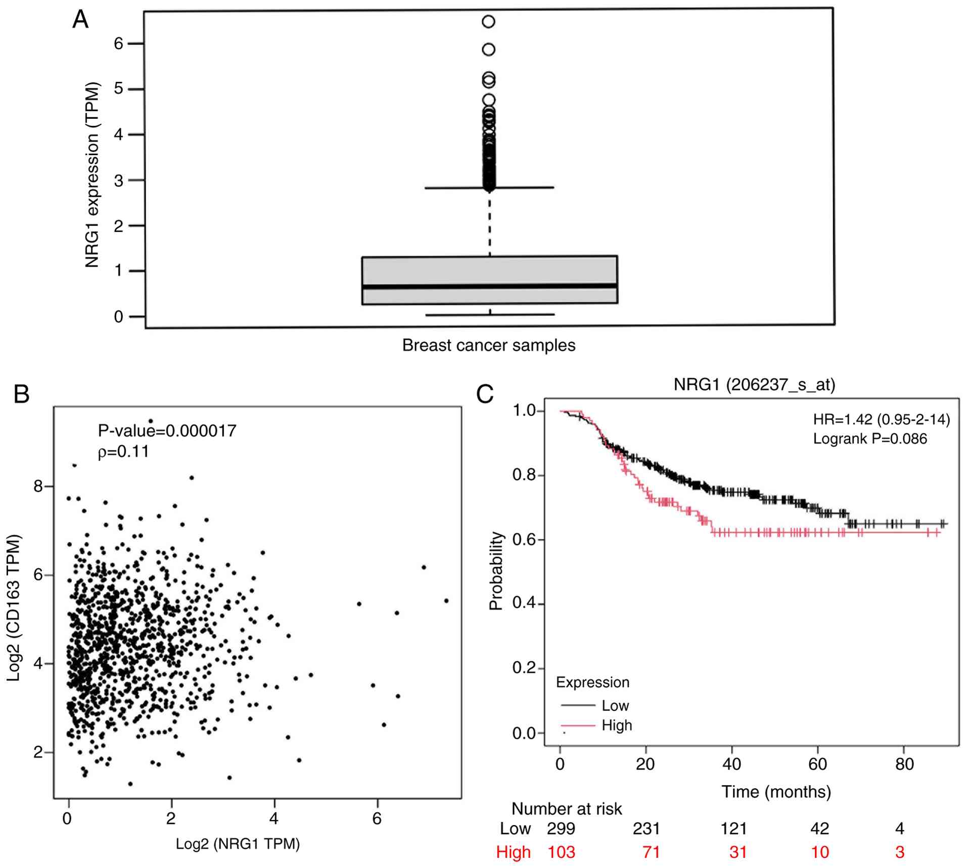 To explore the expressions of CAMTA1 and NRG1 in BC and validate their association with macrophage polarization, several public databases were used. Gene expression levels of CAMTA1 and NRG1 in The Cancer Genome Atlas-Breast Invasive Carcinoma (TCGA-BRCA) samples were obtained from the UCSC Xena platform (https://xenabrowser.net/). Spearman's correlation between CAMTA1 and NRG1 was analyzed using R software (v4.2.2; https://www.r-project.org/). The correlation between NRG1 expression and M2 macrophage marker CD163 was assessed via the Gene Expression Profiling Interactive Analysis (GEPIA)2 platform (http://gepia2.cancer-pku.cn/) based on TCGA-BRCA tumor data. Kaplan-Meier survival analysis was performed using the KMplot database (https://kmplot.com) with the overall survival in Affymetrix breast cancer cohorts stratified by NRG1 expression.