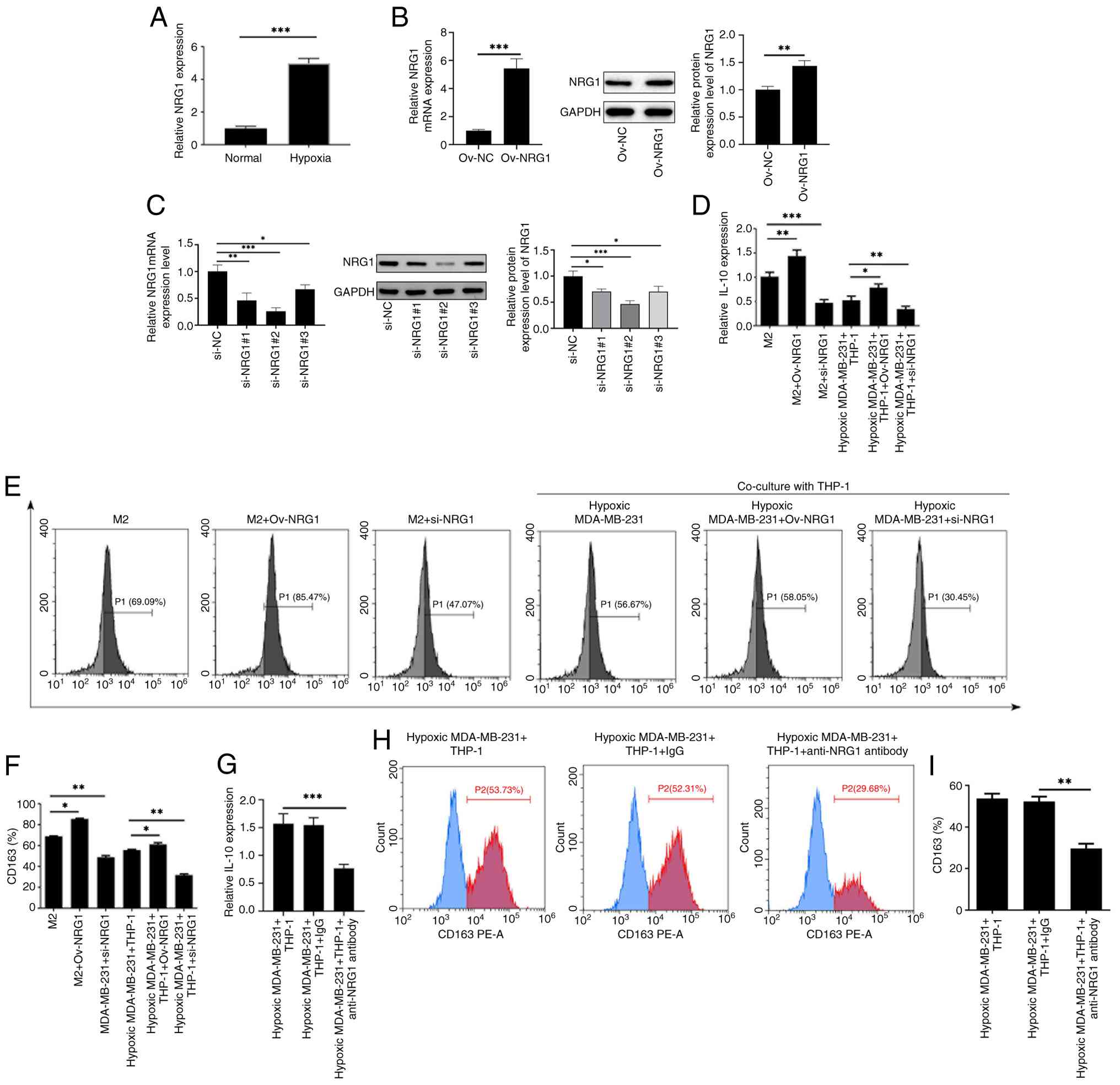 To assess the effects of hypoxia on NRG1 expression, MDA-MB-231 cells were exposed to hypoxia for 24 h and co-cultured with THP-1 macrophages. RT-qPCR analysis revealed that hypoxia markedly upregulated NRG1expression compared with the Normoxia group (Fig. 5A). To upregulate or downregulate NRG1 expression, Ov-NRG1 or si-NRG1 was transfected into cells and the transfection efficacy was examined using RT-qPCR and immunoblotting analysis (Fig. 5B and C). si-NRG1#2 (hereinafter referred as si-NRG1) was selected for subsequent experiments due to its more prominent transfection efficacy. Then, the cells were assigned into M2, M2 + Ov-NRG1, M2 + si-NRG1, Hypoxic MDA-MB-231 + THP-1, Hypoxic MDA-MB-231 + THP-1 + Ov-NRG1 and Hypoxic MDA-MB-231 + THP-1 + si-NRG1 groups. ELISA results showed that Ov-NRG1 elevated IL-10 secretion, whereas si-NRG1 reduced IL-10 level compared with the M2 or Hypoxic MDA-MB-231 + THP-1 groups (Fig. 5D). Consistently, flow cytometry analysis demonstrated that CD163 expression was increased by Ov-NRG1 and decreased by si-NRG1 (Fig. 5E and F). To further verify whether the reduction in IL-10 was specifically attributable to impaired NRG1 signaling, hypoxic MDA-MB-231/THP-1 co-cultures were treated with an anti-NRG1 blocking antibody. Cells were divided into Hypoxic MDA-MB-231 + THP-1, Hypoxic MDA-MB-231 + THP-1 + IgG and Hypoxic MDA-MB-231 + THP-1 + anti-NRG1 antibody groups. Blocking NRG1 markedly decreased IL-10 secretion (Fig. 5G) and consistently reduced CD163 expression (Fig. 5H and I). These findings indicated that hypoxia-induced NRG1 upregulation is a key driver of M2 macrophage polarization, at least in part by enhancing IL-10 secretion and CD163 expression.