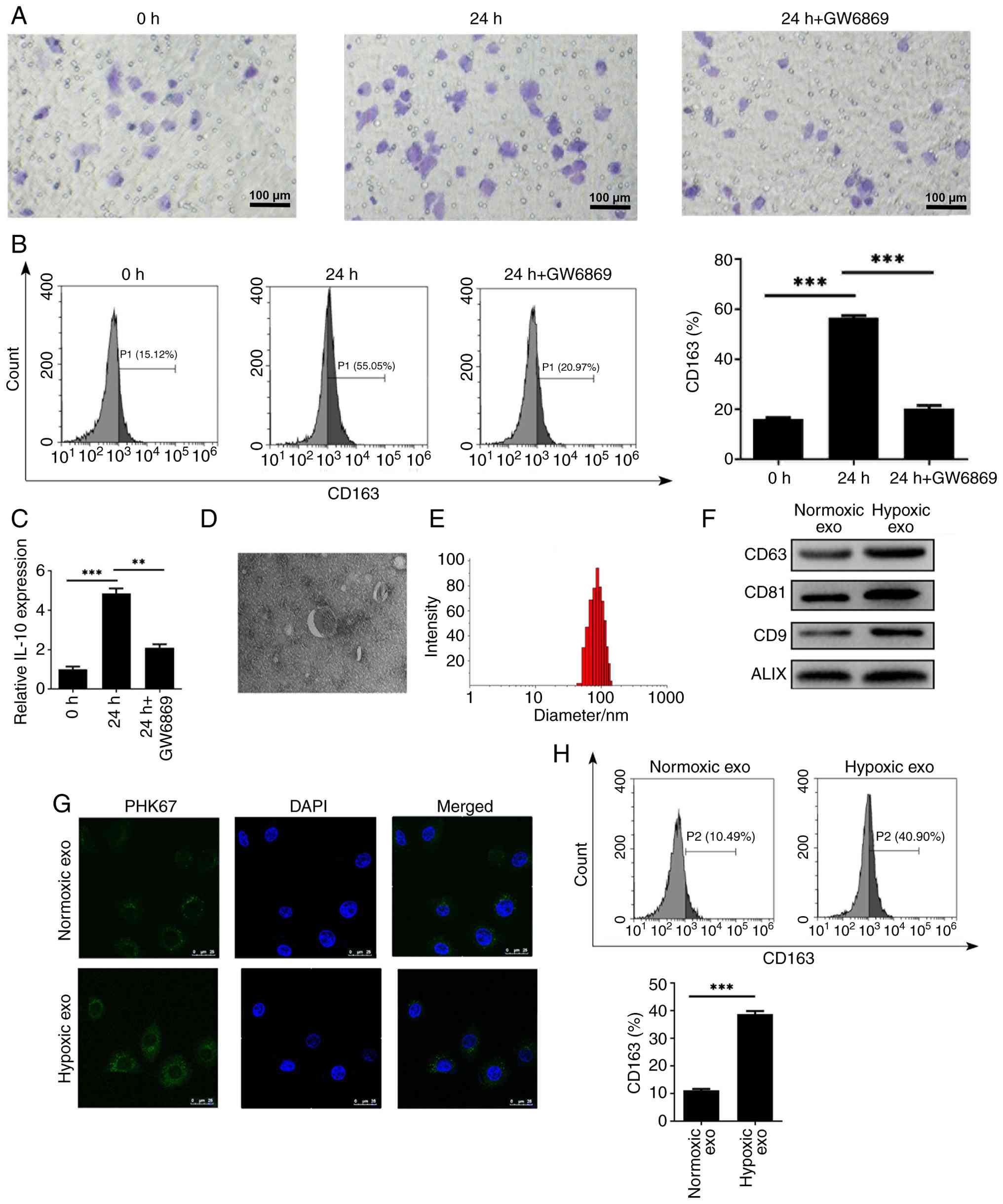 In the tumor microenvironment, macrophages play crucial roles in tumor initiation and progression. To investigate whether exosomes contribute to M2 polarization, MDA-MB-231 cells were treated with the exosome biogenesis inhibitor GW4869 and then co-cultured with THP-1 macrophages. Transwell assays showed that hypoxic MDA-MB-231 cells markedly enhanced the migration of THP-1 macrophages, whereas this effect was notably attenuated by GW4869 treatment (Fig. 6A). Moreover, GW4869 treatment markedly reduced CD163 expression and IL-10 secretion, suggesting that exosomes derived from hypoxic MDA-MB-231 cells are pivotal in promoting M2 polarization (Fig. 6B and C). Transmission electron microscopy further revealed abundant exosomes with typical bilayer membrane structures in the supernatant of hypoxic MDA-MB-231 cells. Nanoparticle size analysis showed that the average exosome diameter was ~100 nm (Fig. 6D and E). Immunoblotting analysis confirmed the presence of exosomal marker proteins CD9, ALIX, CD63 and CD81 in exosome extracts (Fig. 6F).