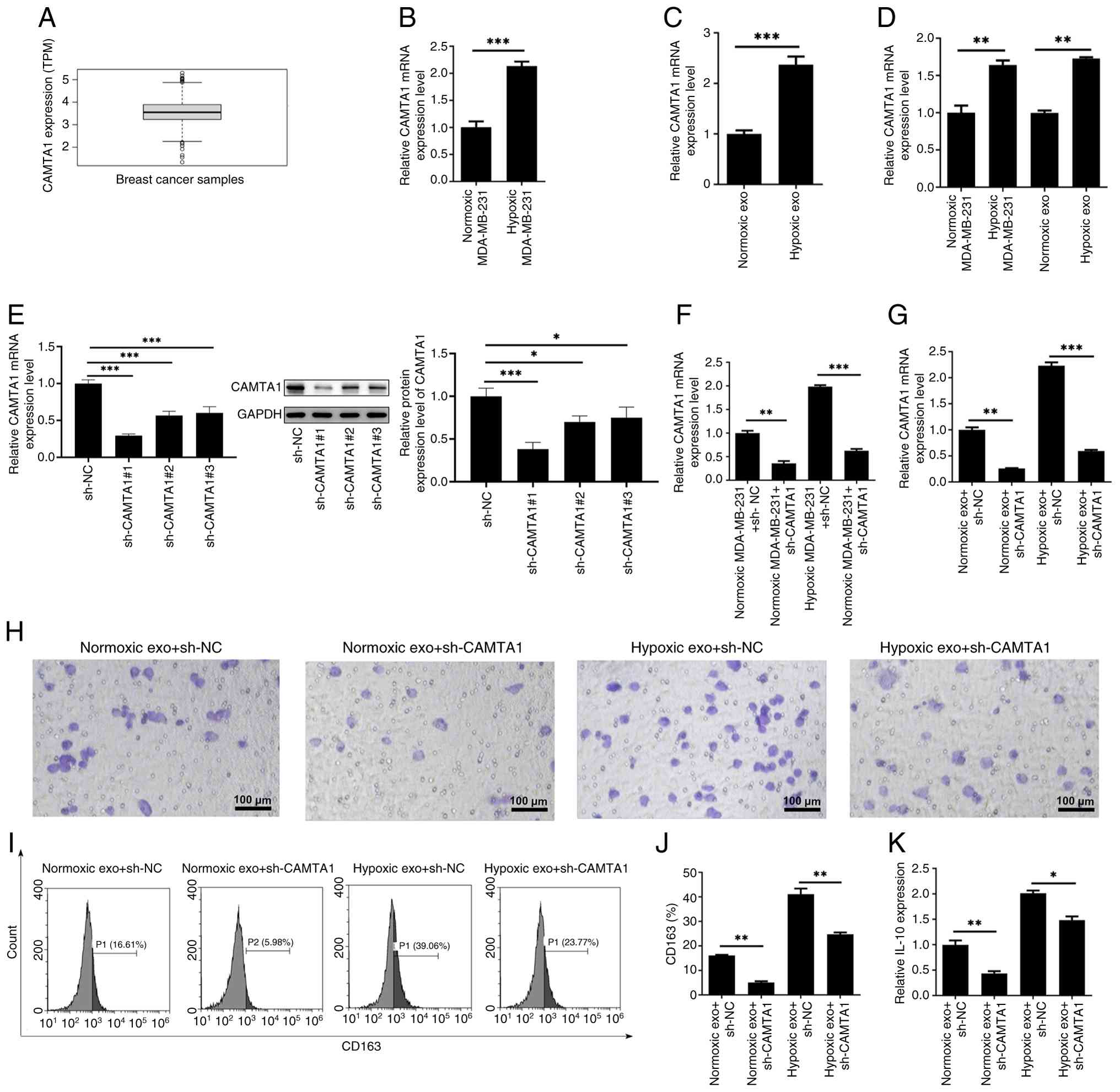 Analysis of the TCGA database revealed that CAMTA1 expression was markedly elevated in BC samples (Fig. 7A). Consistently, RT-qPCR results showed that hypoxic stimulation markedly increased CAMTA1 expression in both MDA-MB-231 cells and their secreted exosomes (Fig. 7B and C). Furthermore, co-culture experiments demonstrated a substantial increase in CAMTA1 expression with recipient THP-1 macrophages after exposure to hypoxia-derived exosomes (Fig. 7D). To reduce CAMTA1 expression, sh-CAMTA1 was transfected into MDA-MB-231 cells and the transfection efficacy was examined using RT-qPCR and immunoblotting analysis (Fig. 7E). sh-CAMTA1#1 (hereinafter referred as sh-CAMTA1) was selected for subsequent experiments due to its improved transfection efficacy. As Fig. 7F and G shows, CAMTA1 expression was markedly reduced in both MDA-MB-231 cells and exosomes following the transfection of sh-CAMTA1. Exosomes from CAMTA1-silenced MDA-MB-231 cells were then incubated with THP-1 macrophages and then divided into Normoxic MDA-MB-231 + exo + sh-NC, Normoxic MDA-MB-231 + exo + sh-CAMTA1, Hypoxic MDA-MB-231 + exo + sh-NC and Hypoxic MDA-MB-231 + exo + sh-CAMTA1 groups. Functional assays revealed that CAMTA1 knockdown markedly impaired the migration of THP-1 macrophages (Fig. 7H). Moreover, CAMTA1 depletion also led to a notable reduction in the expressions of CD163 and IL-10 (Fig. 7I-K).