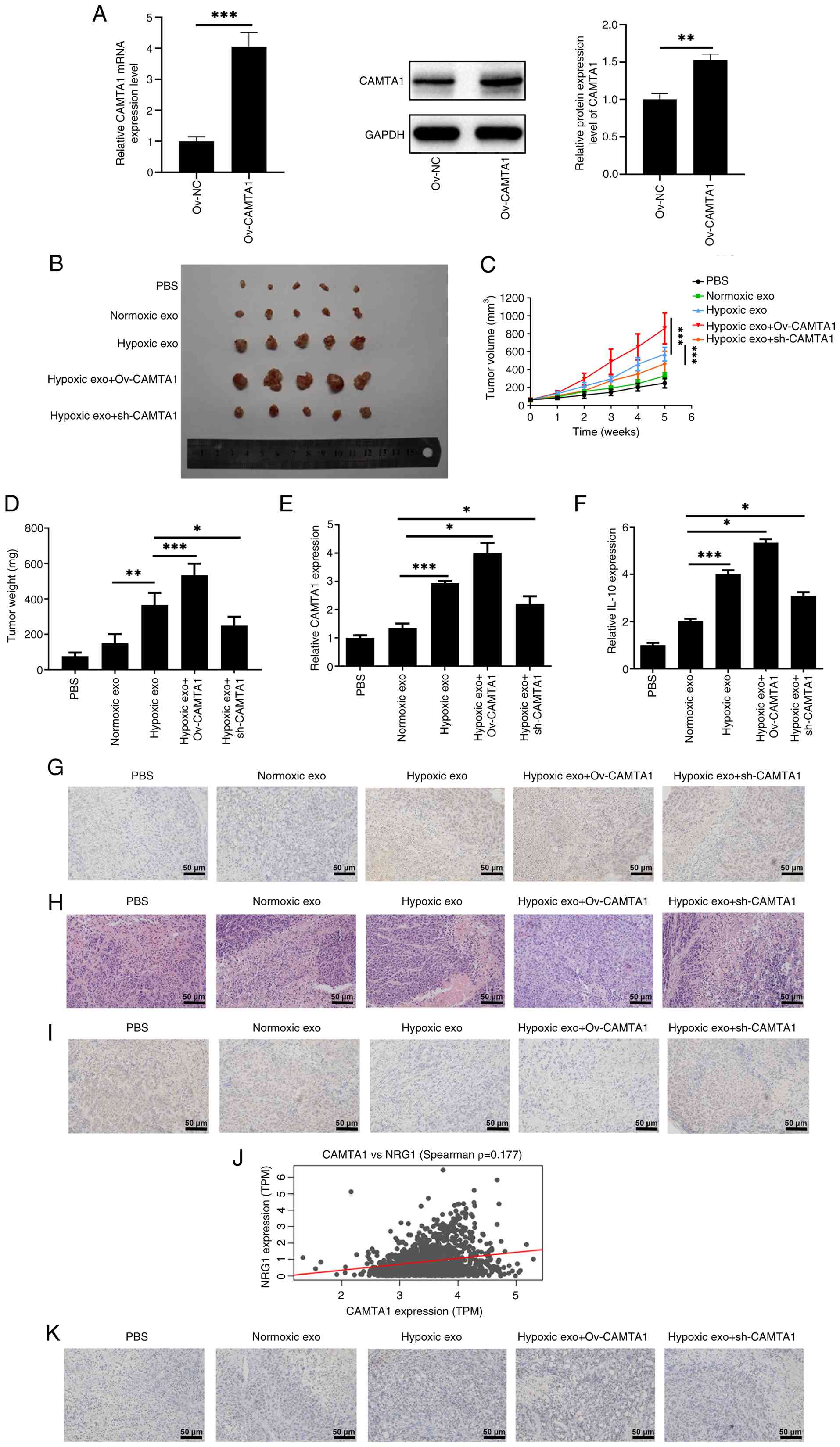 All animal experiments approved by the Animal Ethics Committee of Jiangsu Cancer Hospital and Jiangsu Institute of Cancer Research and The Affiliated Cancer Hospital of Nanjing Medical University and conducted in compliance with the National Institutes of Health Guide for the Care and Use of Laboratory Animals (approval no. IACUC-20210216-01). A total of 50 female BALB/c nude mice (4-5 weeks old, weighing 18-22 g) were obtained from Beijing Vital River Laboratory Animal Technology Co., Ltd.. Mice were housed under SPF conditions at a controlled temperature of 22±2°C, relative humidity of 50-60%, and a 12-h light/dark cycle, with free access to food and water. The mice were subcutaneously injected with 1×106 MDA-MB-231 cells transfected with sh-CAMTA1 or Ov-CAMTA1 and then randomly divided into five groups (n=10): PBS, Normoxic exo, Hypoxic exo, Hypoxic exo + Ov-CAMTA1 and Hypoxic exo + sh-CAMTA1 groups. Mice in PBS group received 30 μl PBS, while mice in remaining groups were treated with 30 μg exosomes. Local radiotherapy in the tumors was performed for consecutive 5 days (2 Gy/d). The tumor growth was monitored every week. After five weeks, the mice were sacrificed by intraperitoneal injection of pentobarbital sodium (150 mg/kg). Death was confirmed based on the disappearance of pain response, no response when pressing the toes with hands or forceps and observation of cardiac and respiratory arrest. Tumor tissues were removed, images captured and collected for histological and immunohistochemistry analysis.