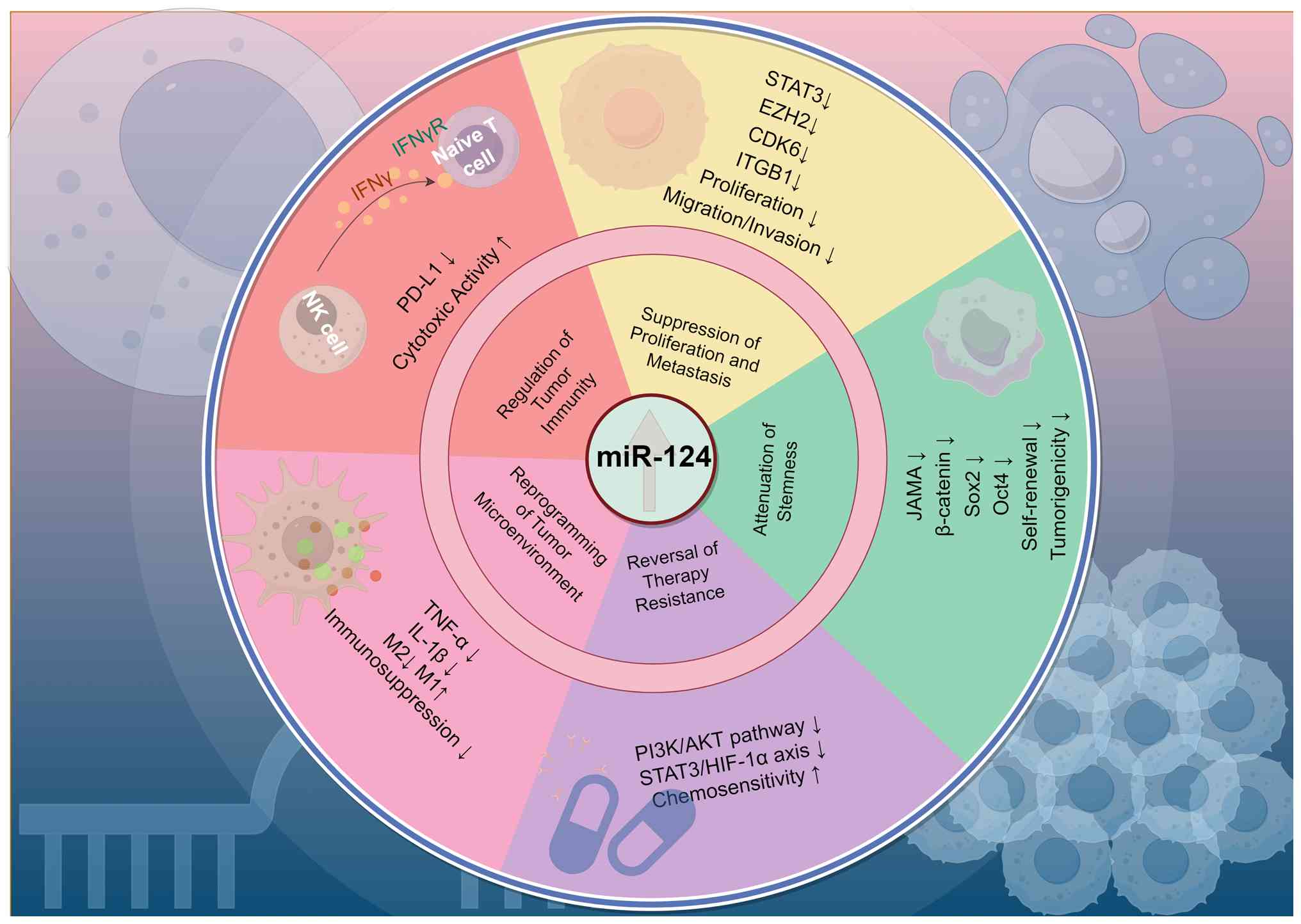 miR-124, a broad-acting tumor suppressor, plays a crucial role in tumorigenesis and cancer progression, as evident by its consistent downregulation in various human cancers (3,8). miR-124 is involved in numerous biological processes during tumorigenesis and progression, attributed to its multifaceted regulatory capabilities. It directly inhibits the proliferation, migration and invasion of tumor cells. Furthermore, miR-124 exerts tumor-suppressive effects across multiple fronts by modulating cancer stemness, drug sensitivity, TME remodeling and immune responses. This chapter systematically elucidates the roles and mechanisms underlying miR-124 in tumor growth, metastasis, stemness maintenance, drug resistance, microenvironment regulation and immune modulation. It also elaborates on its complex regulatory network, thereby providing a theoretical foundation for developing miR-124-based diagnostic and therapeutic strategies.