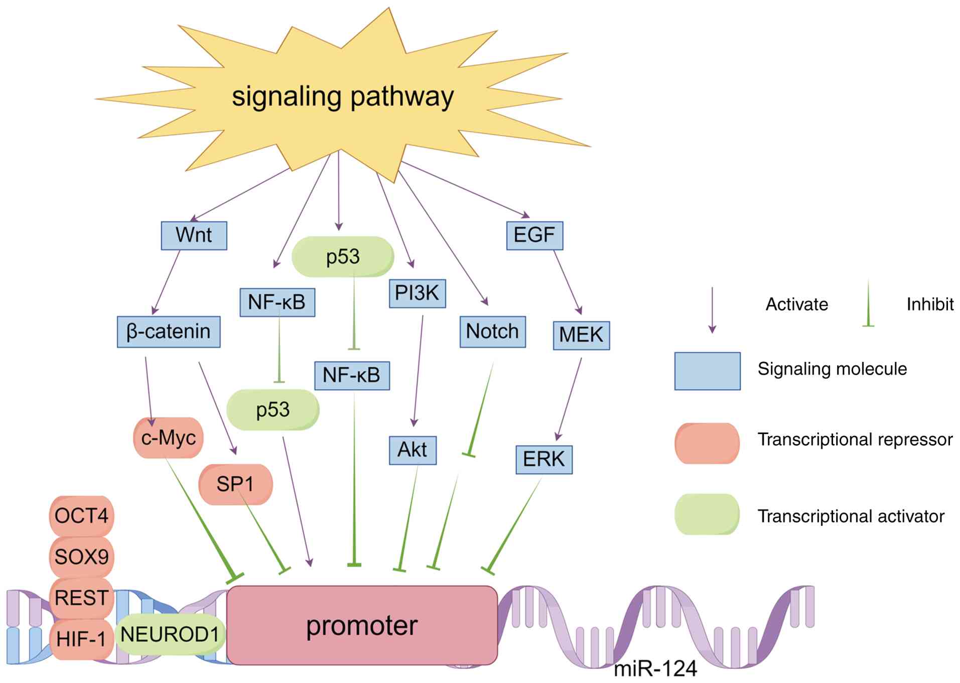 In summary, miR-124 expression in tumors is meticulously regulated by a complex, finely tuned multi-layered regulatory network. The frequent silencing of this molecule results from direct suppression by oncogenic transcription factors, such as c-Myc and HIF-1α, the functional loss of tumor suppressors, such as p53, and collaborative suppression through numerous signaling pathways, including Wnt/β-catenin, PI3K/Akt and NF-κB. There is extensive crosstalk between these regulatory elements. For instance, the p53-miR-124 axis regulates NF-κB while concurrently inhibiting miR-124 expression. Furthermore, signaling pathways such as Wnt and PI3K/Akt can activate transcription factors, including c-Myc and SP1, which subsequently increase the transcriptional repression of miR-124, thereby establishing a multi-layered regulatory network. A comprehensive analysis of the composition and dynamic regulation of this network will clarify the crucial role of miR-124 in tumorigenesis and provide a theoretical basis for developing restorative therapeutic strategies targeting this regulatory system.
