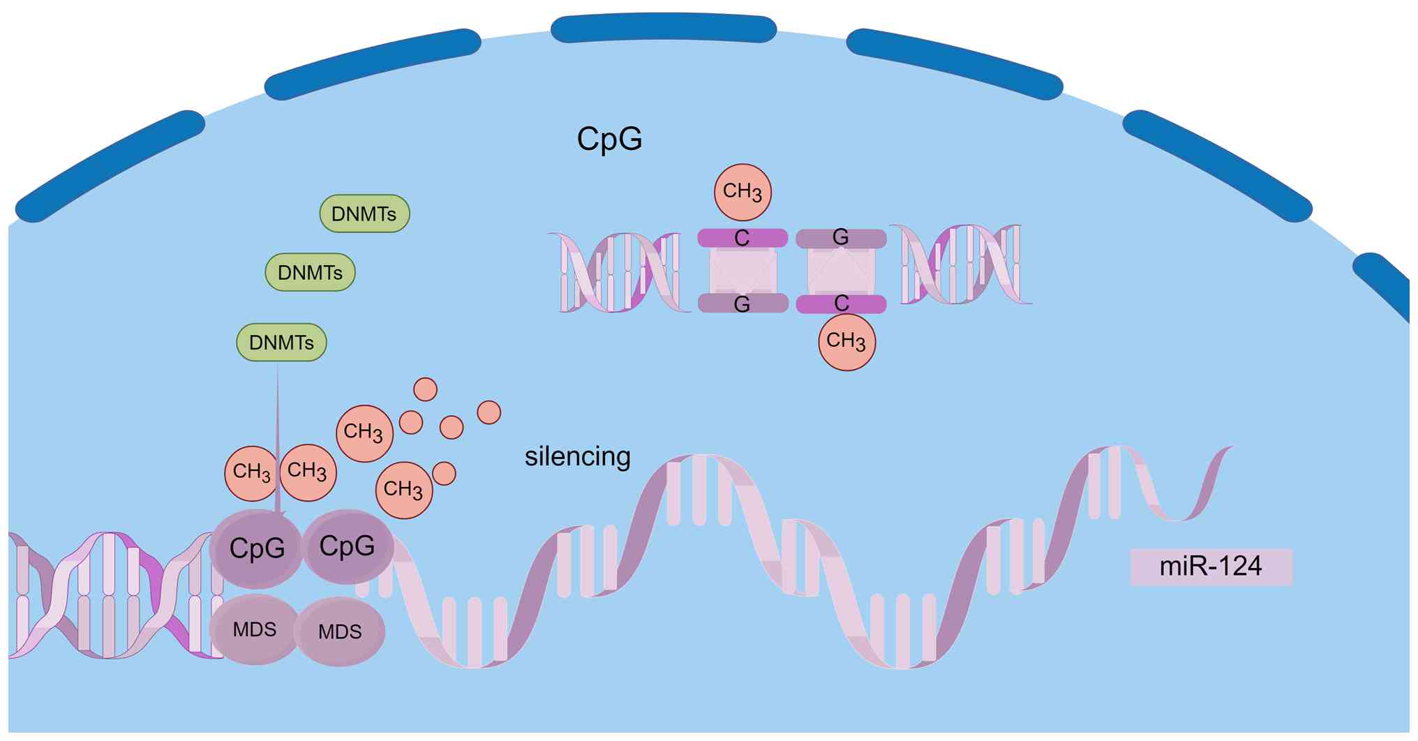 Hypermethylation of CpG islands in the promoter region of the miR-124 gene is primarily responsible for its transcriptional silencing. DNA methyltransferases facilitate the formation of 5-methylcytosine (5-mC), which directly obstructs the binding of transcription factors to promoter regions. Furthermore, 5-mC recruits repressive complexes, including methyl-CpG-binding domain proteins, leading to chromatin condensation and subsequent gene silencing. The molecular mechanism underlying this epigenetic silencing is illustrated in Fig. 3. Research has demonstrated that miR-124 expression is silenced through promoter hypermethylation, a critical epigenetic mechanism, in various cancers, including pancreatic adenocarcinoma, cutaneous T-cell lymphoma and oral squamous cell carcinoma. This silencing promotes malignant progression and underscores its potential as a diagnostic biomarker (98-100).