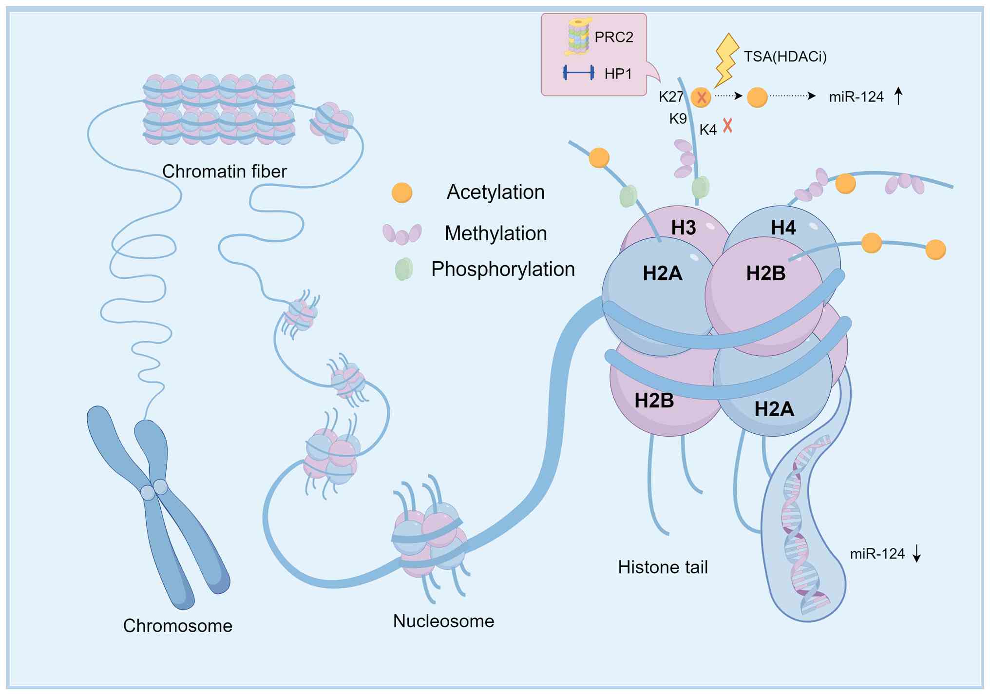 Histone modifications play a direct, crucial role in the transcriptional silencing of miR-124. In acute lymphoblastic leukemia, the miR-124 locus, including miR-124-1, miR-124-2 and miR-124-3, exhibits a characteristic repressive histone modification profile. This profile is characterized by enrichment of repressive histone marks and depletion of activating marks. Particularly, elevated levels of repressive histone modifications, including H3K9me2, H3K9me3 and H3K27me3, facilitate the recruitment of complexes, such as heterochromatin protein 1 and Polycomb repressive complex 2, thereby promoting heterochromatin formation. Simultaneously, a significant reduction in activating marks, including H3K4me3 and acetylated histone H3 (AcH3), maintains a transcriptionally repressed state. Functionally, the histone deacetylase inhibitor trichostatin A can reverse the loss of AcH3 and partially restore miR-124 expression. This mechanism of histone modification-mediated regulation is illustrated in Fig. 4. These histone modifications synergize with DNA methylation mechanisms, establishing a feedback loop that stably silences miR-124. Consequently, this silencing leads to aberrant expression of its target gene, CDK6, contributing to leukemia progression (101).