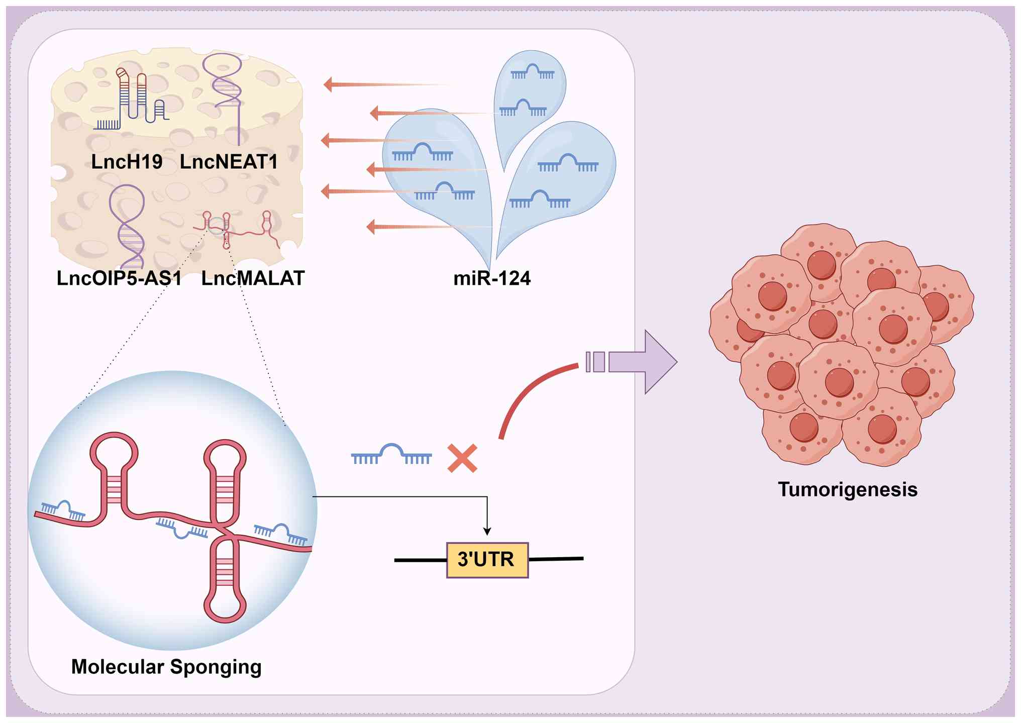 Research has demonstrated that the functional activity of miR-124 is influenced by post-transcriptional regulation of lncRNAs via a ceRNA mechanism (102). Numerous lncRNAs, including H19 imprinted maternally expressed transcript (103), nuclear paraspeckle assembly transcript 1 (104), OIP5 antisense RNA 1 (105) and MALAT1 (72), have been identified as 'molecular sponges' that sequester miR-124. This sequestration alleviates miR-124-mediated repression of downstream target genes and regulates the related signaling pathways. A schematic representation of this critical regulatory axis of lncRNA-miR-124 interaction in tumorigenesis is illustrated in Fig. 5. These findings highlight the key role of the ceRNA network in the precise regulation of miR-124 and enhance our understanding of non-coding RNA interactions, thereby providing novel insights into disease modulation. Future research should elucidate the context-dependent dynamics of ceRNA regulation and its modifications in pathological conditions, and explore the translational potential of ceRNA-based targeted therapies.